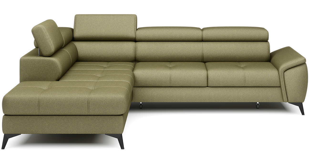 Das kompakte, äußerst bequeme und funktionelle Ecksofa Mocca ist eine ausgezeichnete Wahl für kleinere Wohnzimmer. Die Schlaffunktion ermöglicht es Ihnen, sich sowohl tagsüber als auch nachts zu entspannen, und die in der Ottomane versteckte Aufbewahrungsbox ist ein idealer Platz für zusätzliches Bettzeug. Mocca steht auf schwarzen Metallkufen, die den modernen Stil dieses Möbelstücks unterstreichen.
