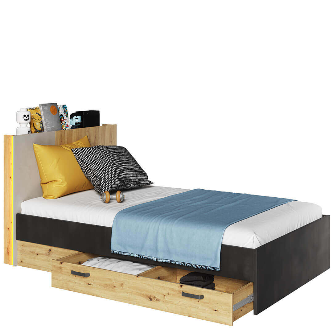 Der Bettkasten ist in der Farbe Rohstahl gestaltet, das Kopfteil wurde zwischen dem warmen Farbton des holzähnlichen Dekors und Hellgrau aufgeteilt. Diese Kombination macht das Möbelstück sehr modern, aber auch universell – es eignet sich sowohl für Mädchen- als auch für Jungenzimmer.