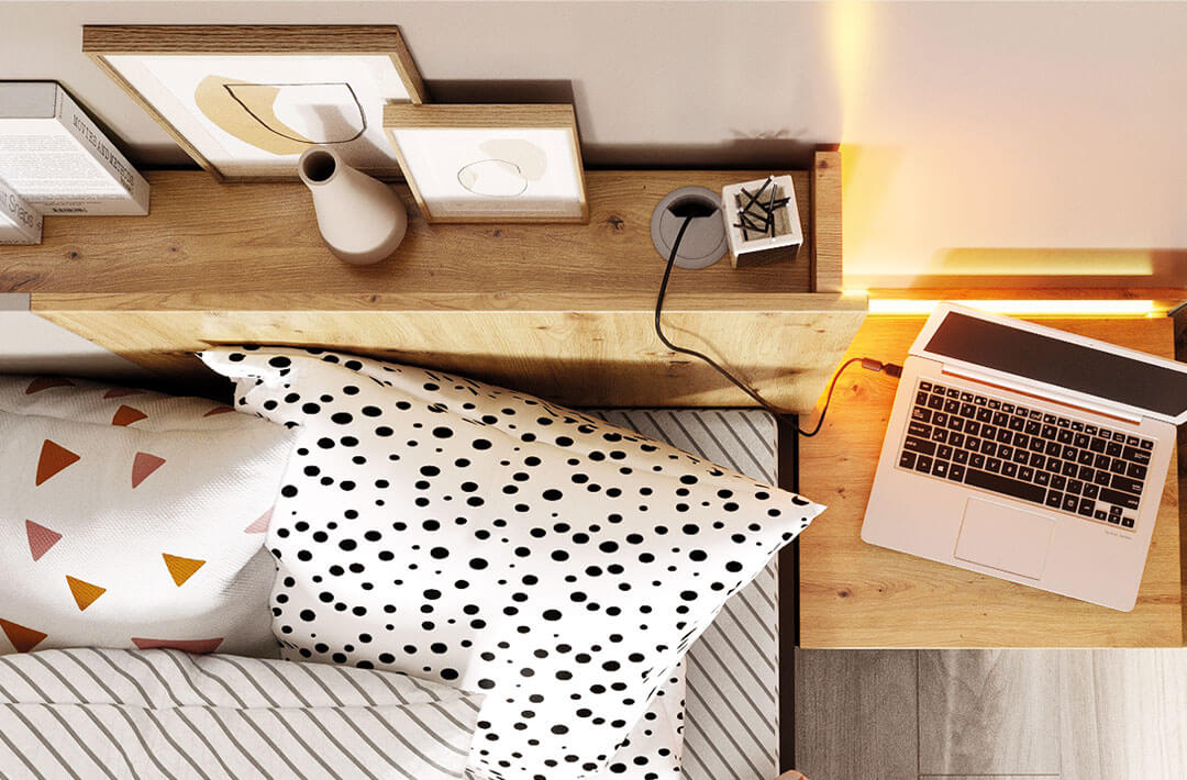 Die hohe Kopfstütze bietet bequemen Halt, ist aber auch sehr funktionell. Darin befindet sich ein Regal, in dem Sie Bücher, Schmuck und praktische Kosmetika aufbewahren können. Kabelablauflöcher haben Kabel, z.B. vom Ladegerät, jederzeit unter Kontrolle. Die Kopfstütze verfügt über eine LED-Beleuchtung, die den Stil der Möbel unterstreicht, aber auch als Nachttischlampe verwendet werden kann.