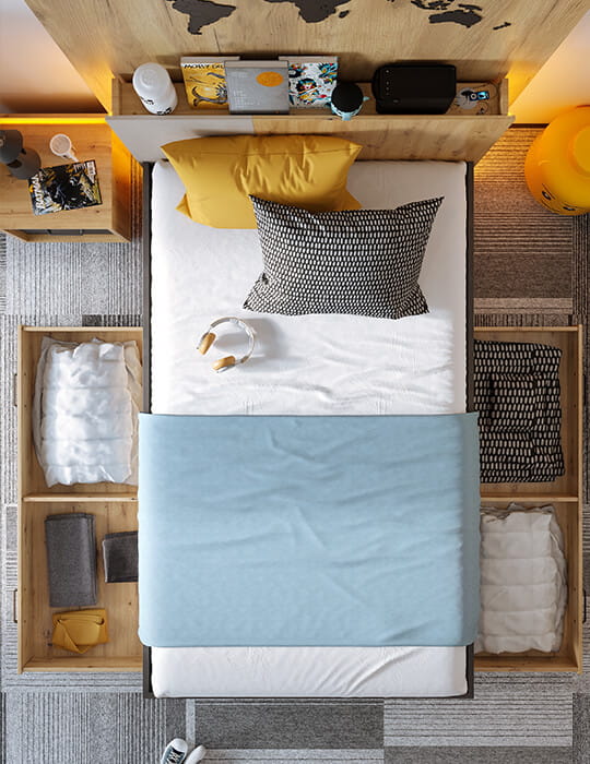 Ein breites Einzelbett unter einer 120 mm breiten Matratze, ein Sprossenrahmen und die Möglichkeit, eine beliebige Matratze zu wählen, sorgen für maximalen Schlafkomfort. Das Bett hat zwei Schubladen für Bettwäsche auf beiden Seiten des Bettes.