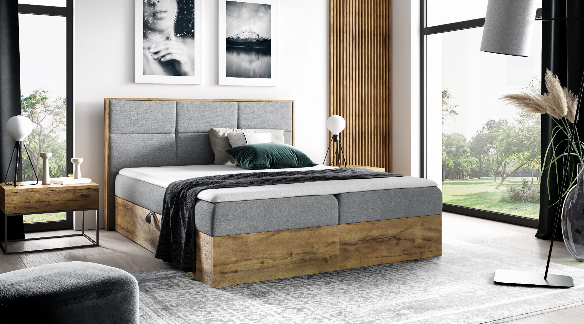 Machen Sie keine Kompromisse beim Schlafkomfort, auch wenn der Platz begrenzt ist! Das Boxspringbett WOOD II in der Größe 120x200 cm ist die ideale Wahl für anspruchsvolle Singles oder als luxuriöses Jugendbett. Dieses elegante kontinentale Bett bringt das begehrte 5-Sterne-Gefühl direkt in Ihr Zuhause. Das markante, 103 cm hohe Kopfteil mit seiner raffinierten Steppung zieht sofort alle Blicke auf sich. Perfekt ergänzt wird der edle Stoffbezug durch stilvolle Applikationen aus kratzfester, laminierter Möbelplatte im trendigen Dekor Eiche Wotan.