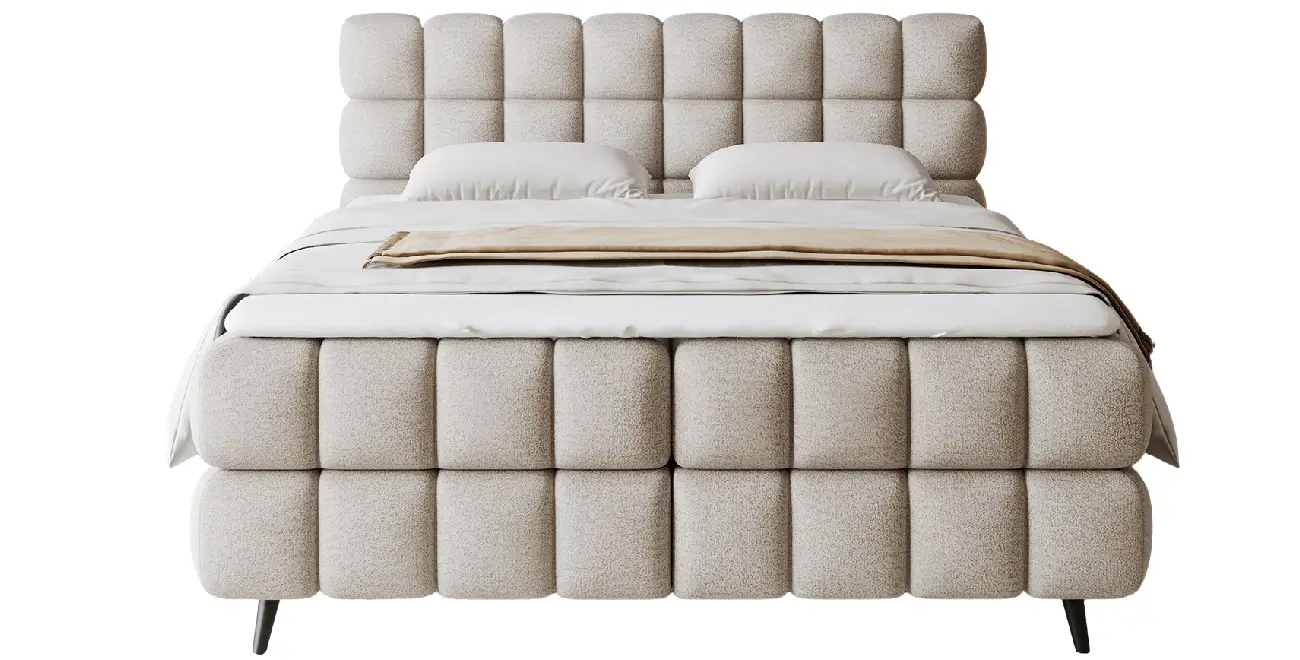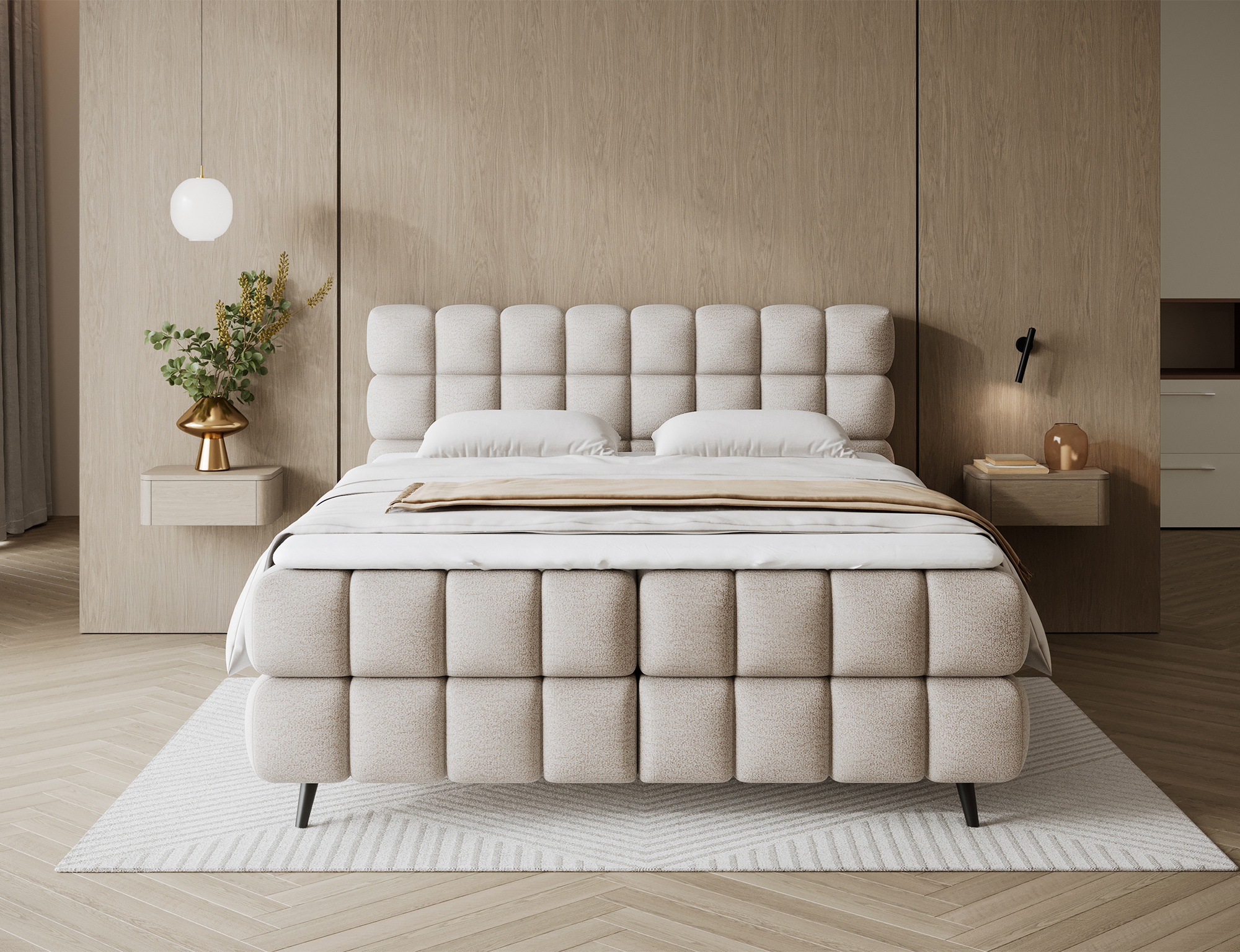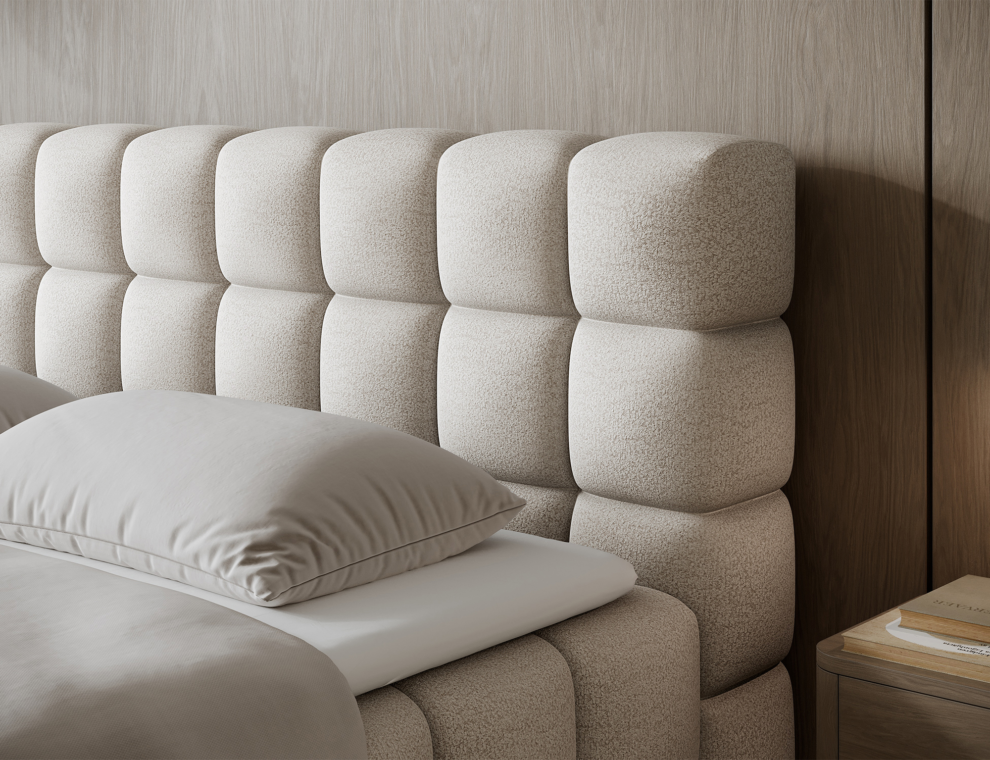 Das Boxspringbett MELLOW ist mehr als nur ein Schlafplatz – es ist ein Synonym für modernen Komfort und Gemütlichkeit. Charakteristisch für dieses Modell ist die angesagte Bubble-Optik (symmetrische Würfel-Steppung), die perfekt mit den trendigen Bouclé-Stoffen (Kollektionen Royal und Tonall) harmoniert. Die weiche, knotige Struktur dieser Stoffe verleiht dem Bett eine außergewöhnliche, wolkenartige Haptik. Das Bett MELLOW verbindet Ästhetik mit Funktionalität, da es als komplettes Schlafsystem über zwei geräumige Bettkästen und einen hohen Schlafkomfort verfügt.