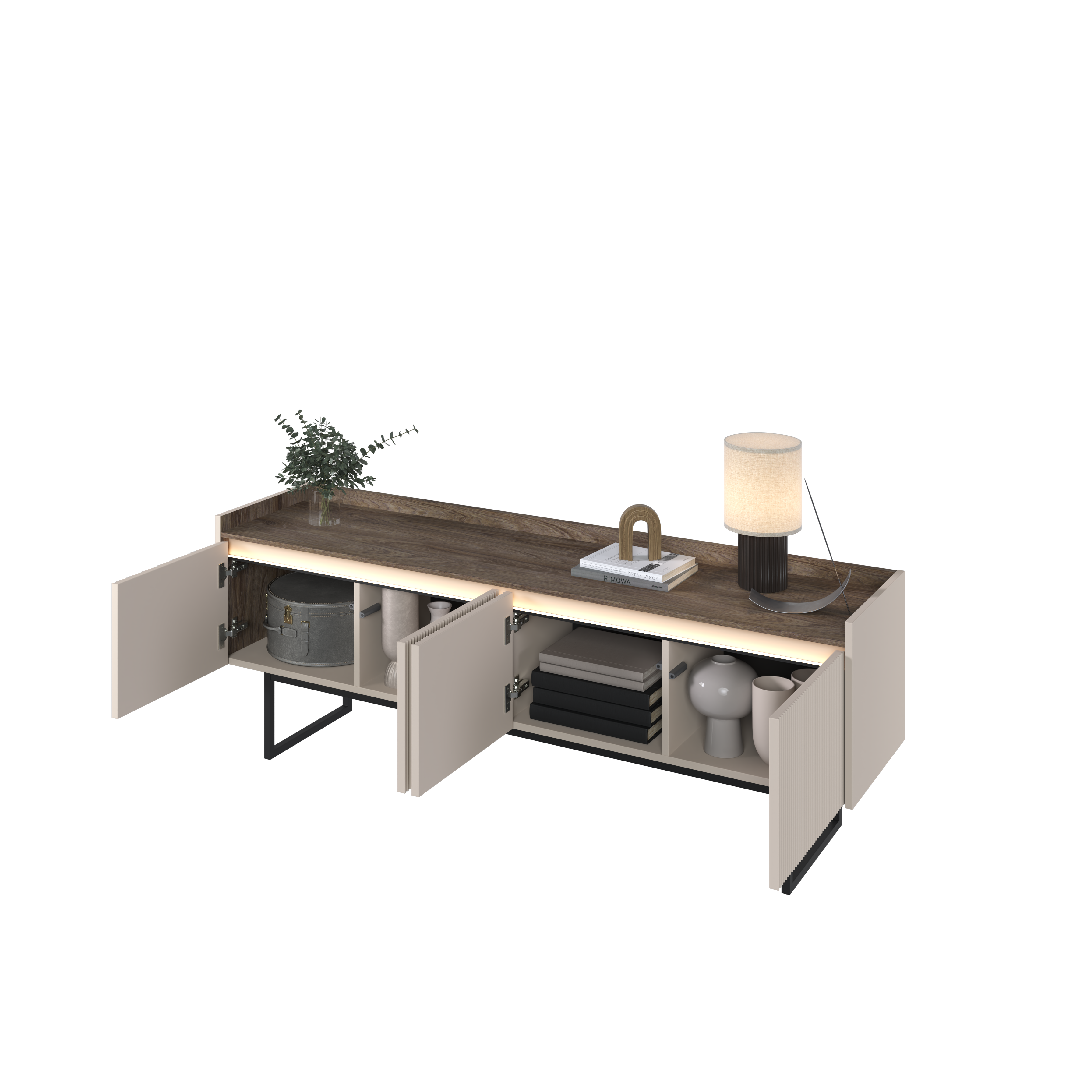 Verwandeln Sie Ihr Wohnzimmer in eine stilvolle Entertainment-Oase! Das TV-Lowboard LAGO (LG-05) vereint höchste Funktionalität mit zeitloser, moderner Eleganz. Der sanfte Farbton in Sandbeige bildet einen wunderschönen Kontrast zur markanten Deckplatte in dunkler Eichen-Optik. Die schlanken, schwarzen Metallbeine verleihen dem TV-Tisch eine schwebende Leichtigkeit, die perfekt zu modernen Bildschirmen passt. Das absolute Highlight: Die integrierte LED-Hintergrundbeleuchtung sorgt bei jedem Filmabend für eine herrlich stimmungsvolle Kino-Atmosphäre!