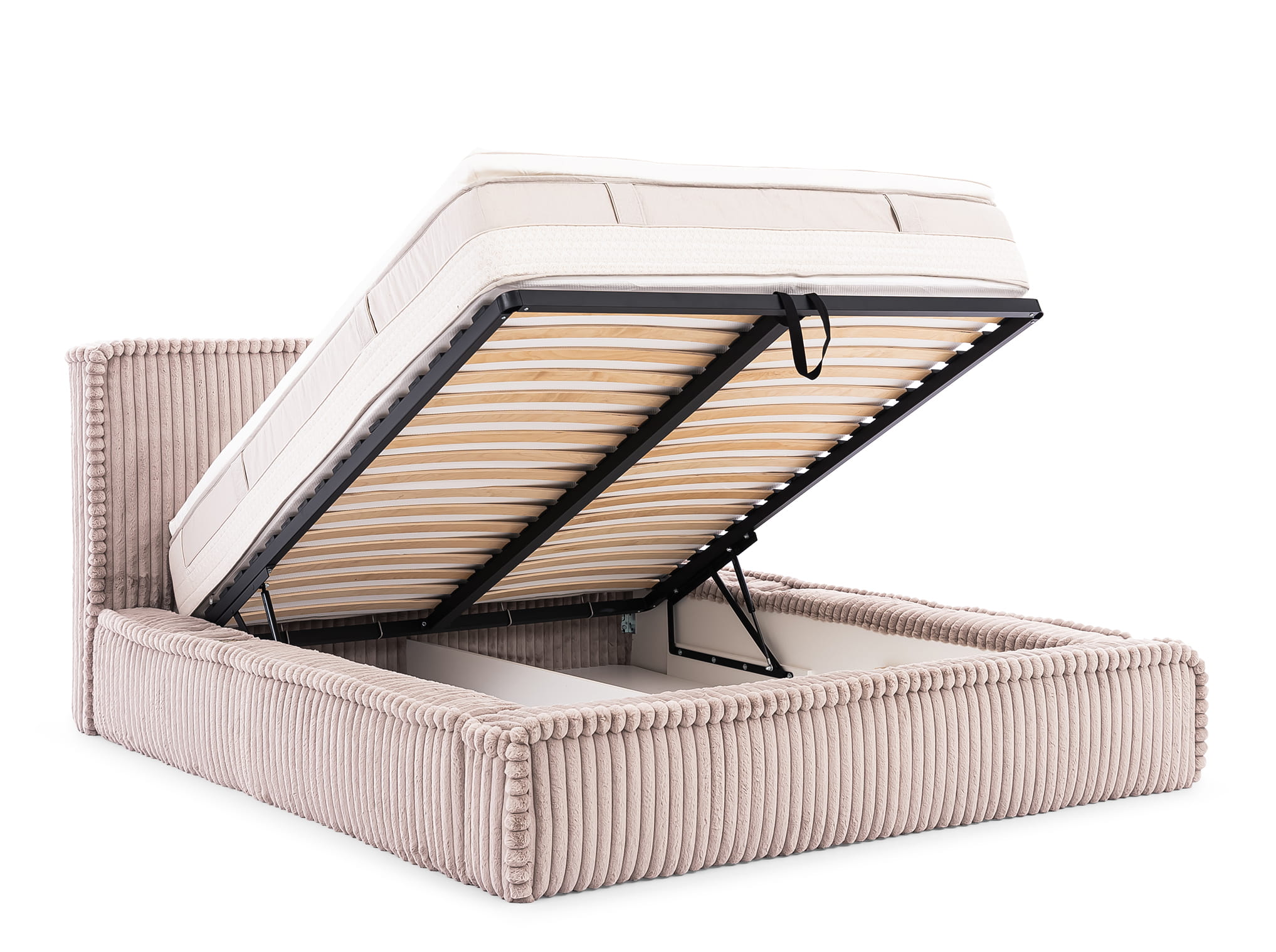 - Inklusive großem Bettkasten: Unter der gesamten Liegefläche verbirgt sich ein riesiger Stauraum, der sich mühelos öffnen lässt – perfekt für Kissen, Decken oder saisonale Kleidung.