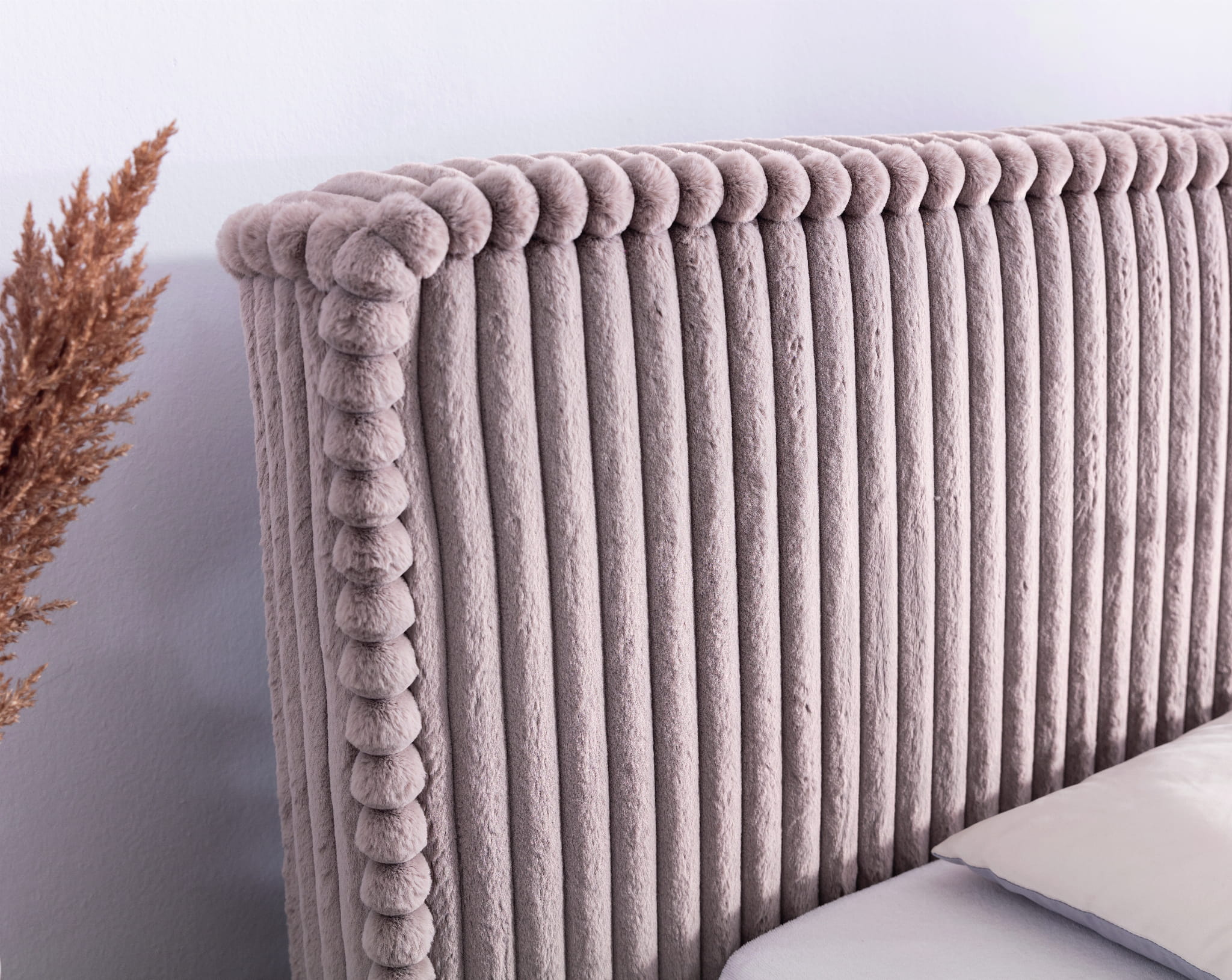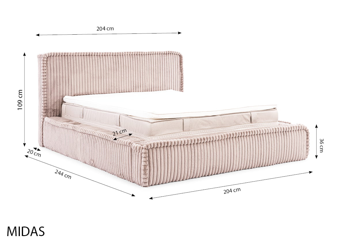 Verwandeln Sie Ihr Schlafzimmer in eine luxuriöse Wohlfühloase! Das großzügige Polsterbett MIDAS kombiniert modernes Design mit herausragendem Komfort. Der absolute Blickfang ist der edle Bezug aus dem innovativen Stoff Vito: Ein einzigartiges Gestrick mit breiten Streifen, die an groben Cord erinnern. Der dichte Flor mit seiner pelzigen Textur lädt zum Entspannen ein und verleiht Ihrem Zuhause eine behagliche, luxuriöse Atmosphäre. Das ideale Doppelbett für Paare, die Wert auf Design und Komfort legen.