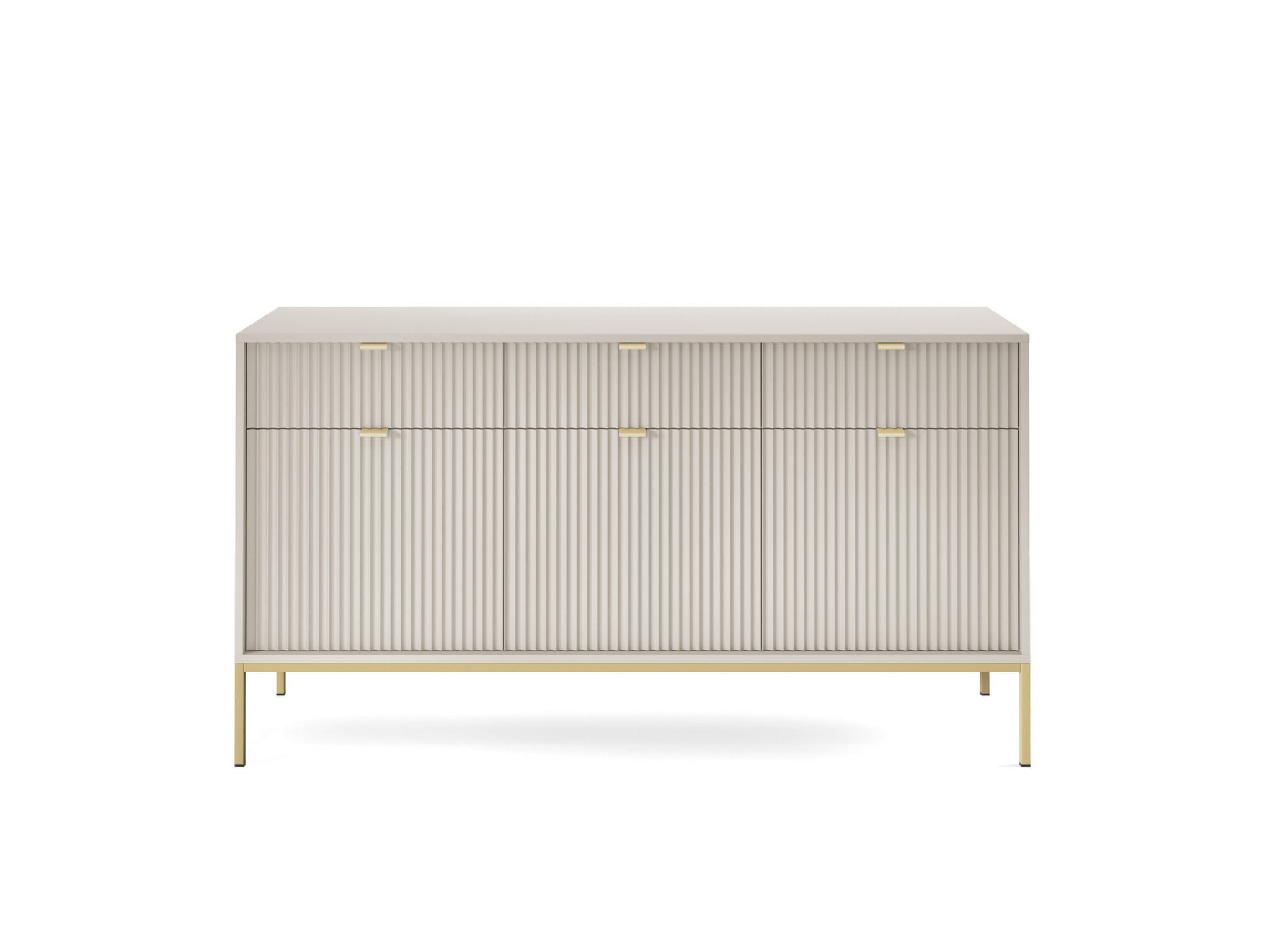 Entdecken Sie die Kollektion NOVA, die modernes Design mit hoher Funktionalität meisterhaft verbindet. Diese breite Kommode (Sideboard) besticht durch ihre dekorativ gefrästen Fronten (Riffeloptik), die im Wohn- oder Esszimmer für einen echten Blickfang sorgen. Das stabile Metallgestell verleiht dem massiven Möbelstück optische Leichtigkeit. Mit ihrer Breite von 154 cm bietet sie enorm viel Stauraum und eine großzügige Ablagefläche für Dekorationen.