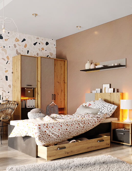 Eine interessante Farbkombination aus einem dezenten Grau und einem warmen, holzähnlichen Dekor macht dieses Möbelstück universell und passt perfekt in die Einrichtung von Mädchen und Jungen. Der moderne Charakter der Karosserie wird durch die ursprünglich unter die Karosserie geschobenen Fronten der Türen, formschöne Metallgriffe und niedrige Stützen betont.