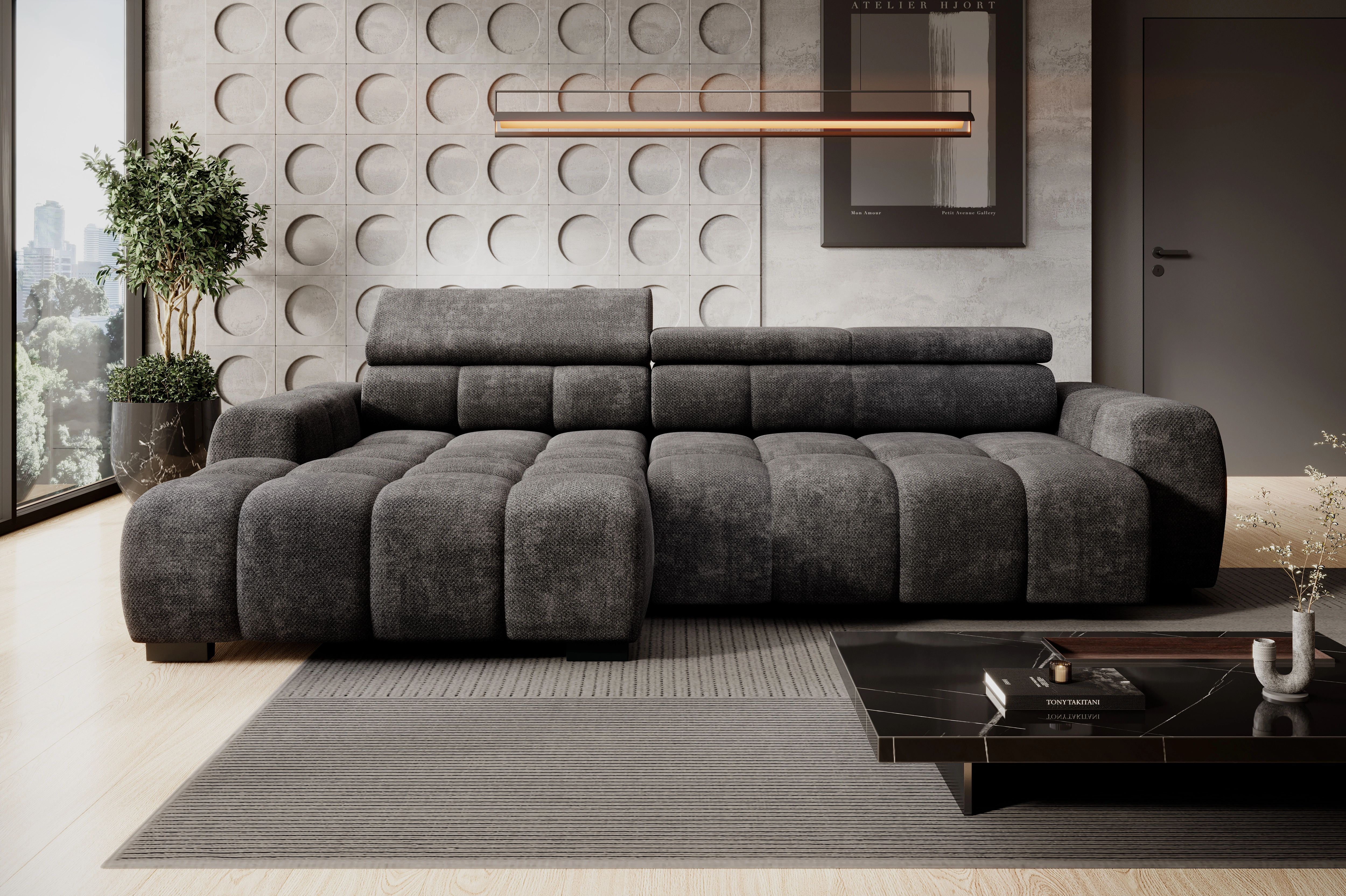 Bringen Sie ausdrucksstarkes Design in Ihr Zuhause, selbst wenn der Platz etwas begrenzter ist! Das Ecksofa BULL S ist ein echtes Statement-Piece, das sich durch seine markante Linienführung und eine kompromisslos moderne Formensprache auszeichnet. Die massive Silhouette und die besonders breiten, dominanten Armlehnen verleihen dem Sofa einen starken Charakter, der sofort die Blicke auf sich zieht. Es ist das perfekte Möbelstück für alle, die großzügigen Komfort mit einer Prise Industrial- oder Loft-Charme verbinden möchten.