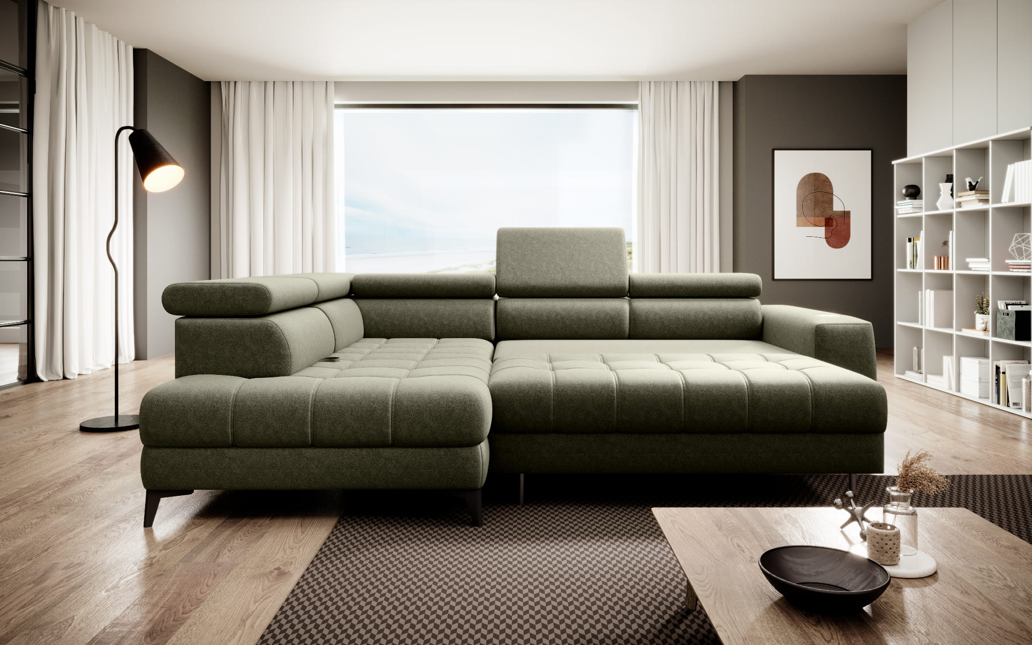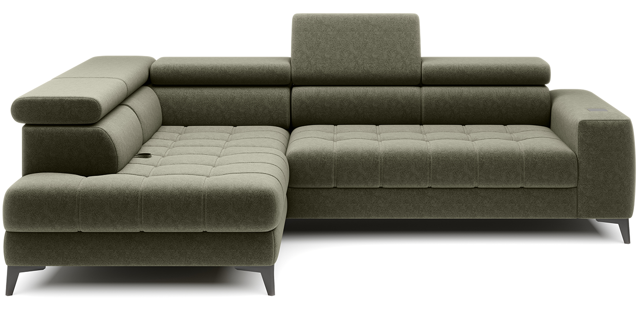 Ein elegantes und funktionelles Ecksofa, das eine perfekte Ergänzung für jedes Wohnzimmer ist. Die schlichte Linienführung und die feinen Nähte lassen das Möbelstück besonders eindrucksvoll aussehen. Astola ist mit beweglichen Kopfstützen ausgestattet, die es Ihnen ermöglichen, das Sofa an Ihre individuellen Bedürfnisse anzupassen. Dank seiner Schlaffunktion ist es sowohl für die Tages- als auch für die Nachtruhe geeignet. In einem großen Behälter, der in der Ottomane des Möbels versteckt ist, kann zusätzliches Bettzeug untergebracht werden. Das Induktionsladegerät, das sich in der Armlehne befindet, ist sicherlich eine zusätzliche Bereicherung für das Ecksofa.