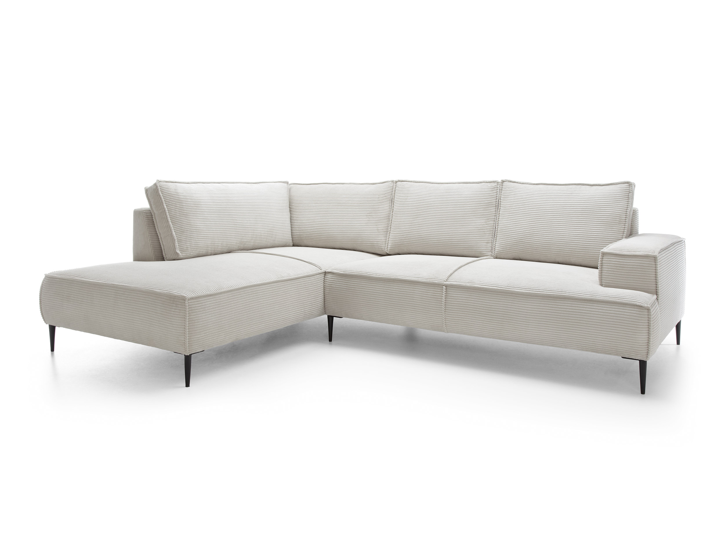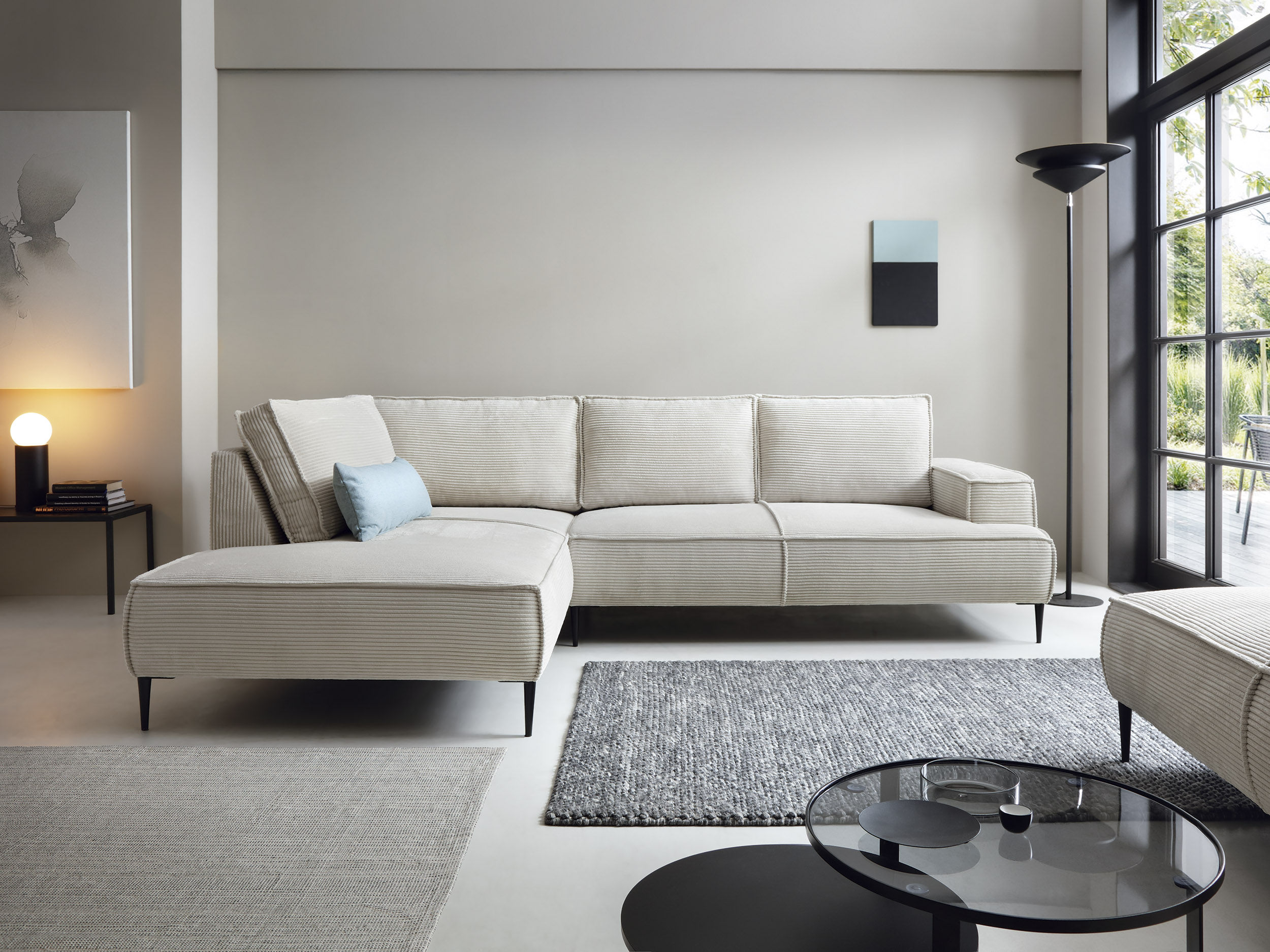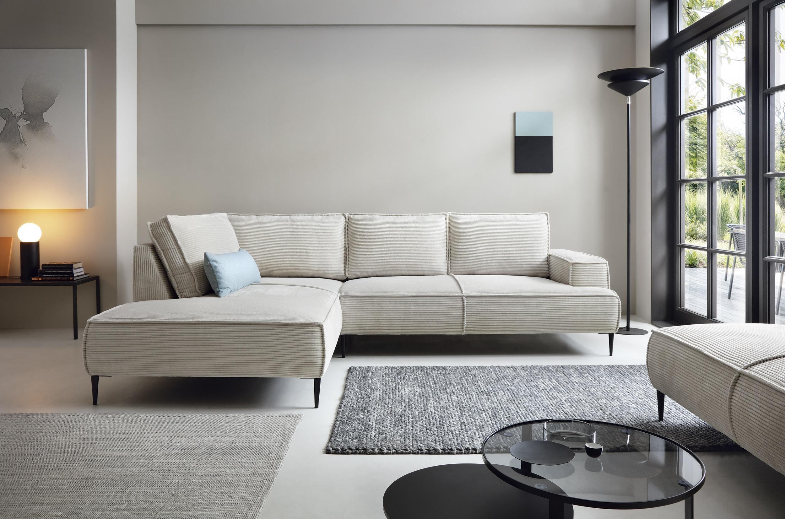 Ambience ist ein Cordstoff (Rippenvelours) mit ausgeprägter Rippenstruktur und angenehm weicher Haptik. Er verleiht dem Sofa eine warme, elegante Optik und ist zugleich robust für den täglichen Gebrauch.