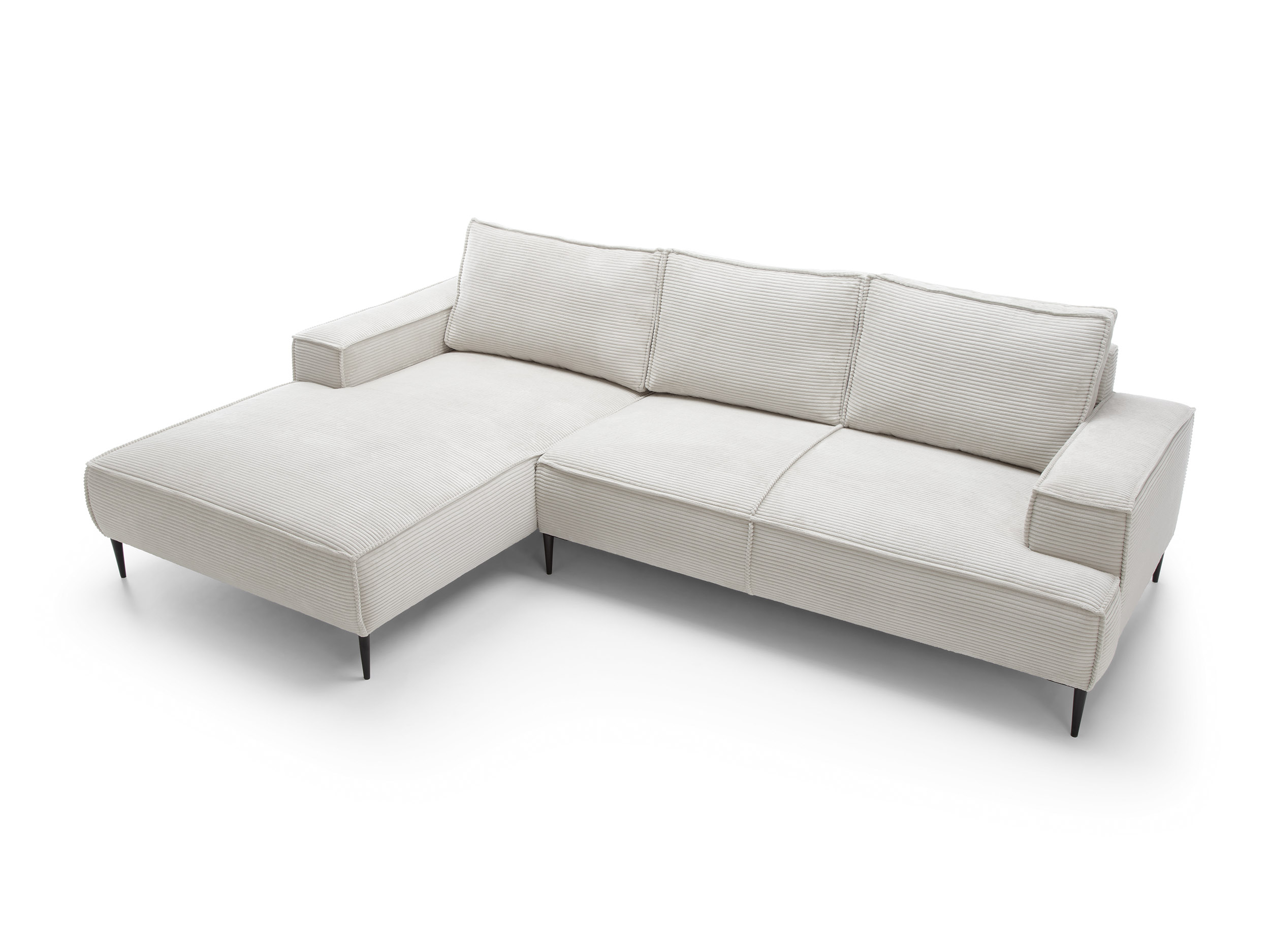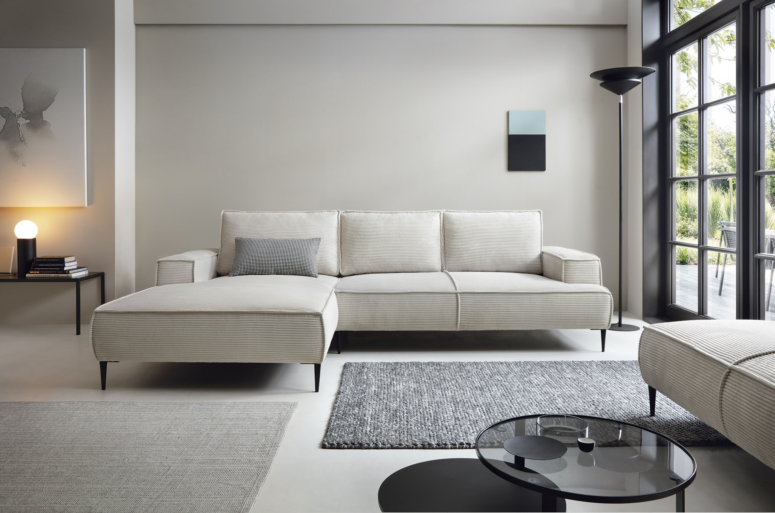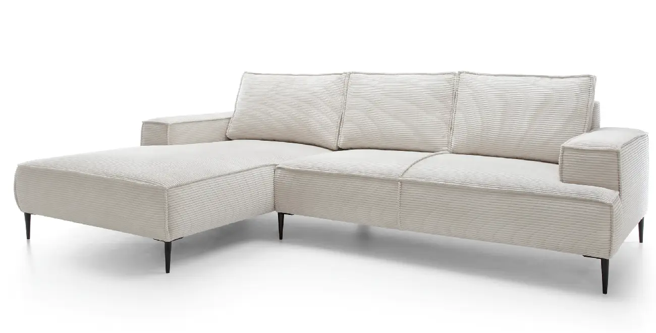 Ambience ist ein Cordstoff (Rippenvelours) mit ausgeprägter Rippenstruktur und angenehm weicher Haptik. Er verleiht dem Sofa eine warme, elegante Optik und ist zugleich robust für den täglichen Gebrauch.