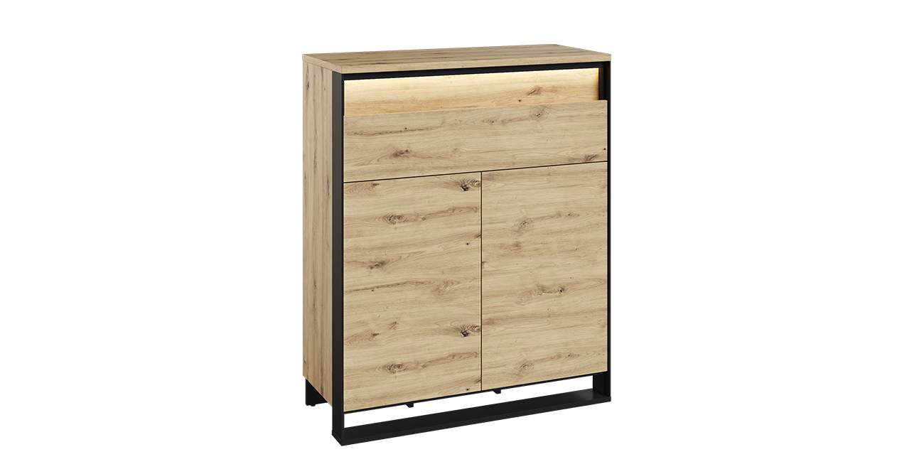 Sind Sie auf der Suche nach einem funktionalen und zugleich stilvollen Möbelstück für Ihren Eingangsbereich? Die geräumige Flurkommode aus der Kollektion QUANT ist die perfekte Lösung für einen perfekt organisierten Flur. Die warme Holzoptik in Artisan Eiche, kombiniert mit markanten schwarzen Details und dem 3D-Effekt der Fronten, verleiht Ihrem Interieur einen eleganten Loft-Charakter. Die integrierte, stimmungsvolle LED-Beleuchtung sorgt zudem für einen warmen Empfang, sobald Sie Ihr Zuhause betreten.