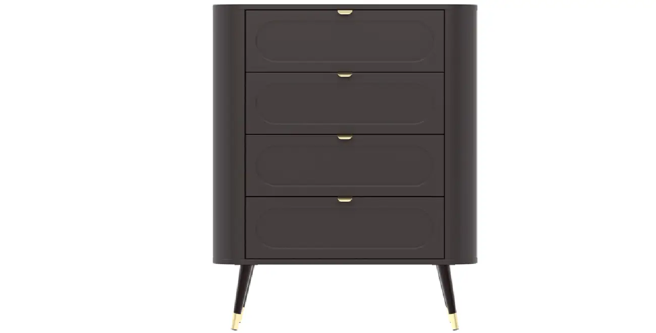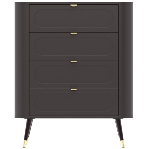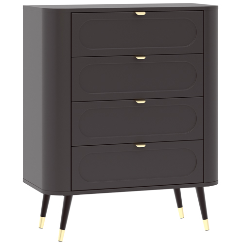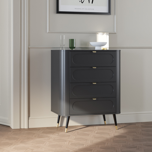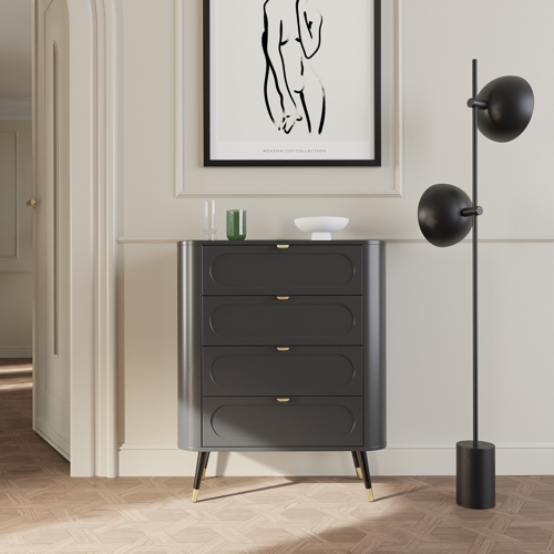 Verleihen Sie Ihrem Interieur einen Hauch von purem Luxus! Die Kommode Blinx in tiefem, elegantem Schwarz ist ein wahres Design-Statement, das sofort alle Blicke auf sich zieht. Mit ihren kunstvollen Fronten im Ellipsen-Design (ovale Fräsungen) und den sanft abgerundeten Seiten durchbricht sie die Strenge klassischer Möbel. Die Kombination aus vier geräumigen Schubladen, filigranen Metallfüßen mit goldenen Akzenten und edlen Griffen macht sie zum perfekten Möbelstück für Liebhaber moderner, stilvoller Interieurs.