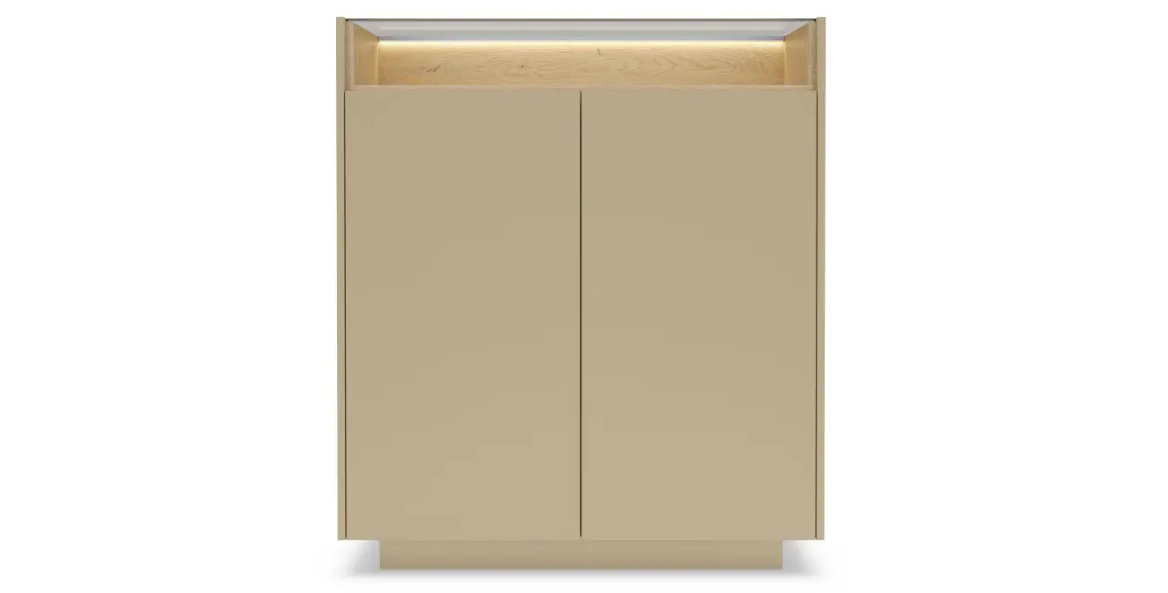 Verleihen Sie Ihrem Wohnraum eine exklusive Note mit dem Highboard HIRO A. Dieses 2-türige Möbelstück besticht durch sein klares, griffloses Design und eine faszinierende Farbkombination aus warmem Kakao, Eiche Cremona (Korpus) und sanftem Beige (Fronten). Ein besonderes Highlight ist die offene Nische mit einer stilvollen Glasablage (braunes gehärtetes Glas), die durch die inkludierte LED-Beleuchtung Ihre Lieblingsstücke perfekt in Szene setzt.