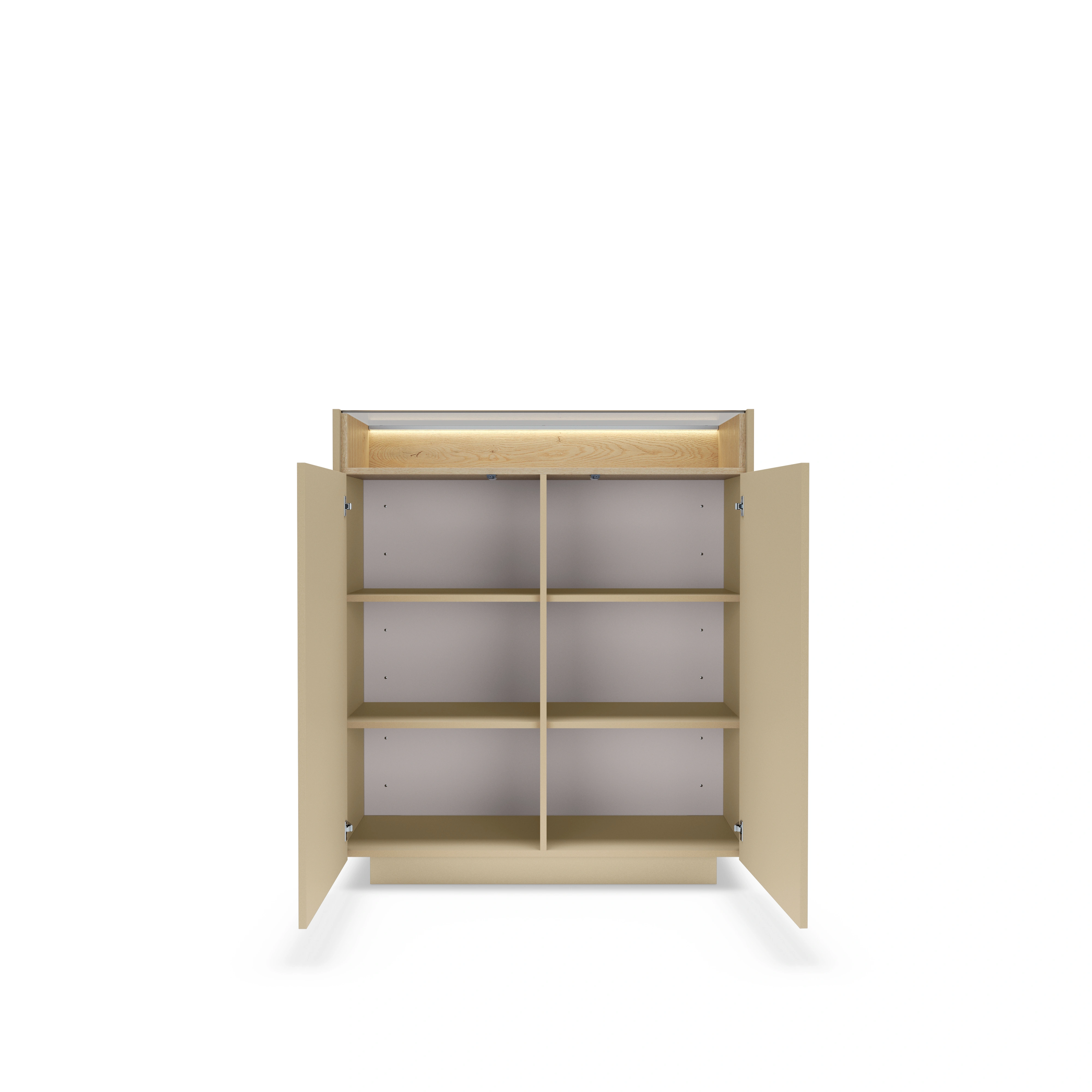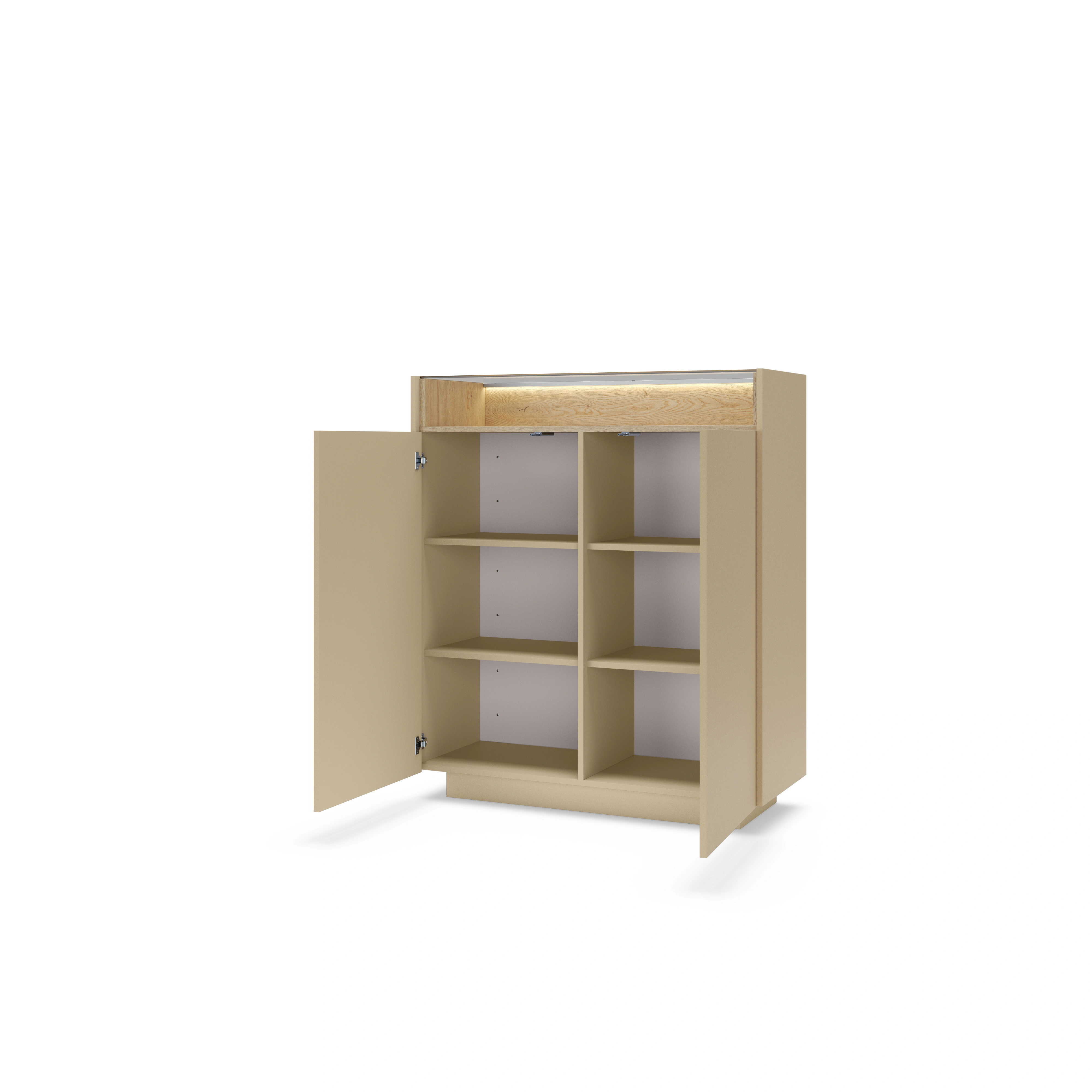 - Ausstattung: 2 Türen, 4 Einlegeböden, 1 offene Nische mit Glasboden, Push-to-Open-System, LED-Beleuchtung (neutralweiß)