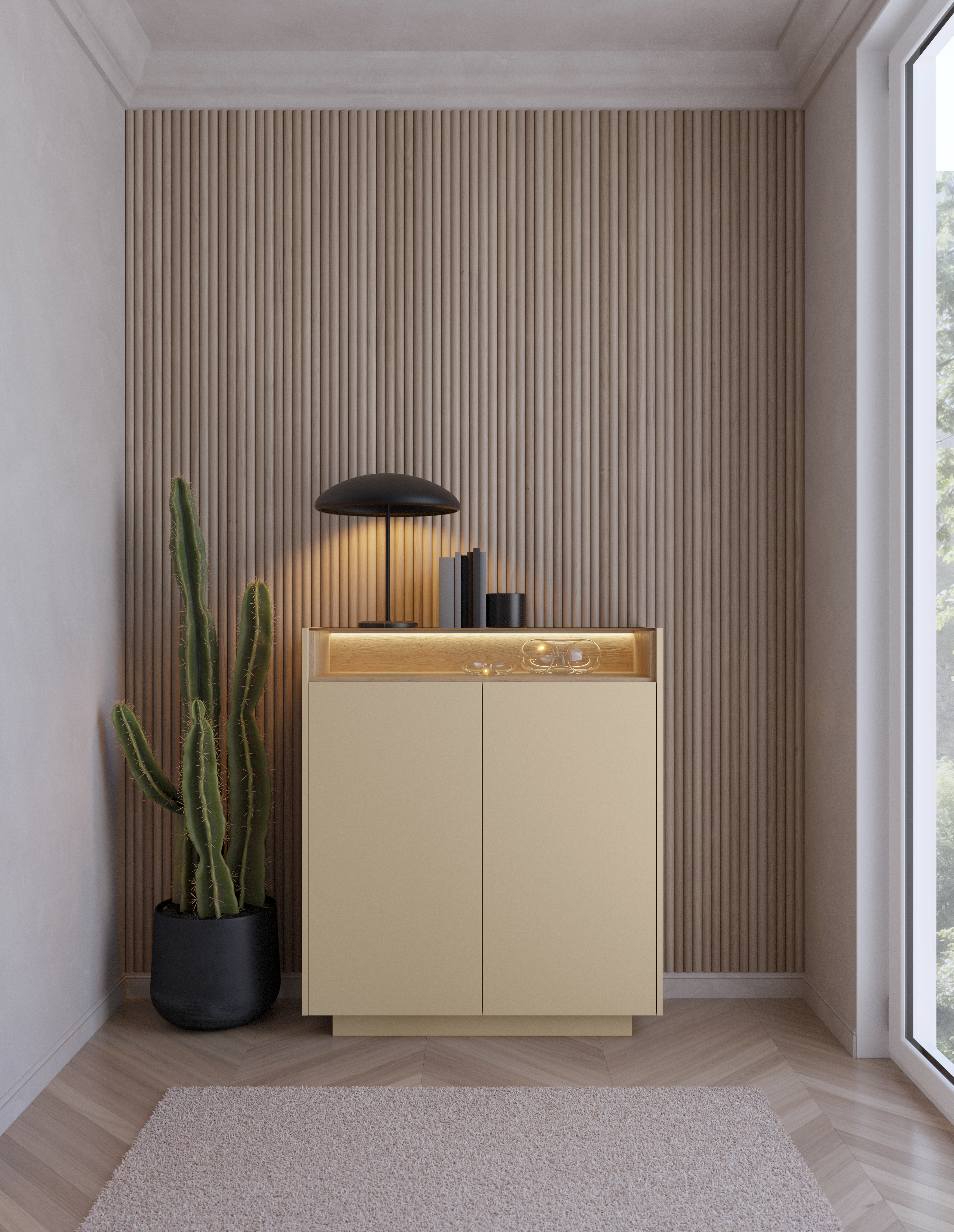 - Atmosphärisches Licht: Ein integriertes LED-Profil (neutralweiß) beleuchtet die Glasablage und schafft eine gemütliche Stimmung im Raum.
