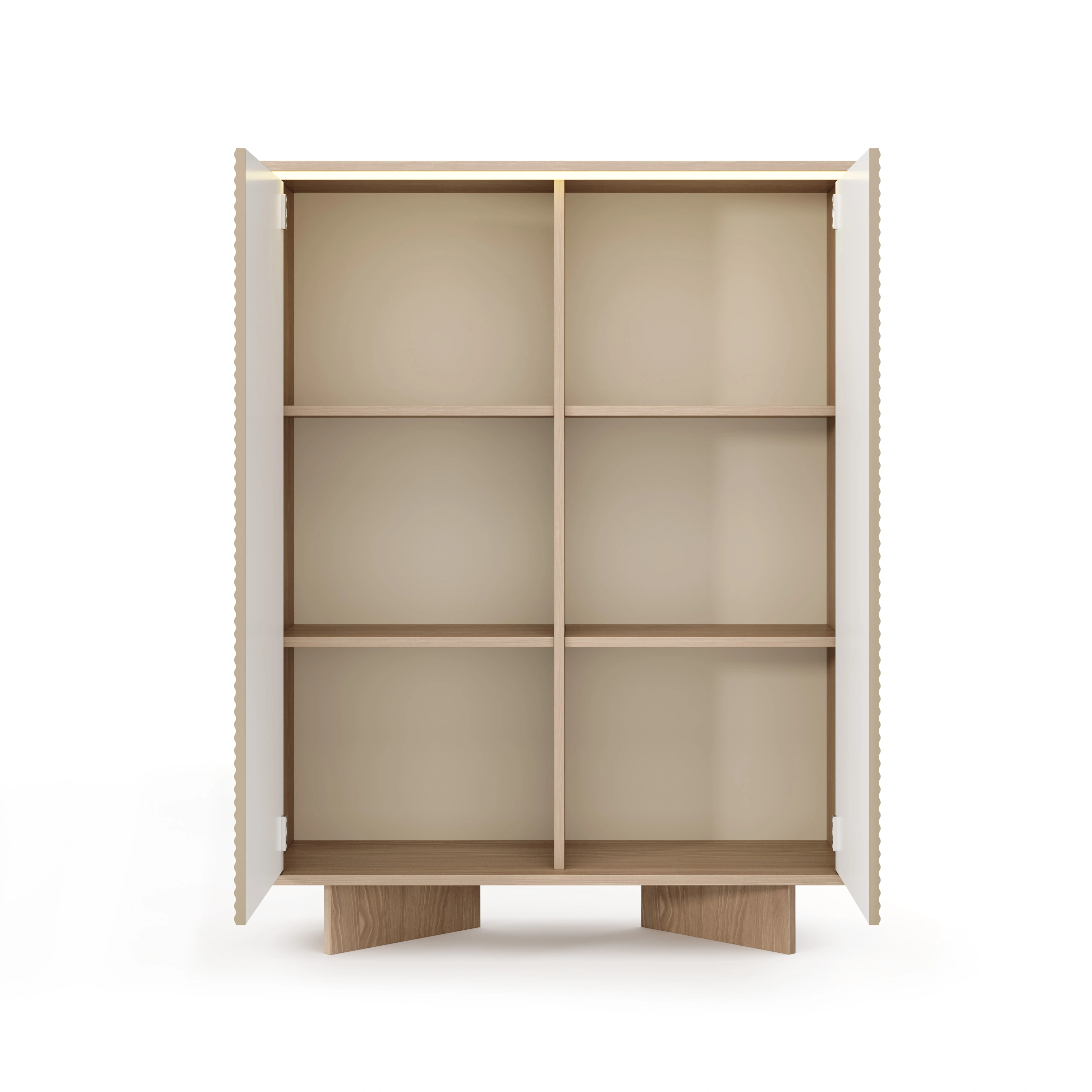 Entdecken Sie das Highboard SEMI – ein Meisterwerk modernen Möbeldesigns, das Ihrem Zuhause eine unvergleichliche Eleganz verleiht. Charakteristisch für diese 2-türige Hochkommode sind die horizontal geriffelten Fronten in der trendigen Farbe Cappuccino, die dem Möbelstück eine faszinierende Leichtigkeit und Originalität verleihen. Im harmonischen Kontrast dazu steht der Korpus in heller, warmer Holzoptik. Abgerundet wird das exklusive Erscheinungsbild durch ein einzigartiges, geometrisches Fußgestell.