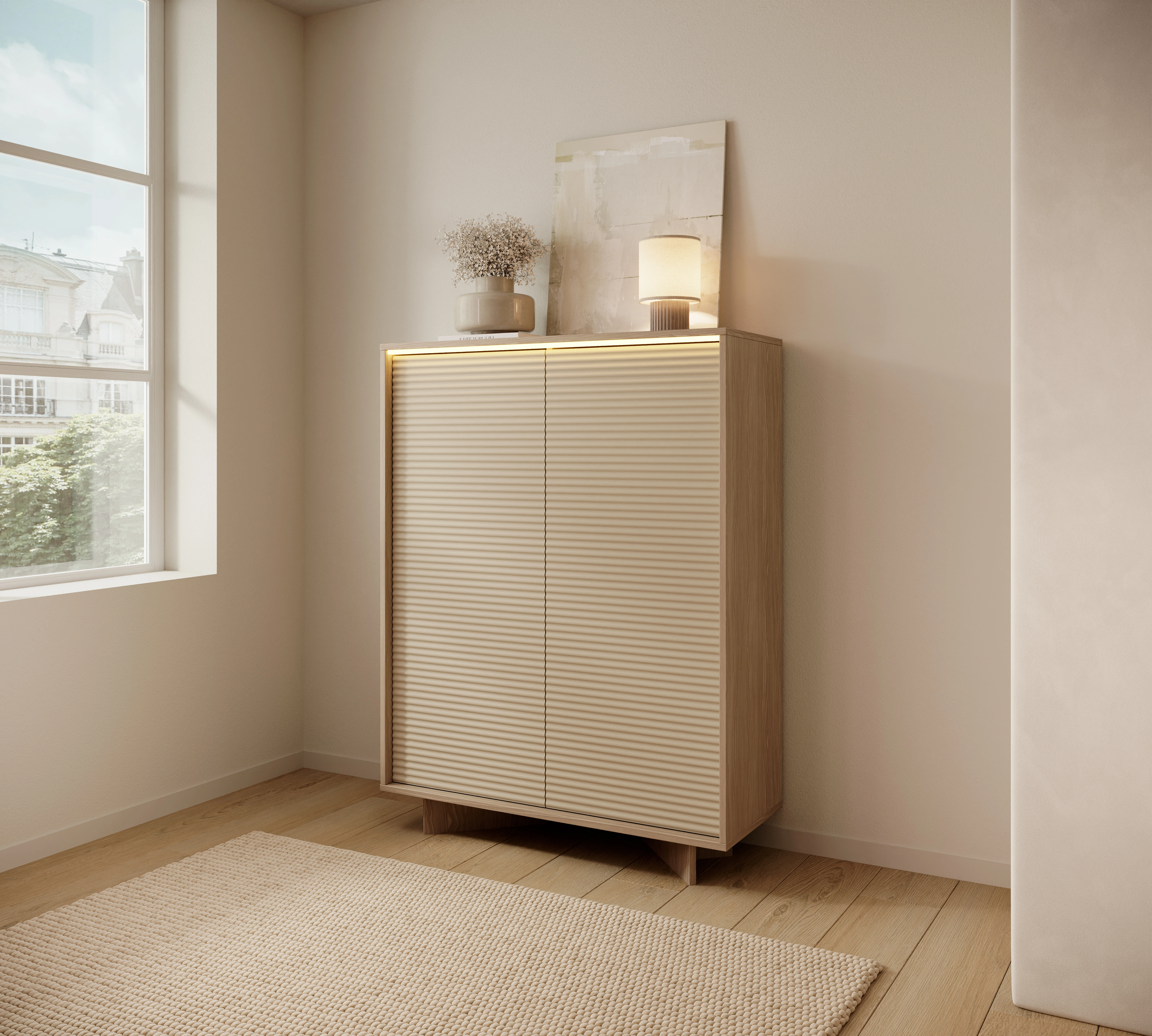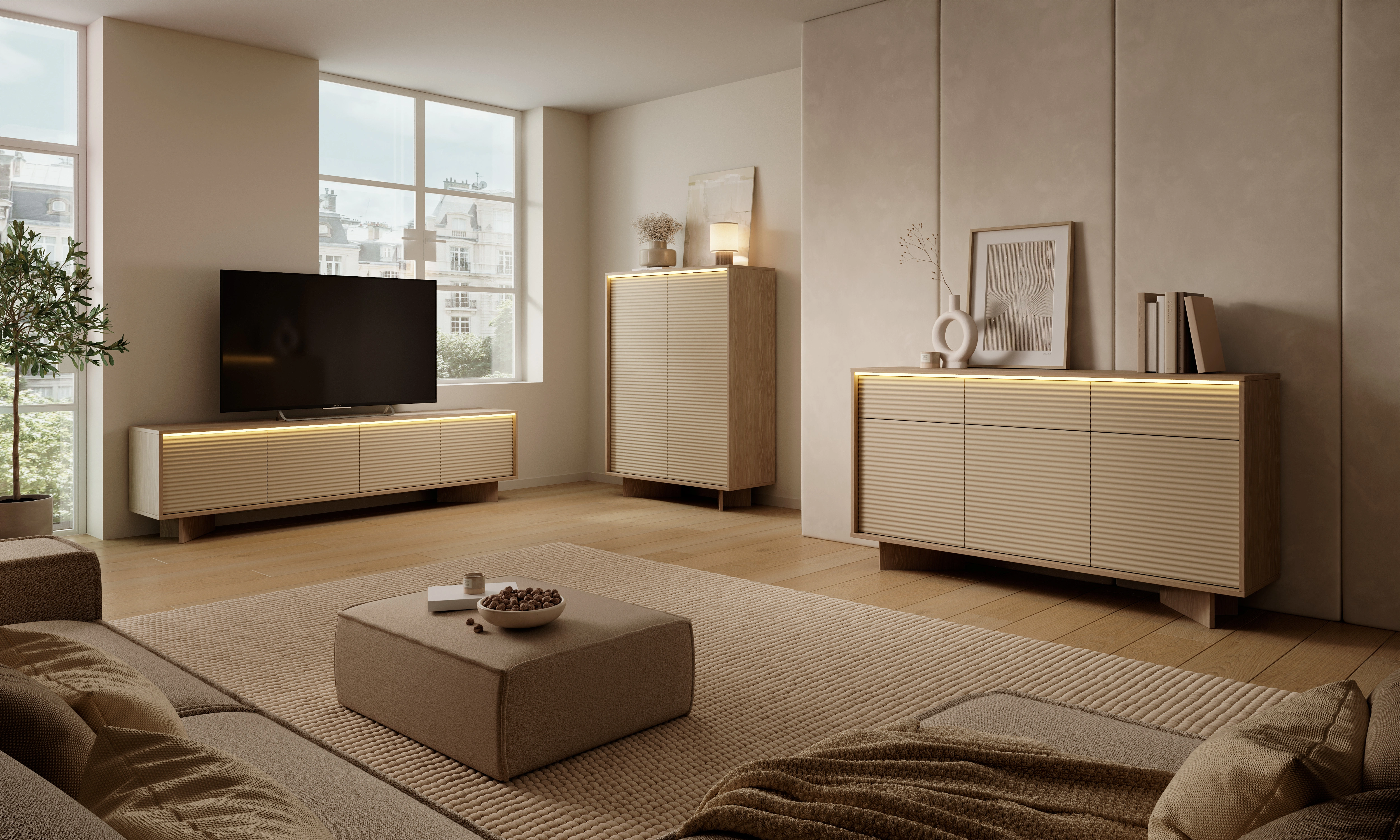 Design Highboard SEMI – Moderne Rillenoptik trifft auf atmosphärisches Licht