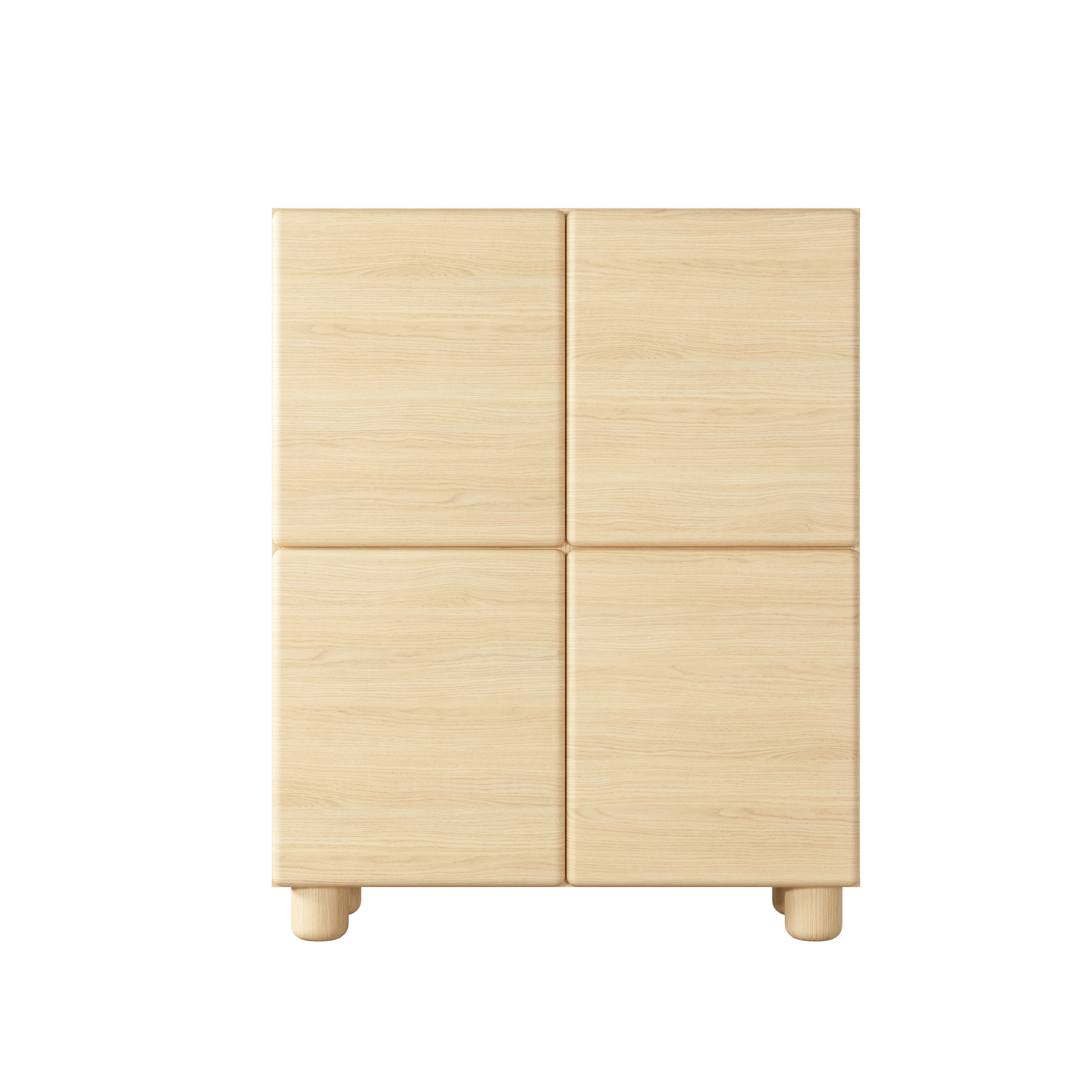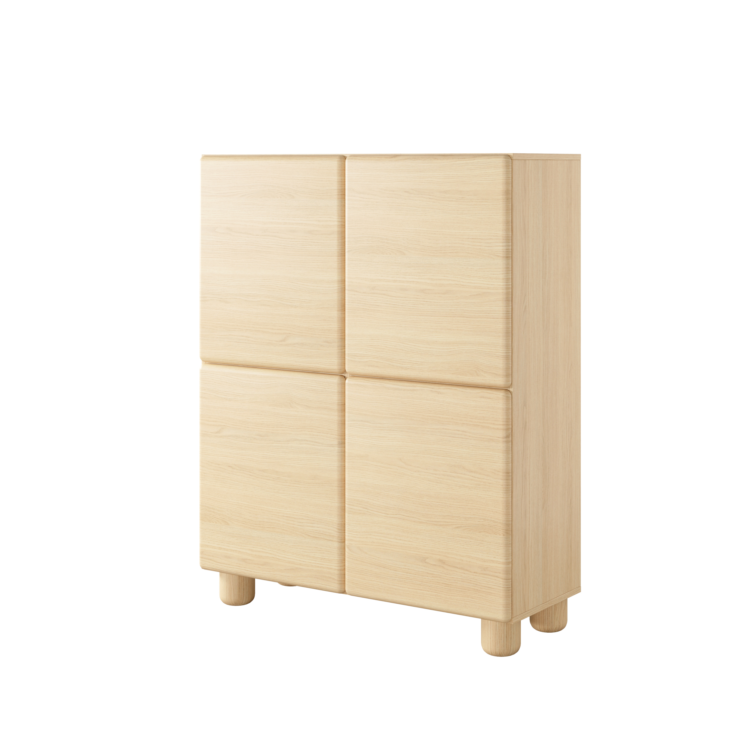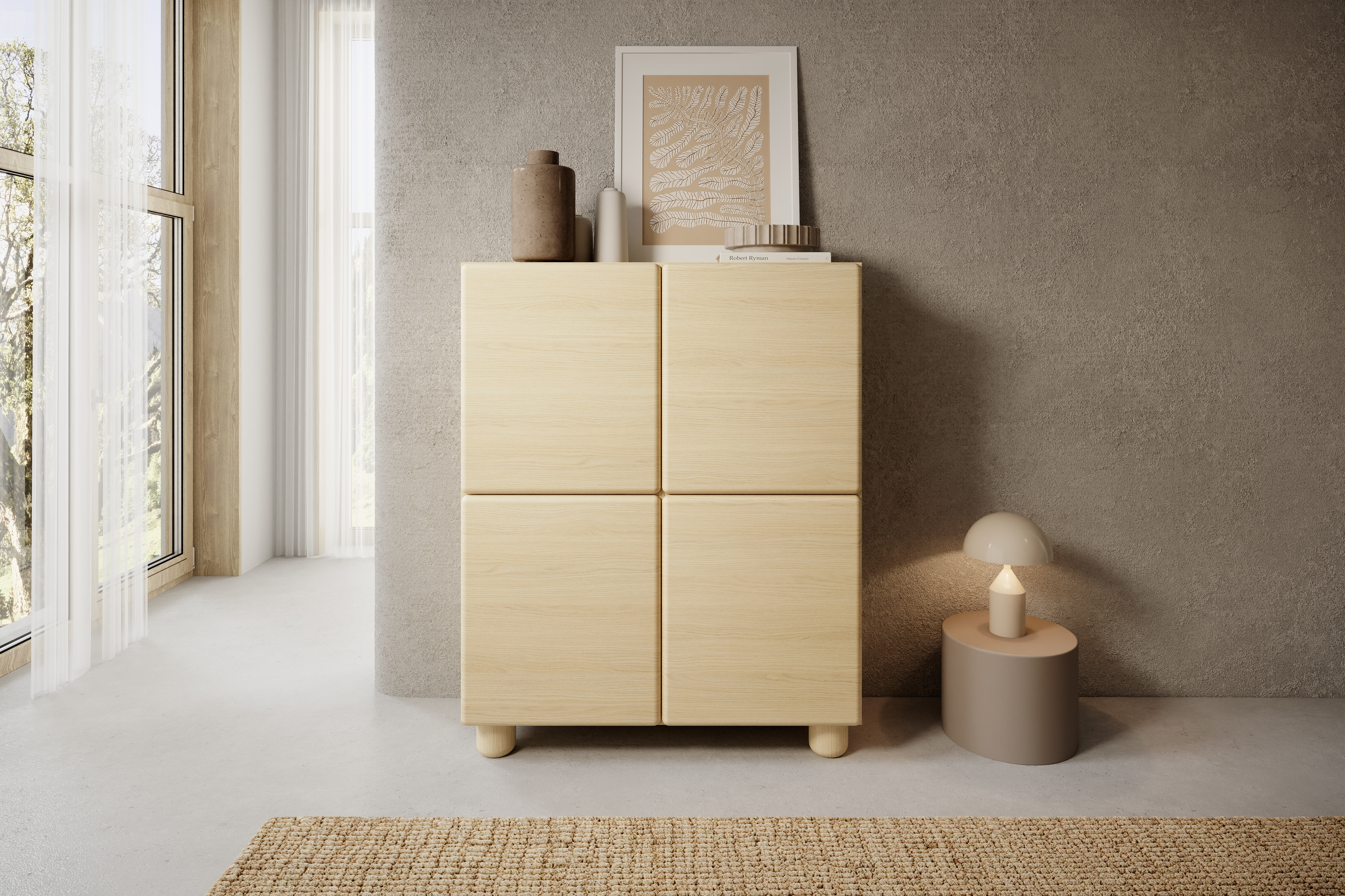 Bringen Sie pure Harmonie und Ruhe in Ihr Zuhause! Das atemberaubende Highboard LOMO ist ein echtes Meisterwerk des modernen Minimalismus. Es kombiniert eine weiche, organische Formgebung mit dem warmen, gemütlichen Farbton von hellem Holz. Die sanft abgerundeten Frontkanten und die markanten, zylinderförmigen Massivholzbeine verleihen der 4-türigen Kommode einen einzigartigen, fast skulpturalen Charakter. Perfekt für alle, die ein Möbelstück suchen, das den Raum nicht dominiert, sondern ihn stilvoll umarmt.