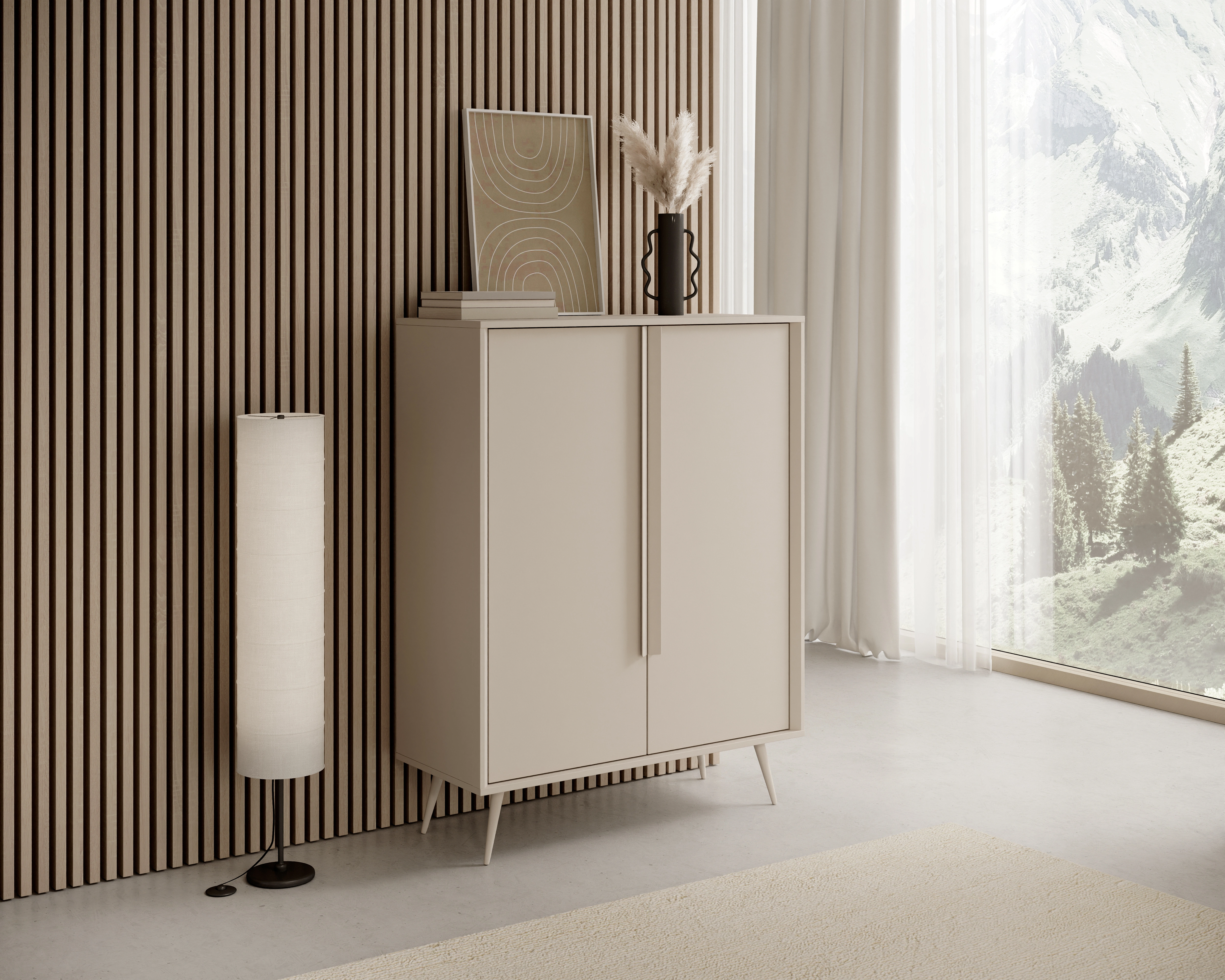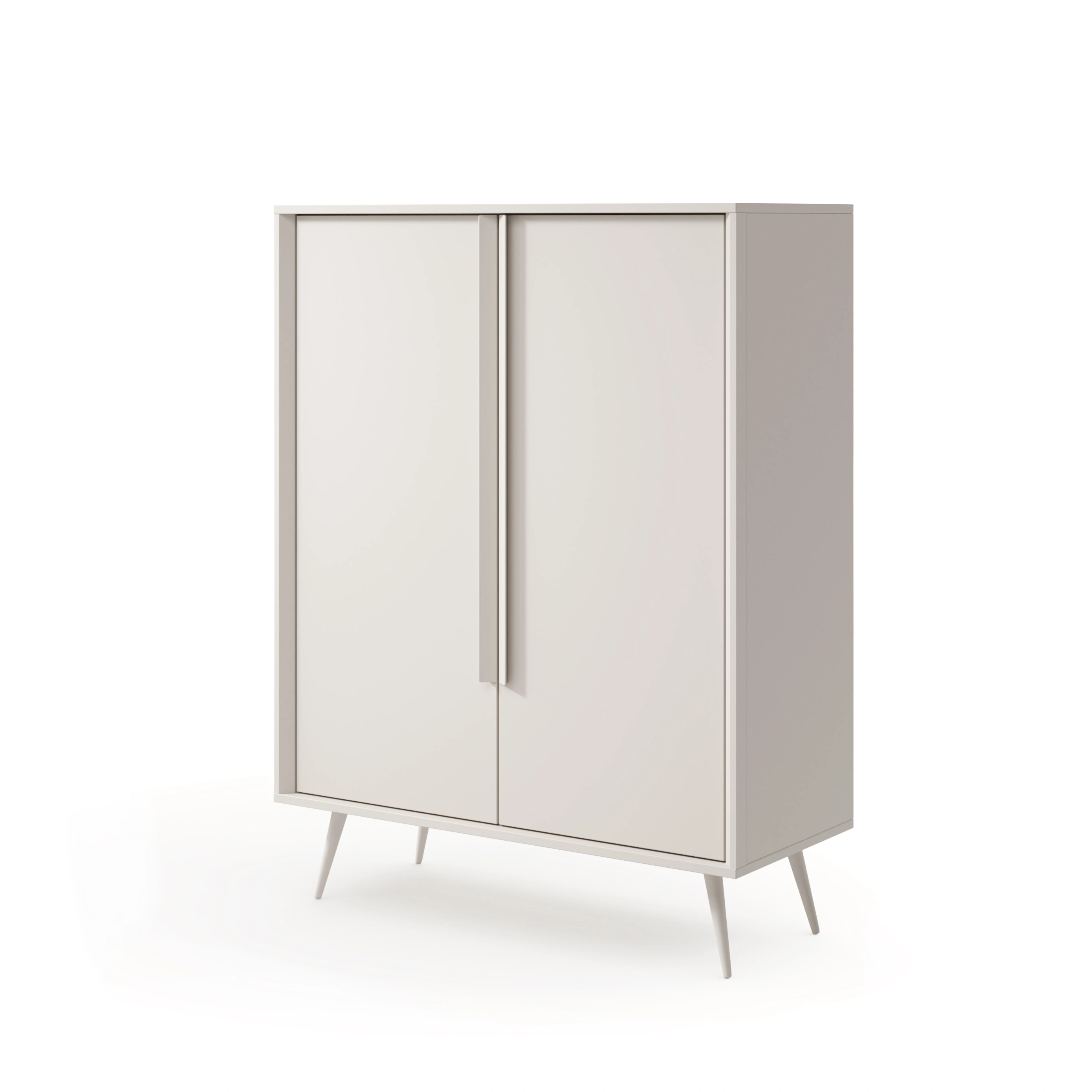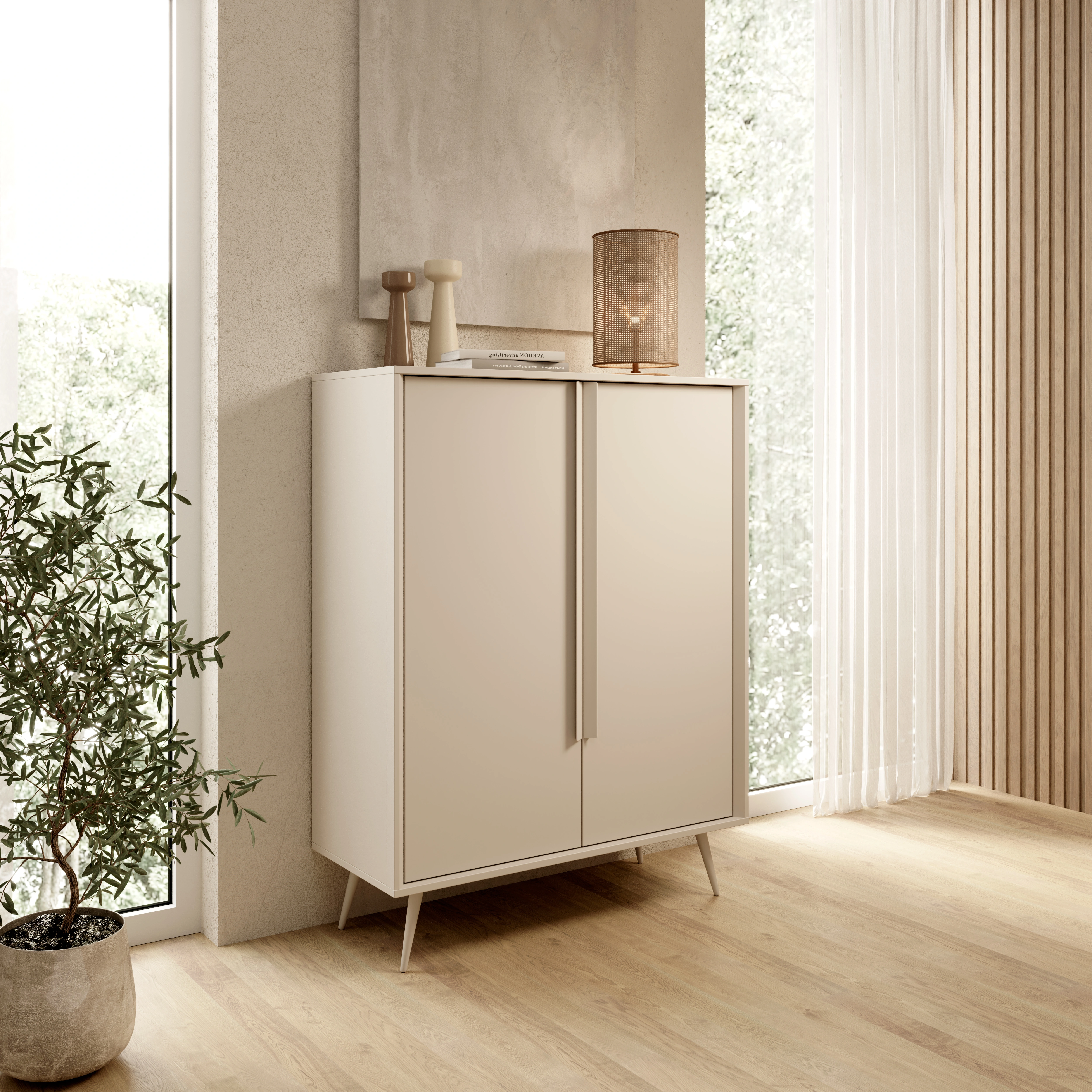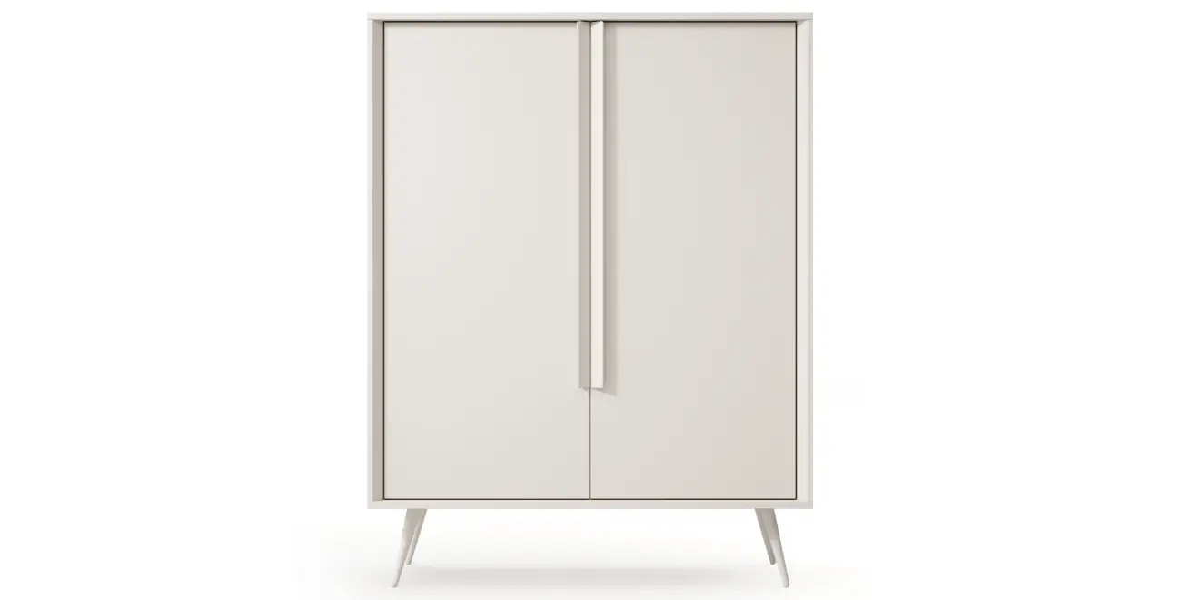 Die Kollektion MAVERA ist die perfekte Wahl für alle, die eine ruhige, entspannende Ästhetik mit einem modernen Touch und einer Prise Originalität suchen. Diese 2-türige Hochkommode besticht durch ihren subtilen Farbton in Kaschmir, der perfekt mit der minimalistischen Form und den schlanken, hohen Beinen harmoniert. Dank der raffinierten Details präsentiert sich das Möbelstück leicht, modern und absolut zeitlos.