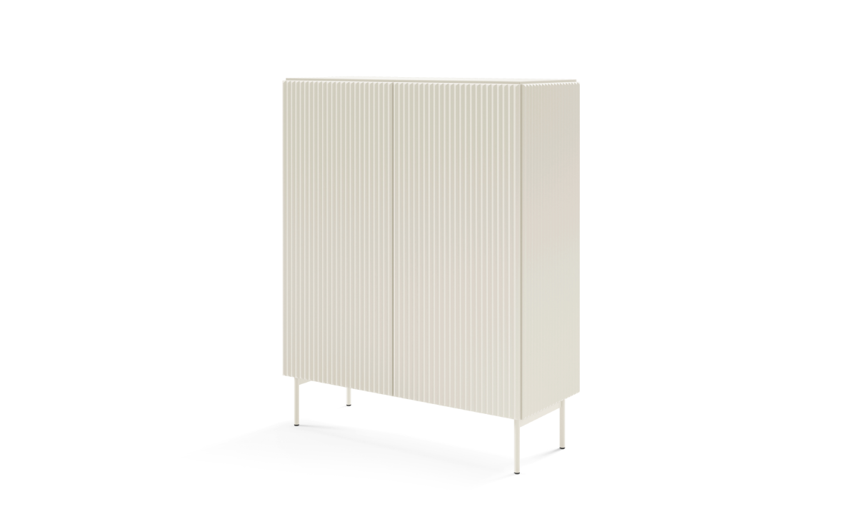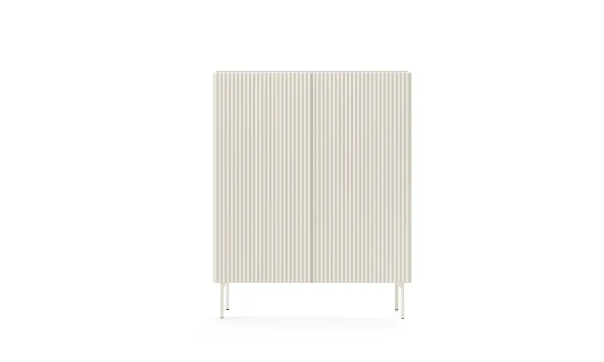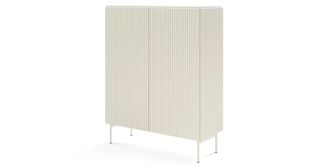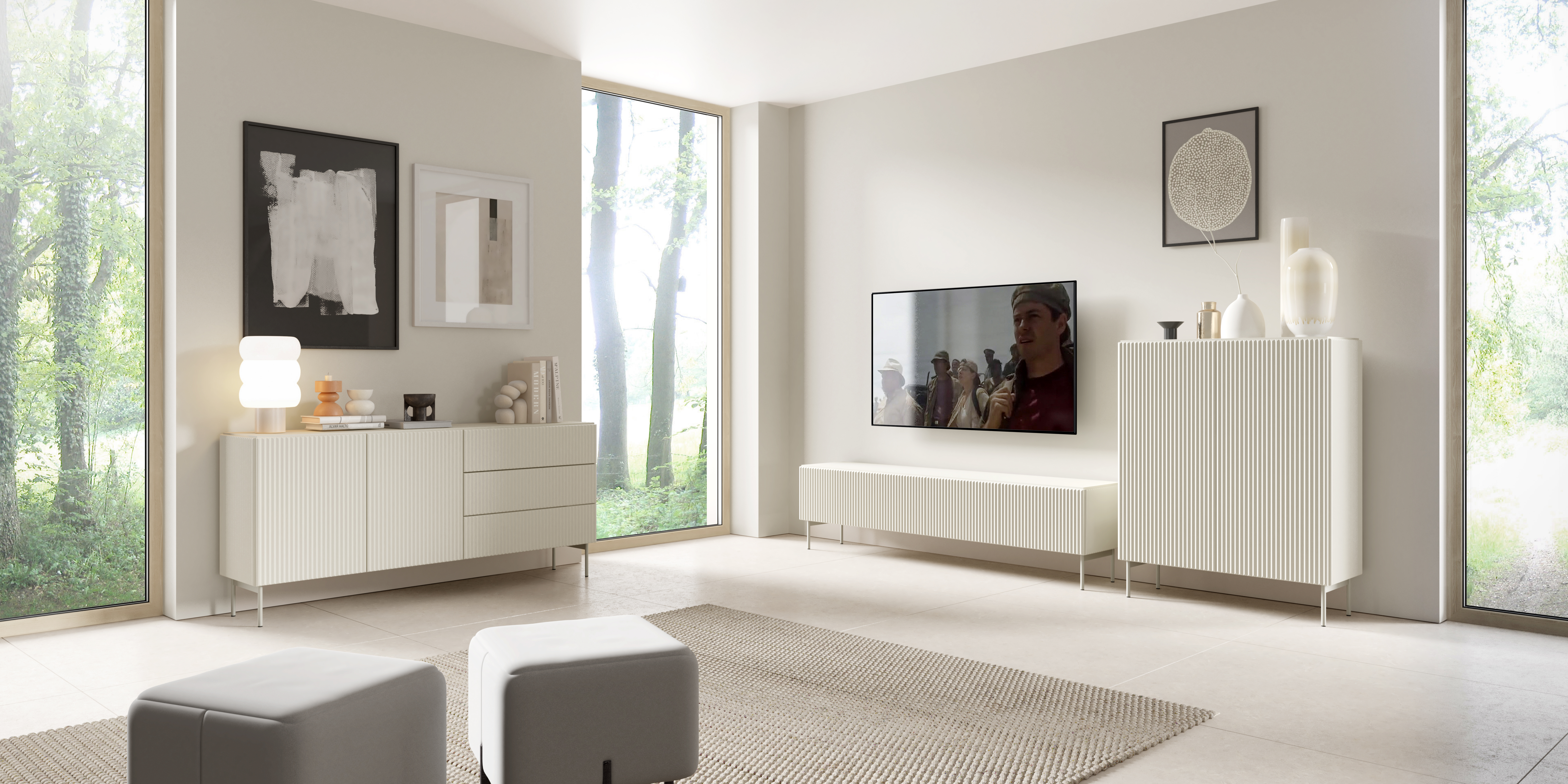 Geriffelte MDF-Fronten, sanfte Linien und schmale, kaschmirfarbene Metallfüße verleihen den Möbeln einen modernen, luftigen Charakter. Gleichzeitig bietet MUTI großzügigen Stauraum und durchdachte Funktionalität – ganz ohne Kompromisse beim Design.