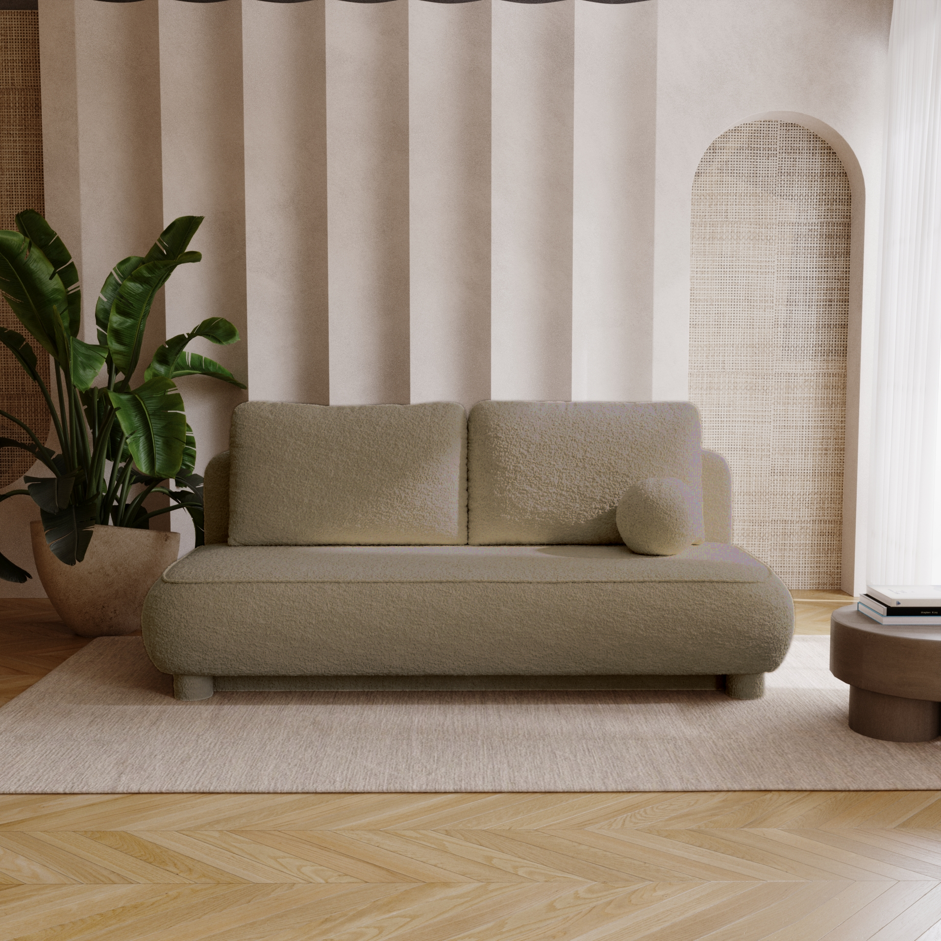 Kleines Sofa ZALIA | Boucle-Stoff | Schlaffunktion & Stauraum