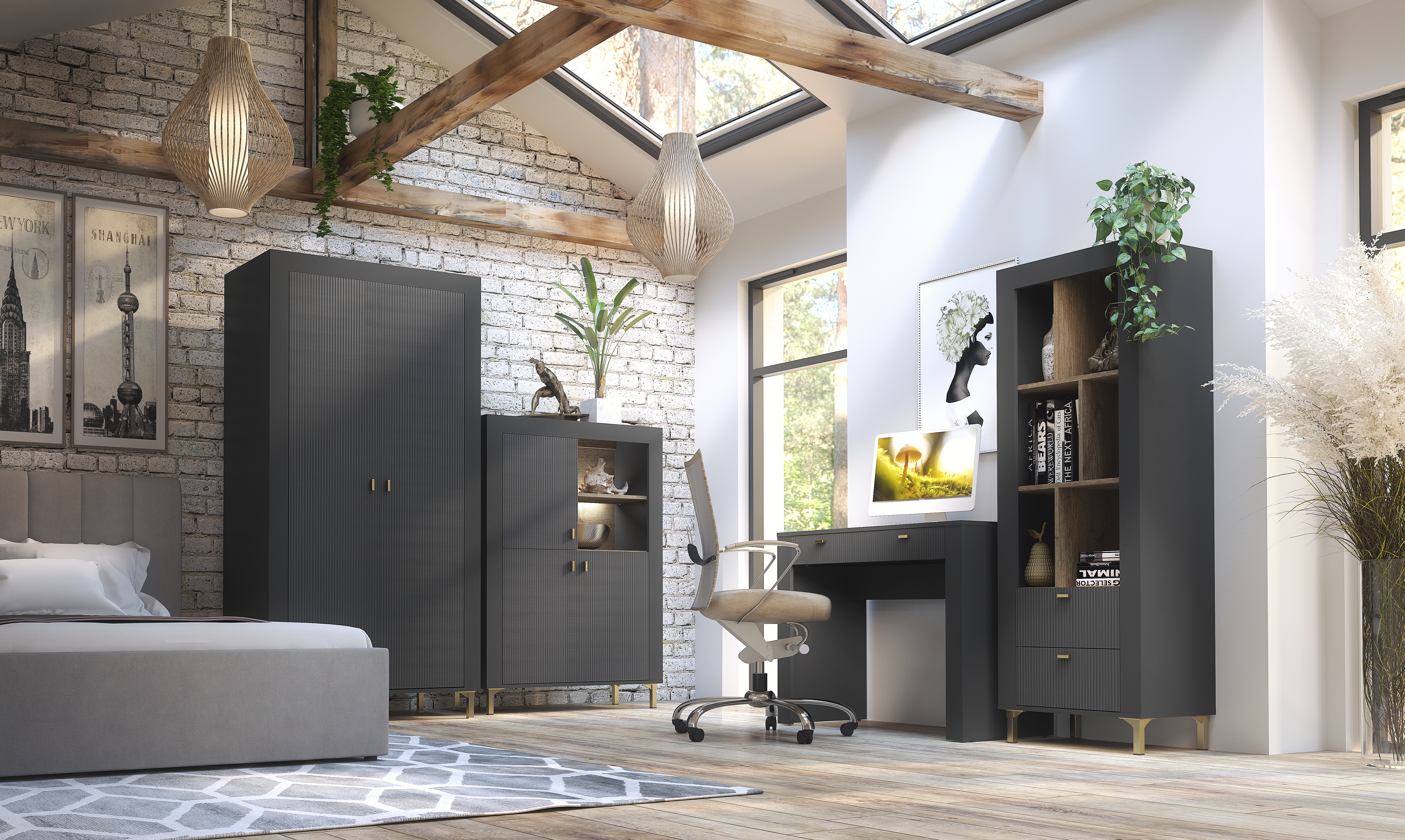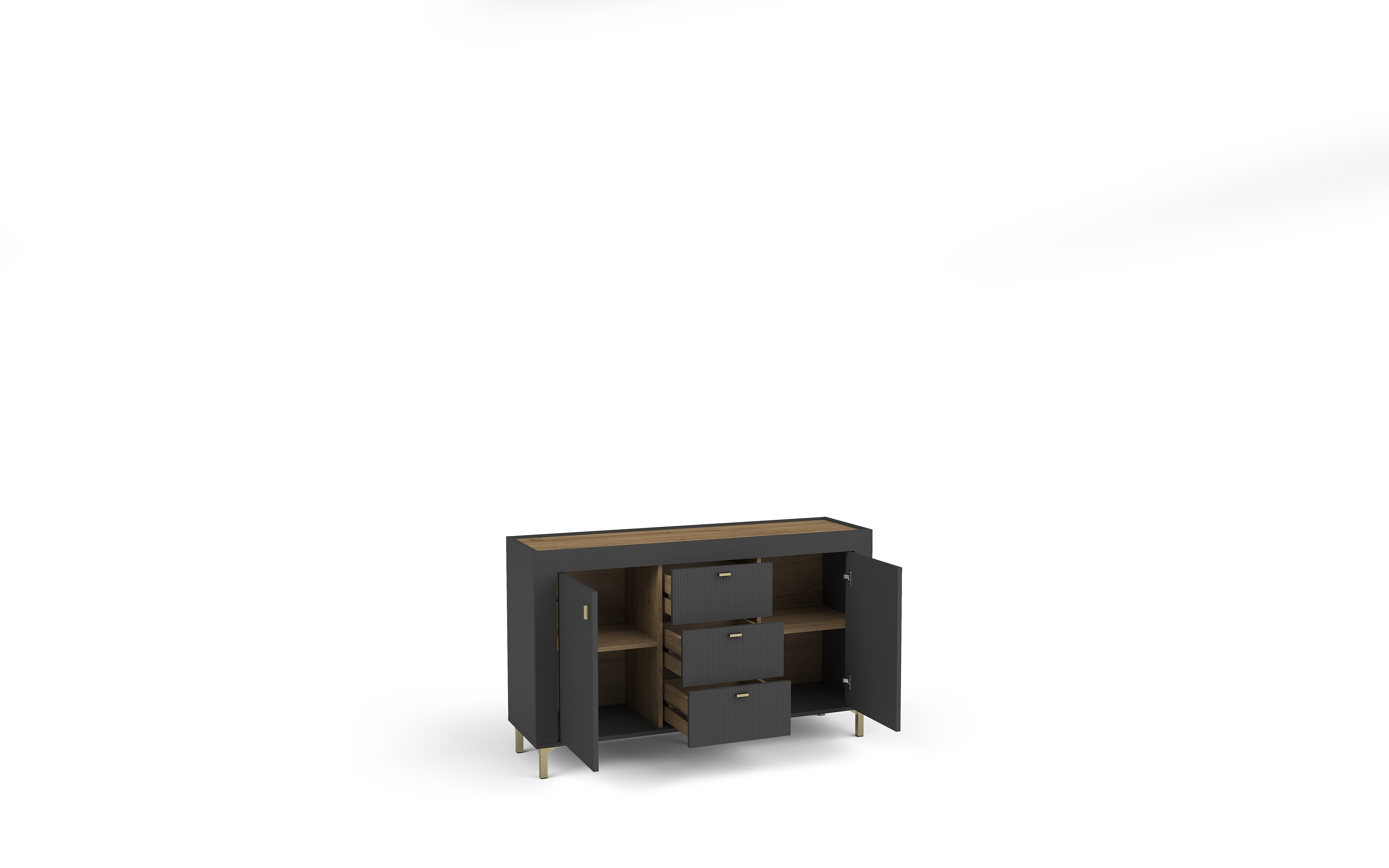 Die Mossa Kollektion vereint modernes Design mit zeitloser Eleganz. Charakteristische geriffelte Fronten in Schwarz, Kaschmir und Weiß werden mit der warmen Holzoptik Eiche Whisky kombiniert.