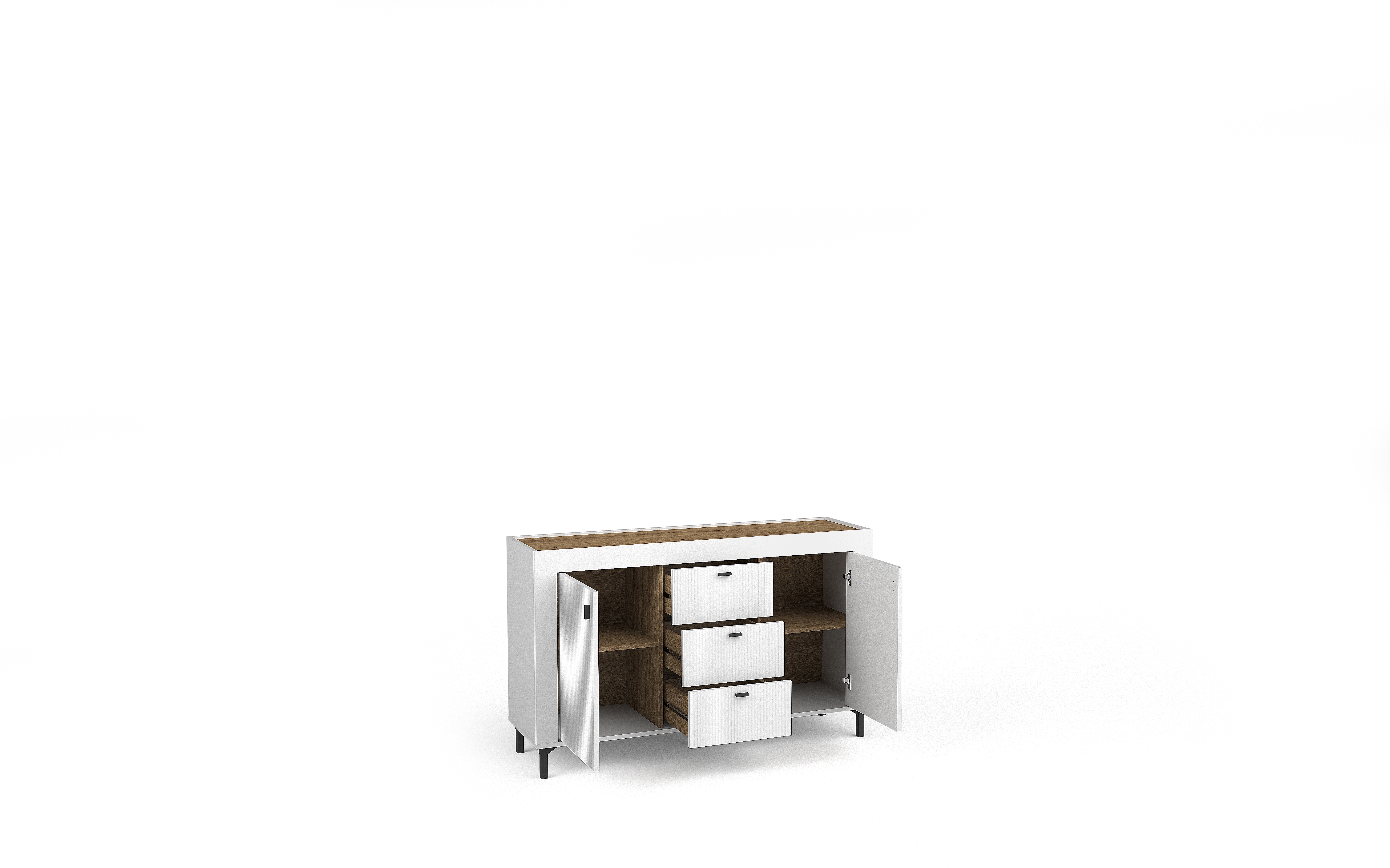 Die Mossa Kollektion vereint modernes Design mit zeitloser Eleganz. Charakteristische geriffelte Fronten in Schwarz, Kaschmir und Weiß werden mit der warmen Holzoptik Eiche Whisky kombiniert.