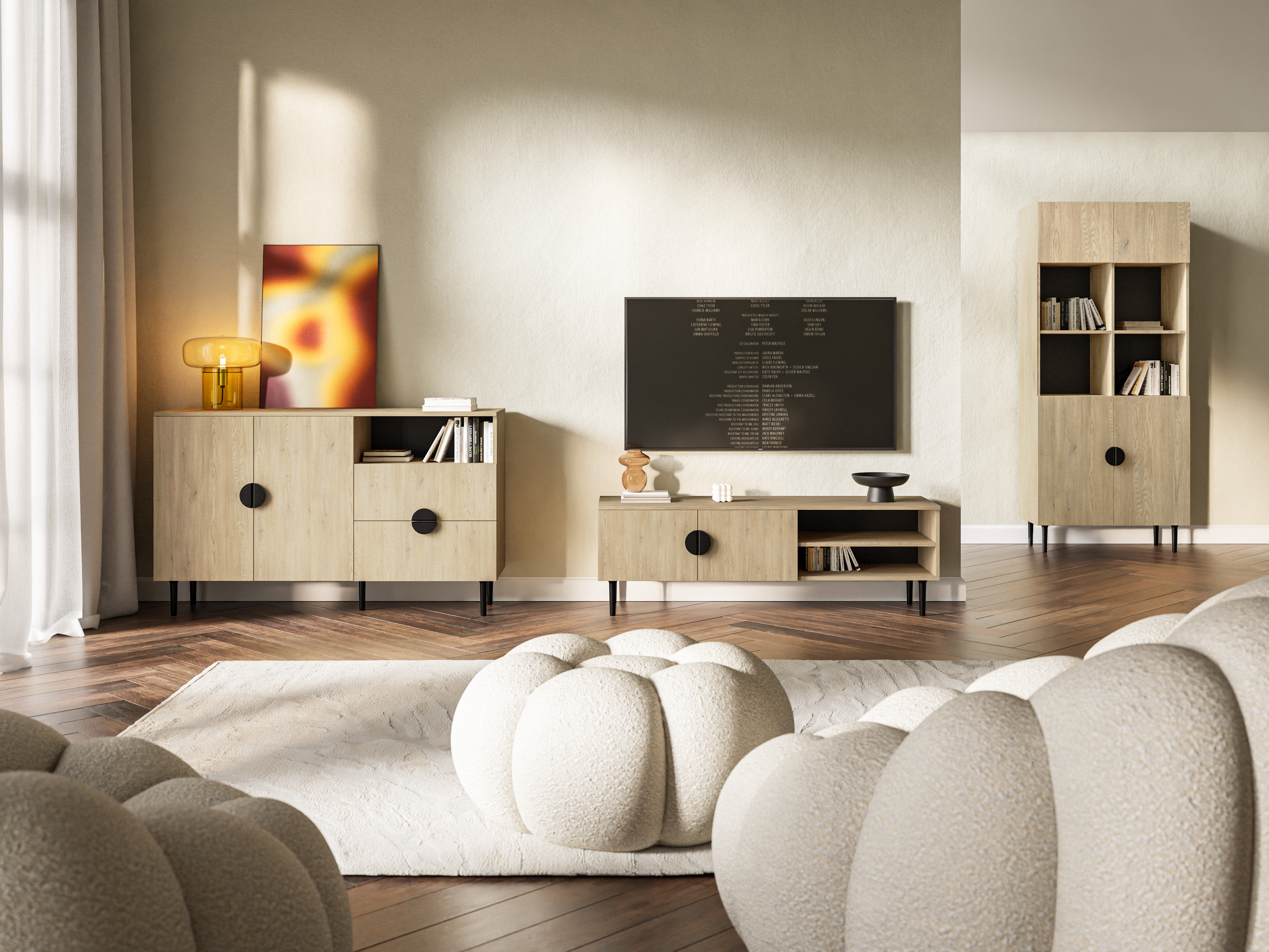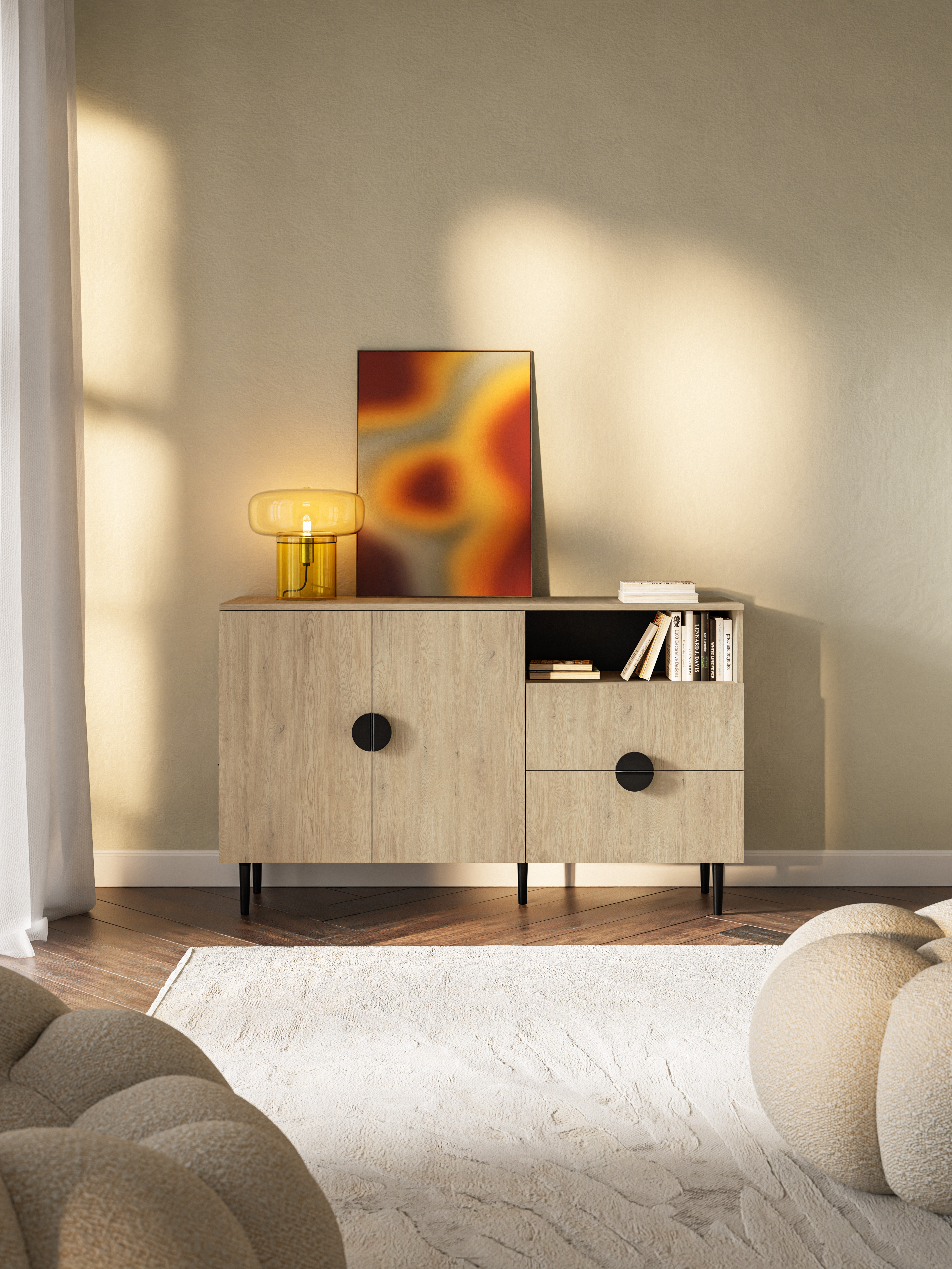 - Design-Details: Die markanten, runden Griffe in Schwarzmatt verleihen der Kommode einen individuellen und modernen Charakter.