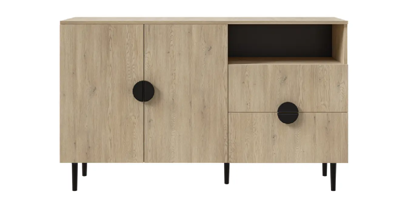 - Asymmetrische Funktionalität: Die durchdachte Aufteilung mit zwei Türen, einer Schublade und einer offenen Nische ermöglicht eine komfortable Aufbewahrung und Dekoration zugleich.
