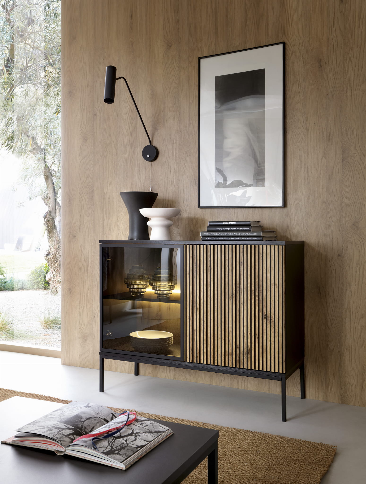 Die SANTIA-Möbel sind eine außergewöhnliche Kollektion, die jeden bezaubern wird, der ein modernes und funktionales Wohnzimmerdekor wünscht. Ihre ursprüngliche Farbgebung, d.h. schwarzer Graphit in Kombination mit der Farbe der Eiche Wotan, macht sie nicht nur schön, sondern auch außergewöhnlich ausdrucksstark. Diese intensiven Farbtöne verleihen dem Interieur Charakter und Eleganz und schaffen einen einzigartigen Stil. Was zeichnet die SANTIA-Möbel aus? Vor allem die Liebe zum Detail. Hervorragende Verarbeitungsqualität sieht man auf den ersten Blick - jedes Element wurde sorgfältig durchdacht und entworfen. Jede Linie, jedes Bauelement harmoniert perfekt und bildet ein zusammenhängendes Ganzes. Die Kollektion SANTIA besteht aus modernen Vitrinen und Kommoden mit LED-Beleuchtung und Verglasung. Stilvolle 3D-Fronten mit Lamellen unterstreichen die Einzigartigkeit der Kollektion. Möbel haben keine Griffe dank Push-to-Open-Funktion.