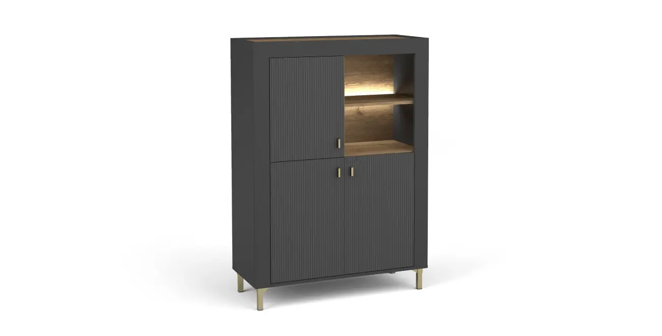Die Mossa Kollektion vereint modernes Design mit zeitloser Eleganz. Charakteristische geriffelte Fronten in Schwarz, Kaschmir und Weiß werden mit der warmen Holzoptik Eiche Whisky kombiniert.