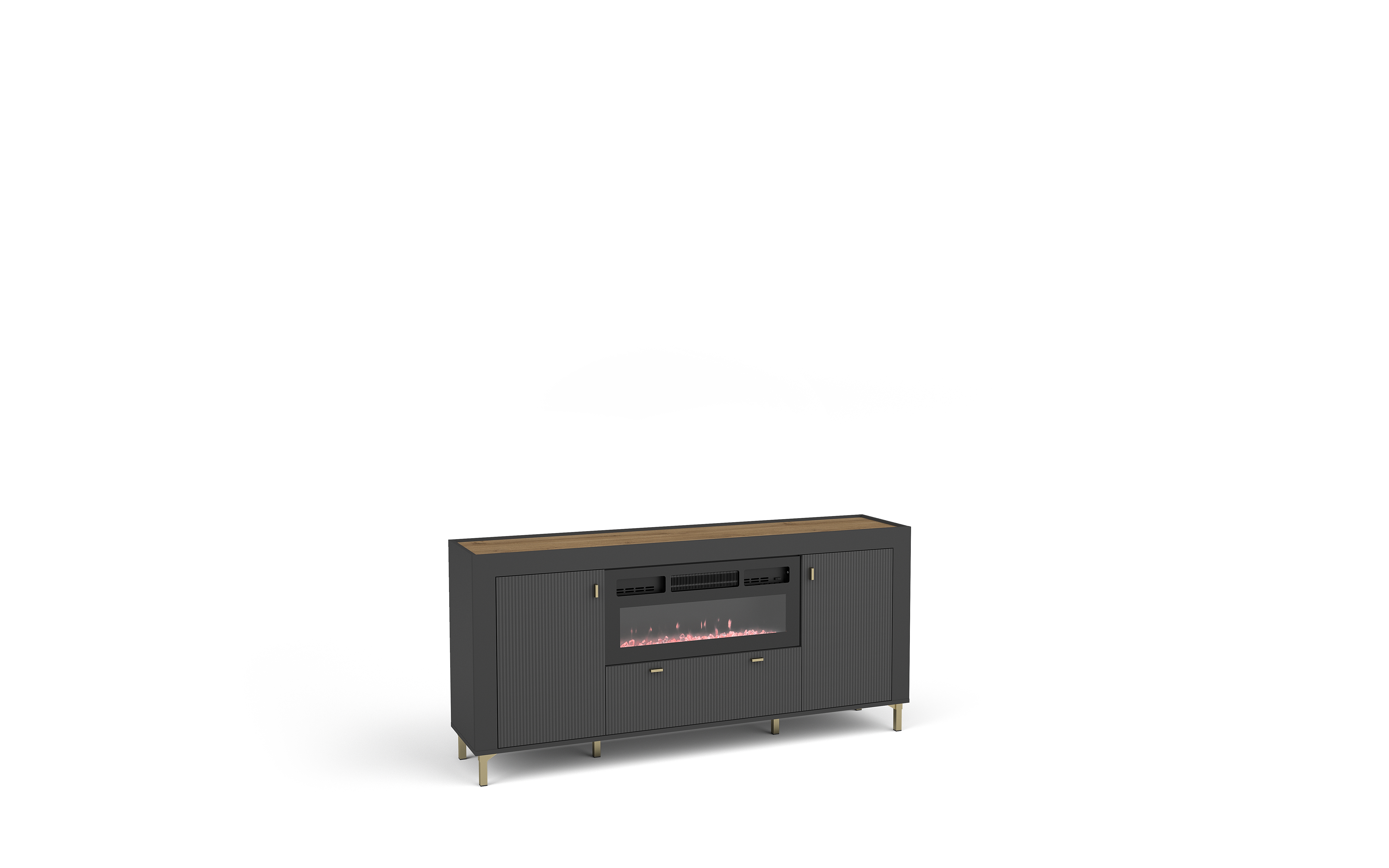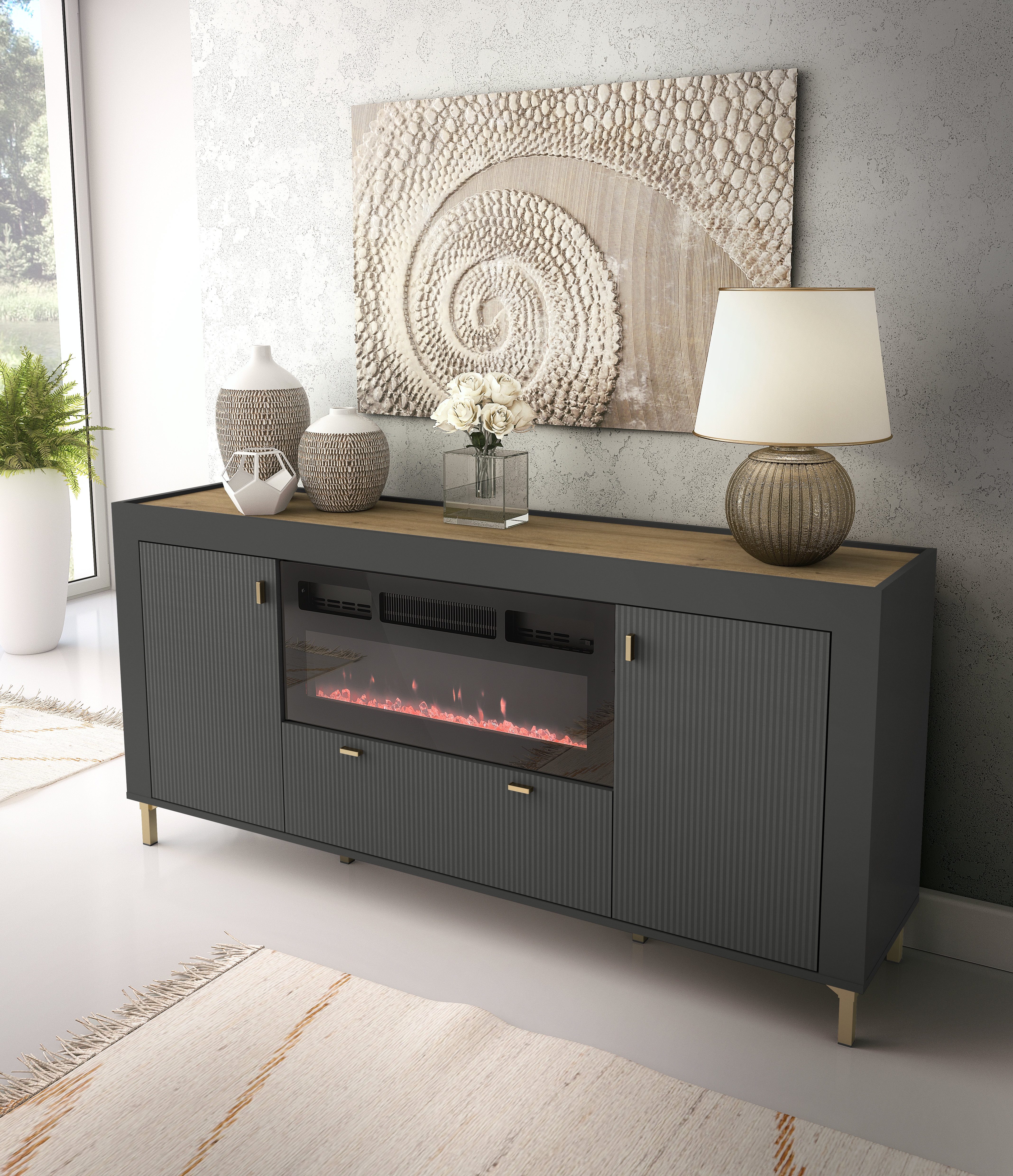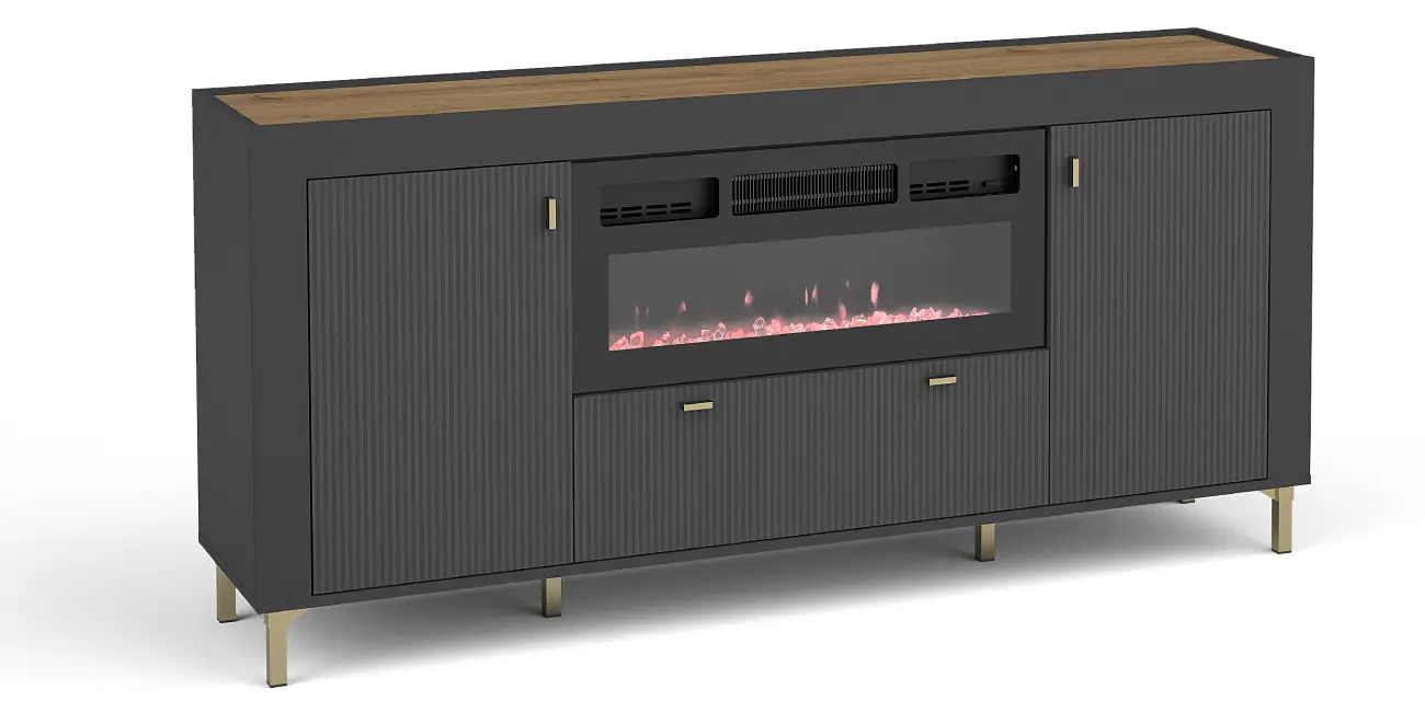 Die Kommode ist sowohl in einer Variante mit integriertem Elektrokamin als auch in einer klassischen Version ohne Kamin erhältlich. So können Sie das Modell wählen, das perfekt zu Ihren Bedürfnissen und zum Stil Ihrer Einrichtung passt. Beide Ausführungen verbinden modernes Design mit Funktionalität und schaffen ein praktisches sowie elegantes Möbelstück für jedes Zuhause.