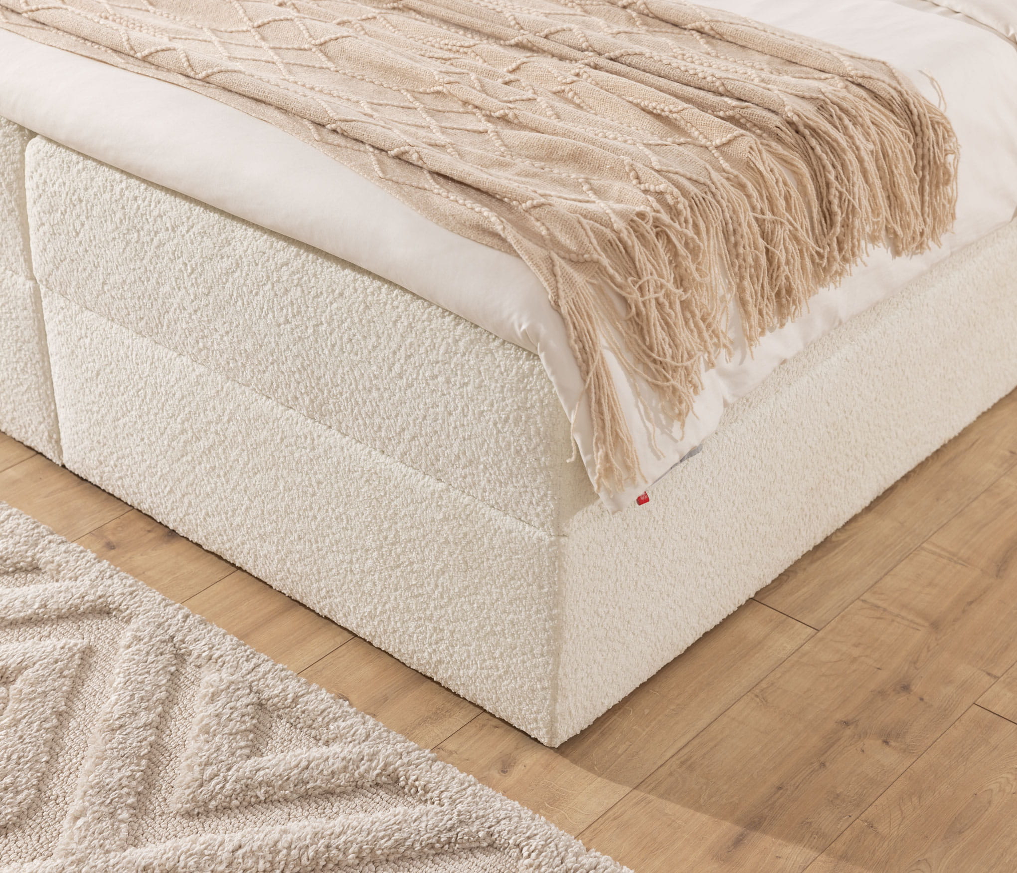 Dieses Bett ist mit dem exklusiven Möbelstoff CORAL bezogen. Es handelt sich um einen modernen, dezenten Bouclé-Stoff, der sich durch eine extrem weiche, flauschige und angenehme Oberfläche auszeichnet. Die leicht unregelmäßige Struktur erinnert an luxuriöse Schafwolle – mit feinen Schlingen und Knoten, die dem Bett eine unvergleichlich warme und gemütliche Optik verleihen. Der Stoff ist zudem äußerst widerstandsfähig und pflegeleicht.