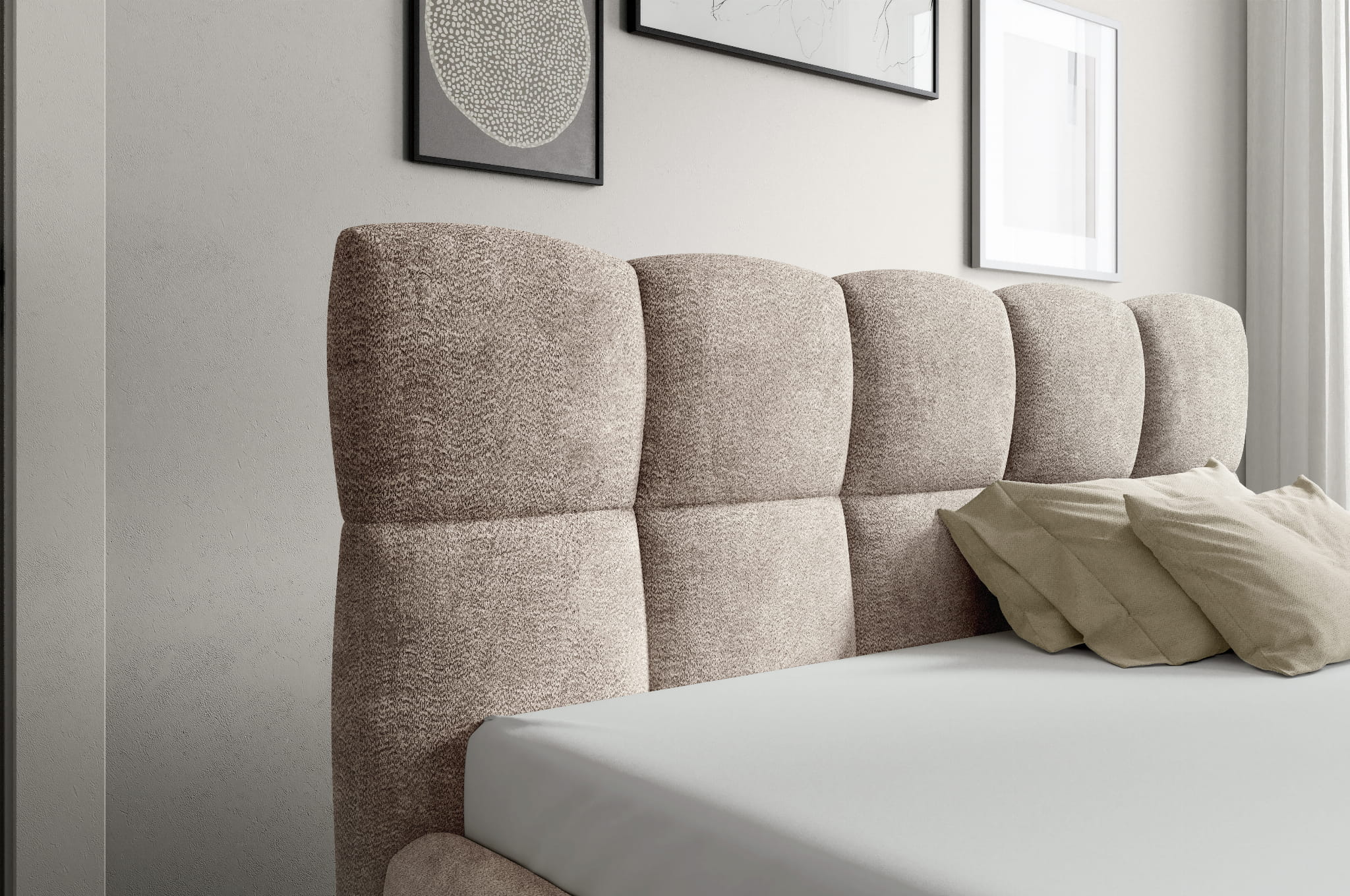 Dieses Bett ist mit dem exklusiven Möbelstoff CORAL bezogen. Es handelt sich um einen modernen, dezenten Bouclé-Stoff, der sich durch eine extrem weiche, flauschige und angenehme Oberfläche auszeichnet. Die leicht unregelmäßige Struktur erinnert an luxuriöse Schafwolle – mit feinen Schlingen und Knoten, die dem Bett eine unvergleichlich warme und gemütliche Optik verleihen. Der Stoff ist zudem äußerst widerstandsfähig und langlebig.