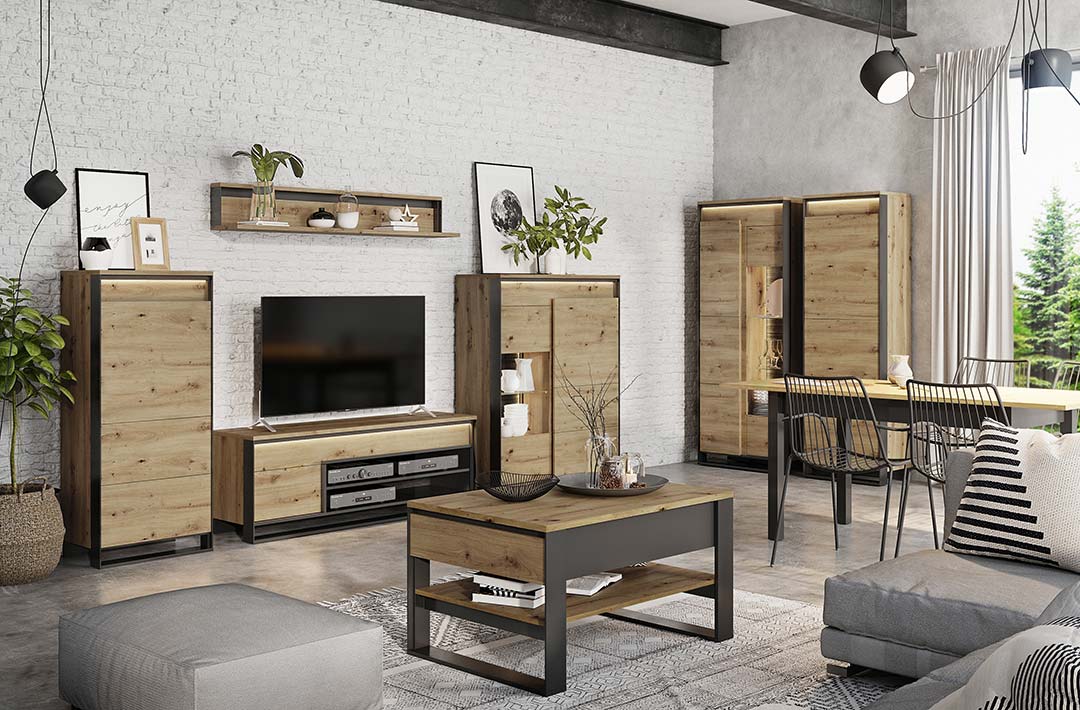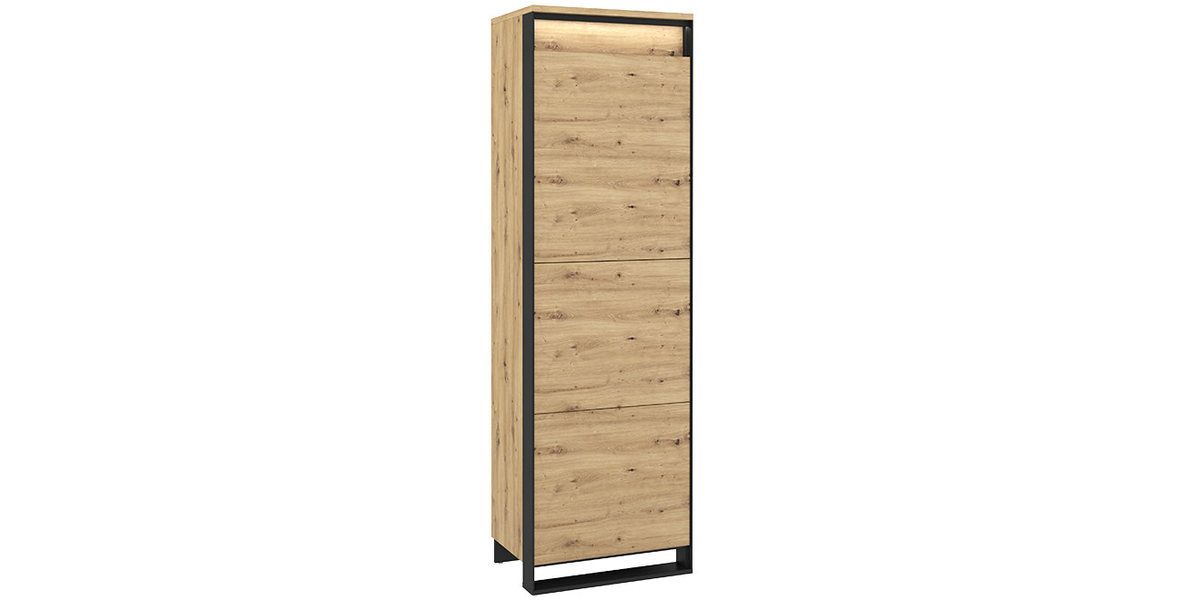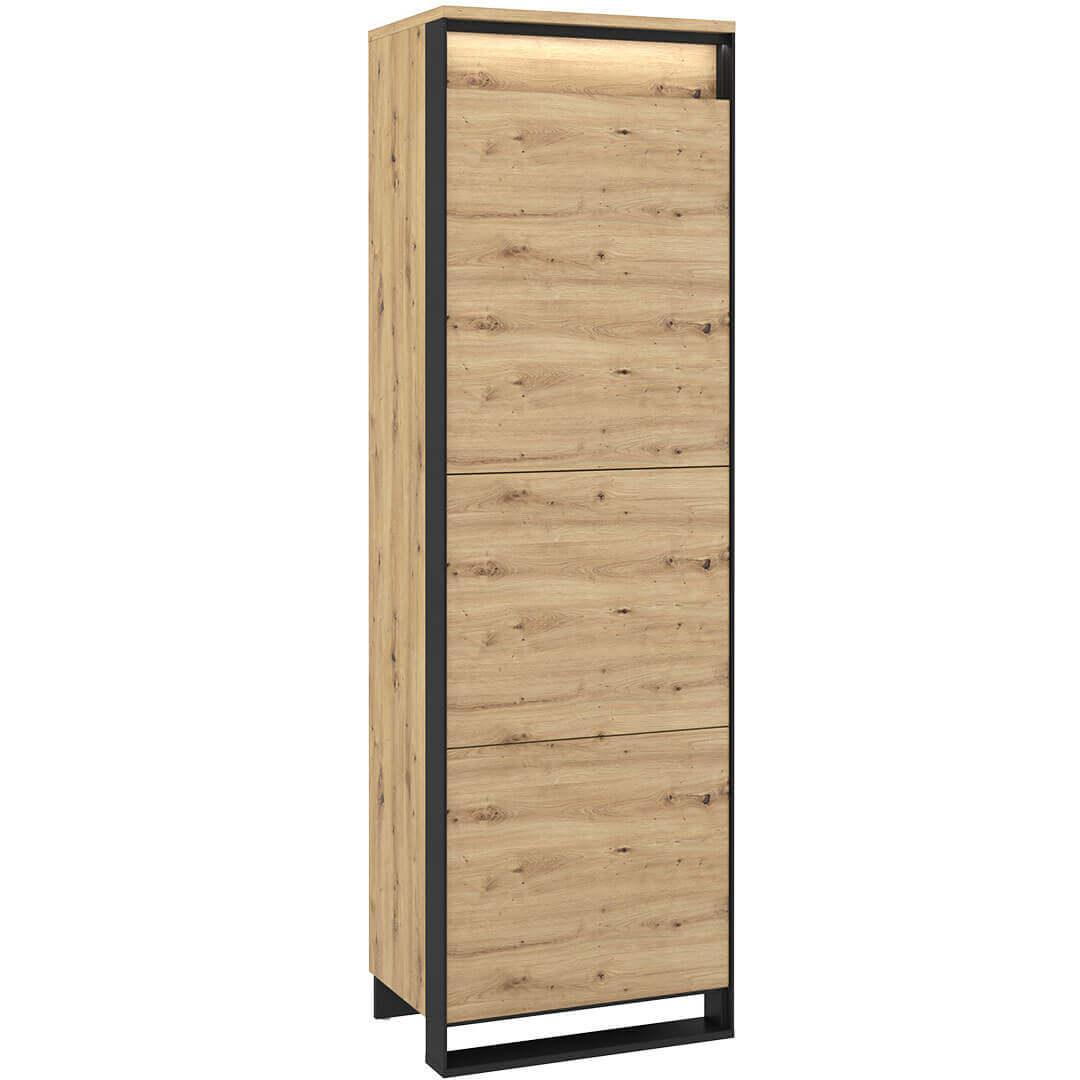 Suchen Sie nach einer platzsparenden und gleichzeitig extrem stilvollen Aufbewahrungslösung? Der eintürige Schrank QUANT (QA-02) im angesagten Loft-Stil ist ein echtes Raumwunder! Dank seiner kompakten Abmessungen (nur 60 cm Breite und 41 cm Tiefe) fügt er sich mühelos auch in kleinere Räume, schmale Flure oder Nischen ein. Das ausdrucksstarke Holzdekor in Eiche Artisan harmoniert perfekt mit den schwarzen Details. Die besondere Dreidimensionalität der Front wird durch die inkludierte, diffuse LED-Beleuchtung eindrucksvoll betont und sorgt abends für eine gemütliche Atmosphäre.