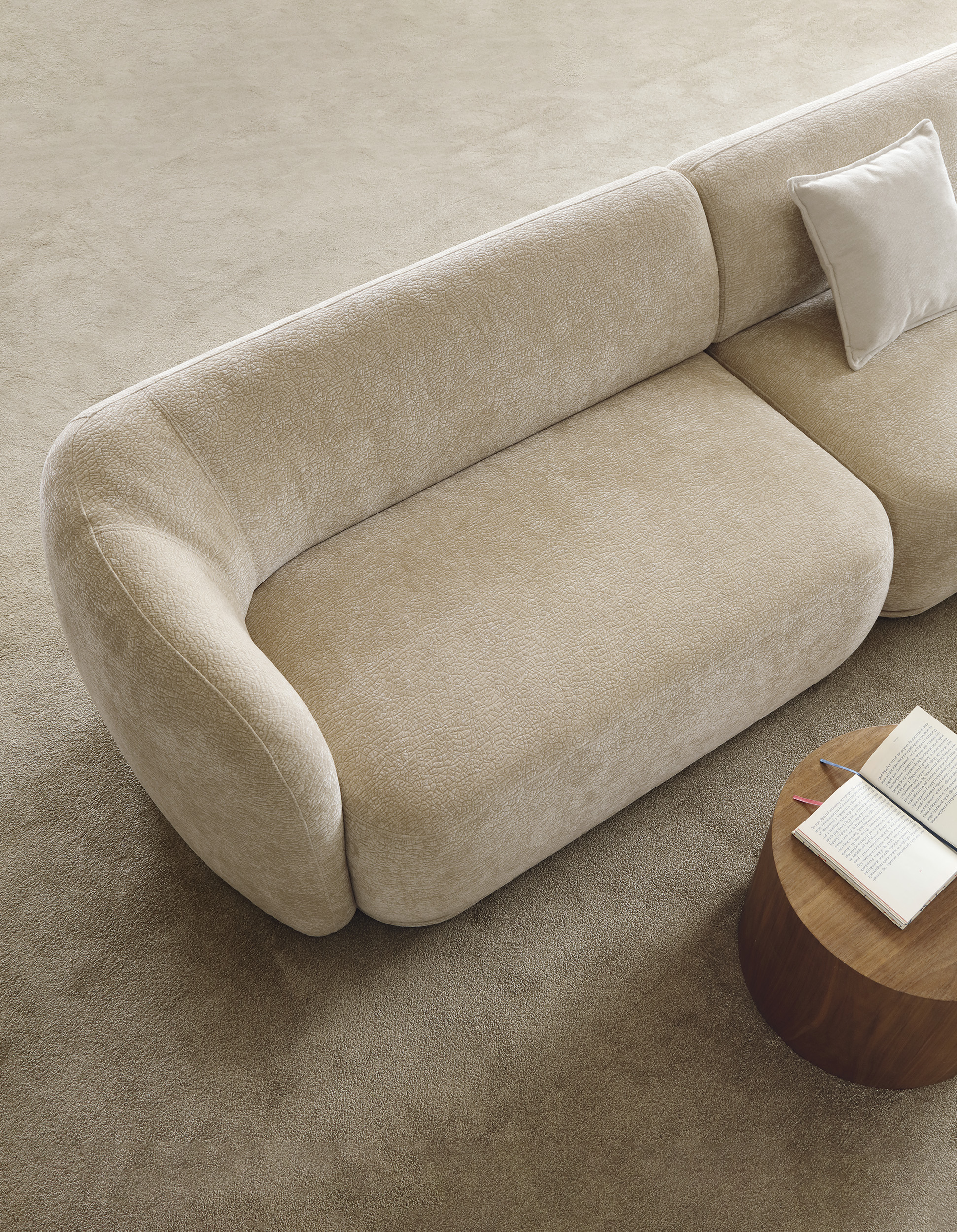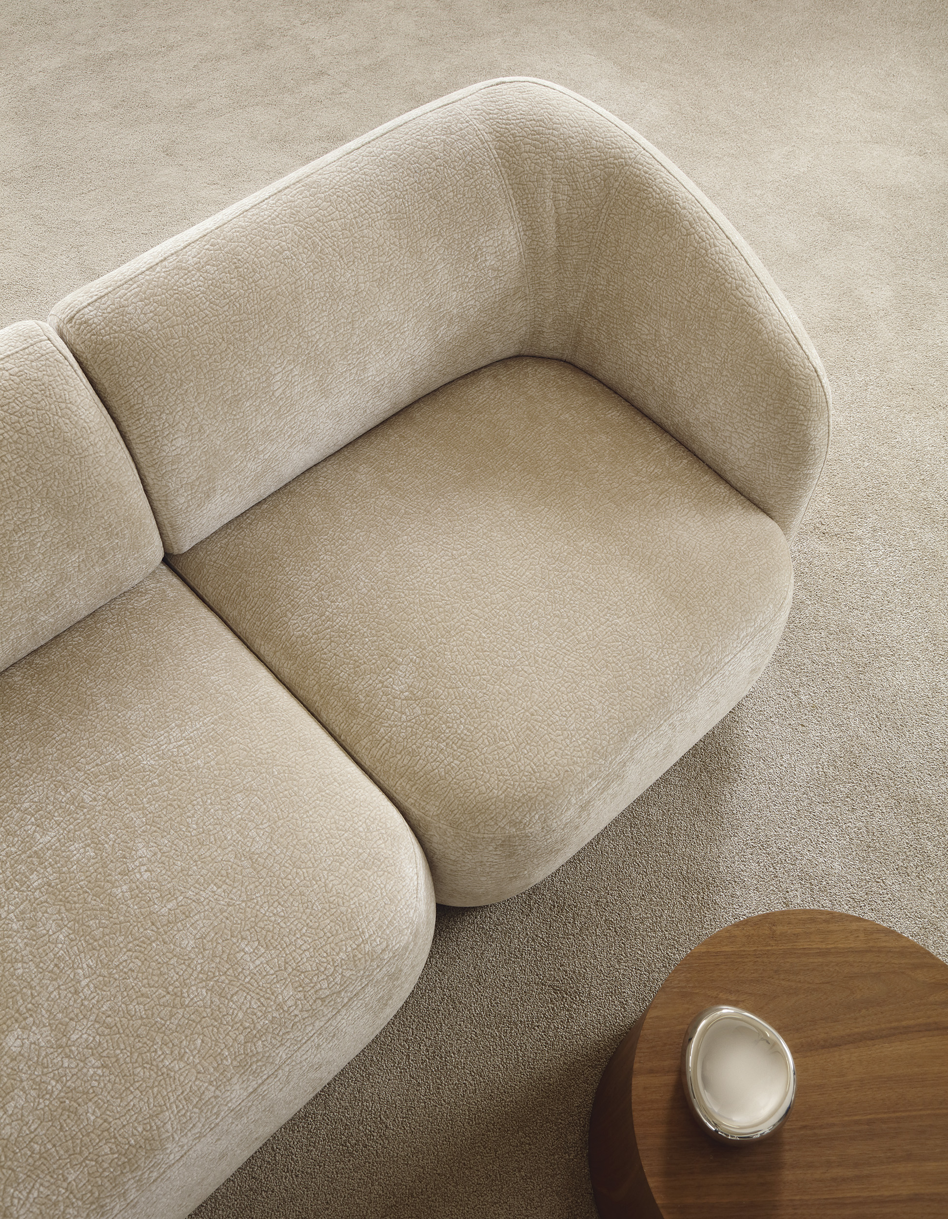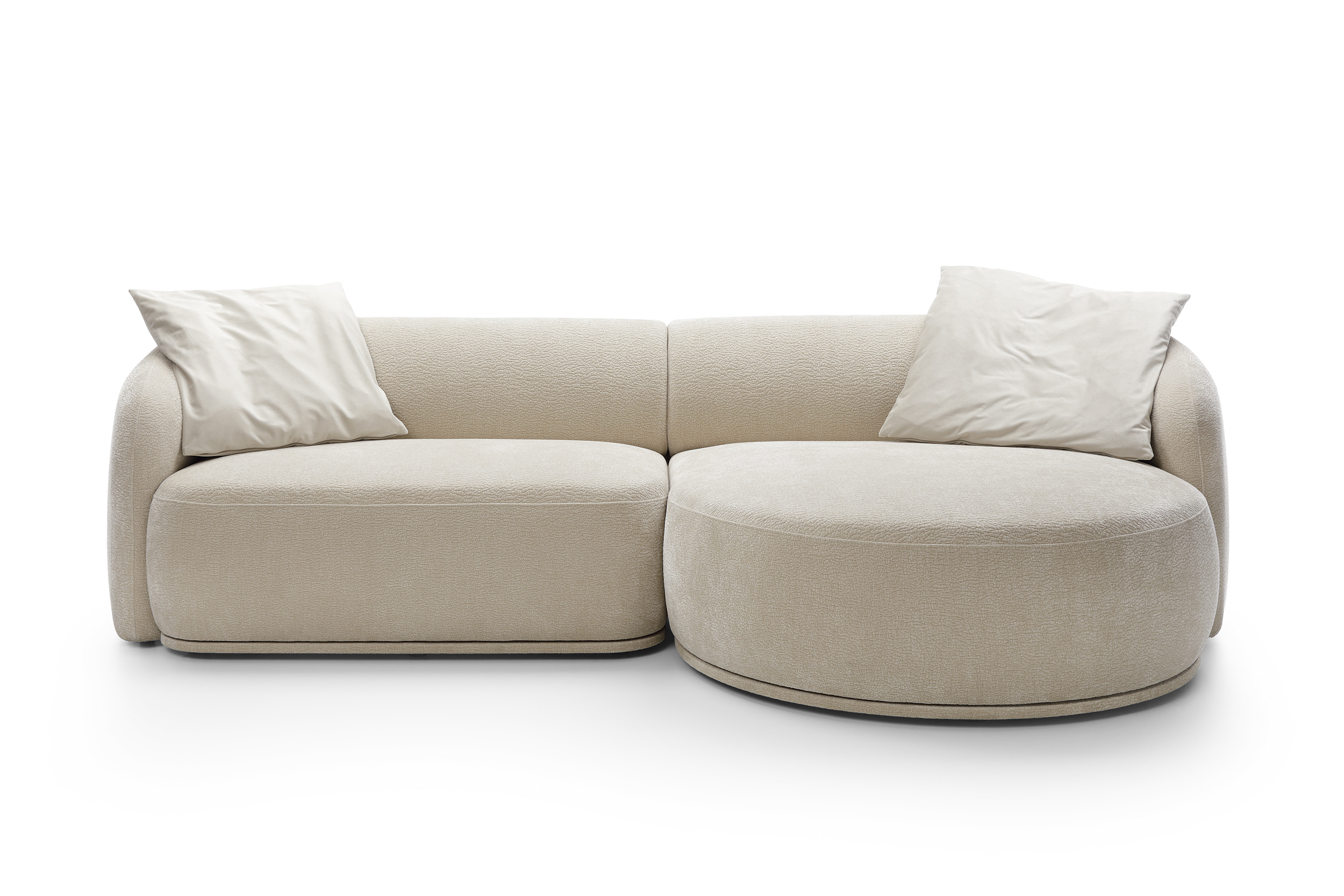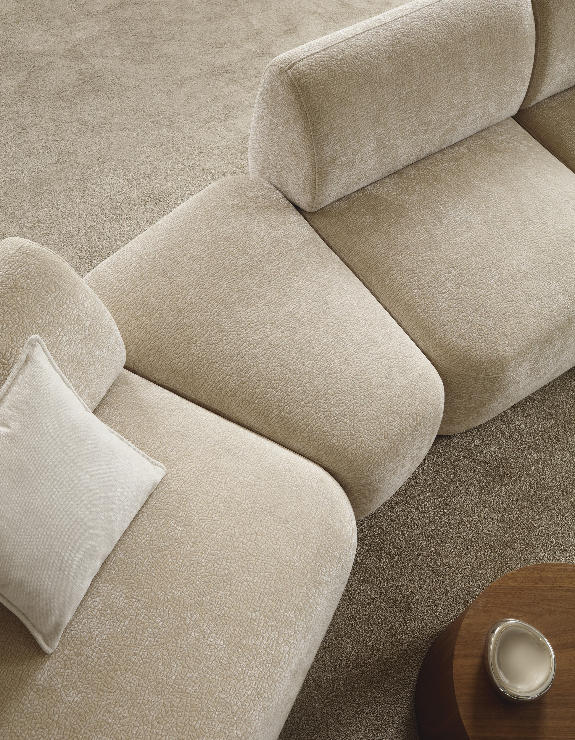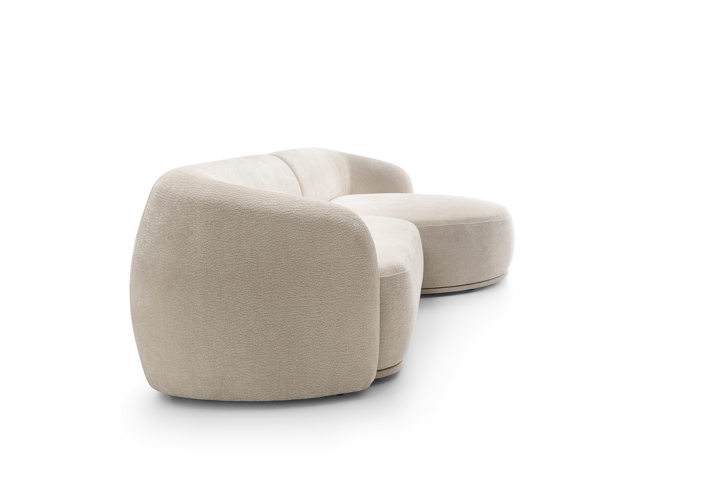 Das Ecksofa NOBO kombiniert ein modernes, harmonisches Design mit außergewöhnlichem Komfort. Die organischen, abgerundeten Formen und der luxuriöse Chenille-Stoff (Kollektion Dress Me) schaffen eine einladende Atmosphäre und machen das Sofa zum Mittelpunkt des Wohnzimmers.