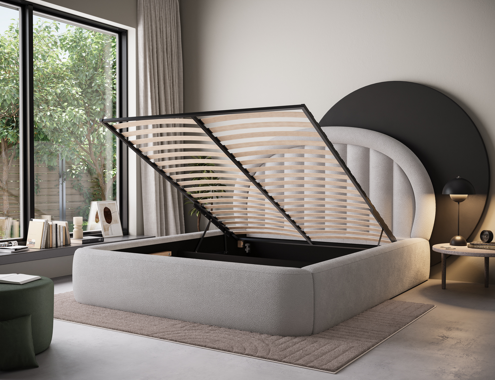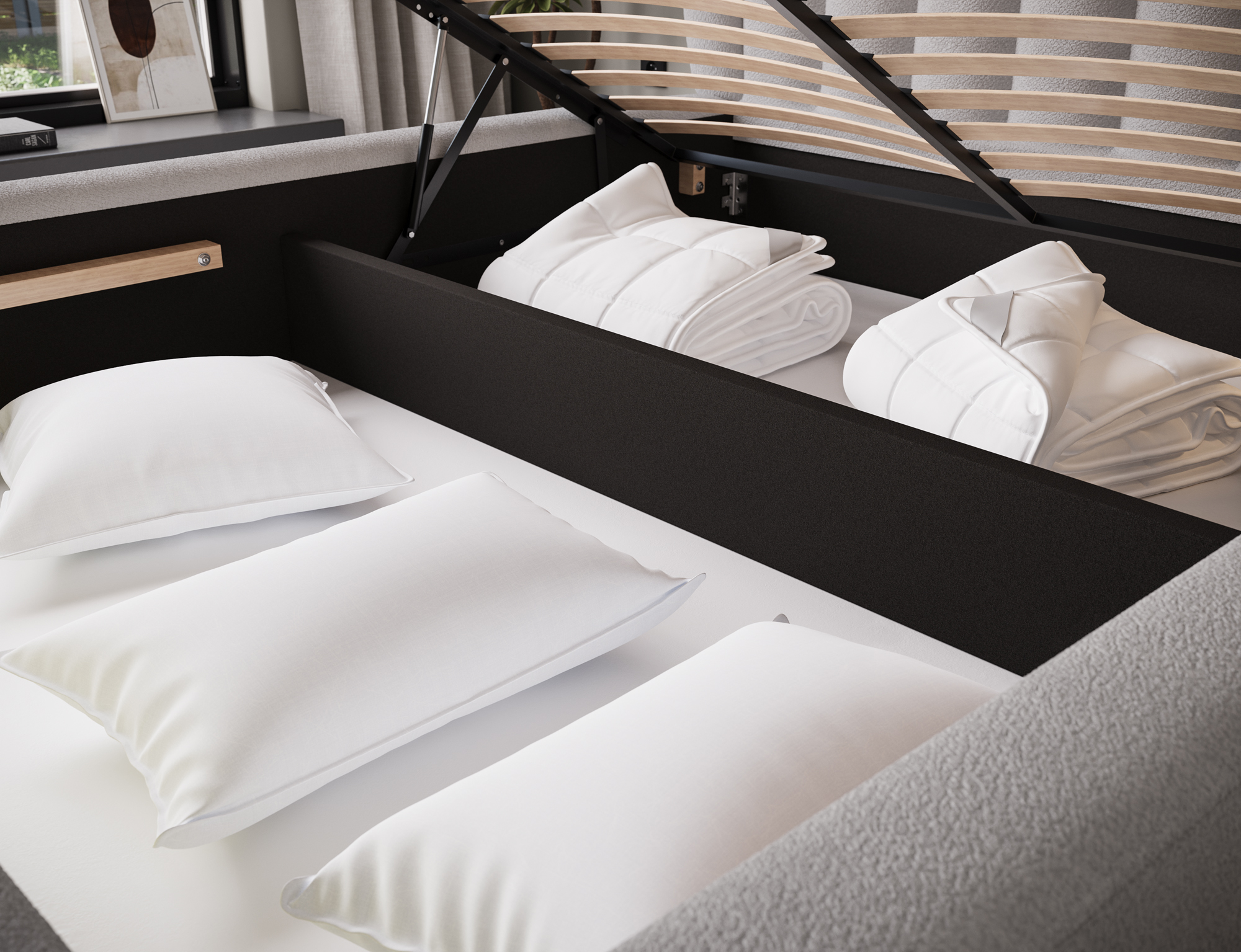 - Stabiler Metallrahmen: Das Bett ist mit einem Lattenrost auf einem Metallrahmen ausgestattet. Gasdruckfedern erleichtern das Anheben und den Zugang zum Stauraum.