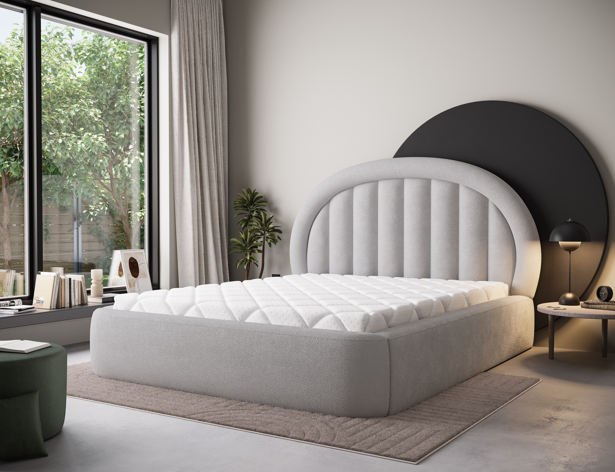 Das Polsterbett BELLA zeichnet sich durch sein beeindruckendes, extra hohes Kopfteil (131 cm) mit vertikalen Paneelen aus. Diese Höhe bietet eine bequeme Rückenlehne und macht das Bett zum Mittelpunkt des Schlafzimmers. Die breiten, gepolsterten Seitenrahmen verleihen dem Bett Massivität, während der verstärkte Metallrahmen für Stabilität sorgt.