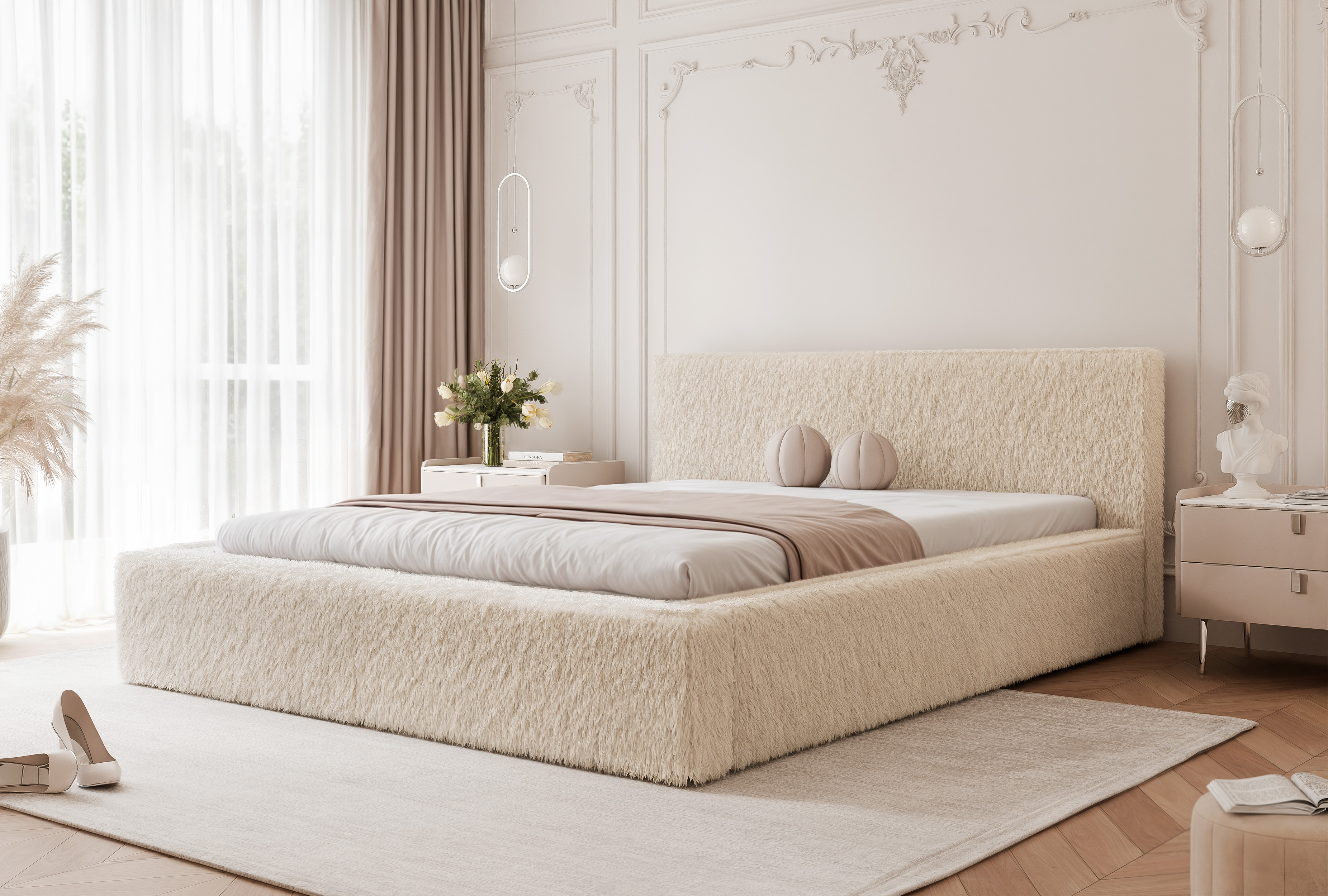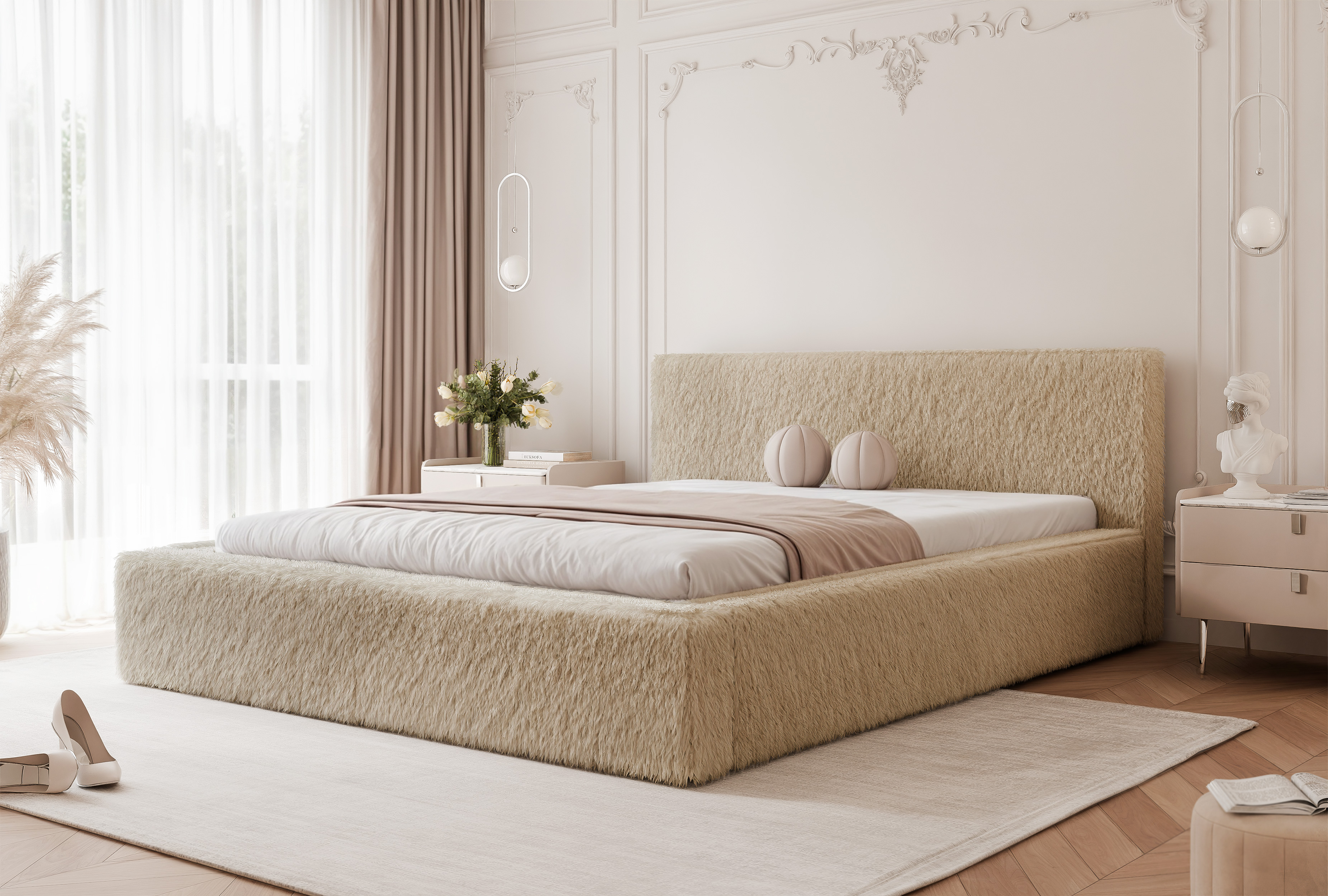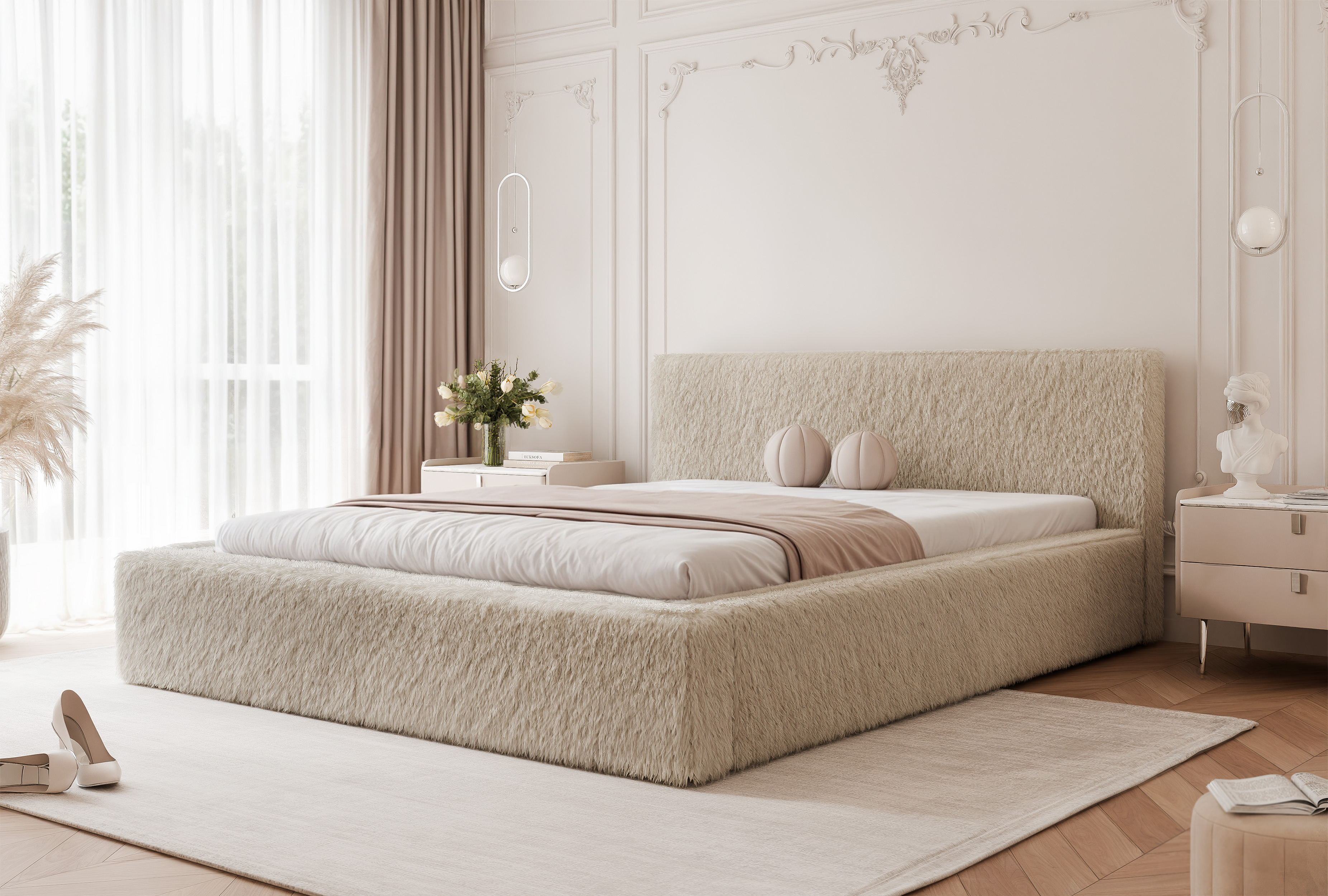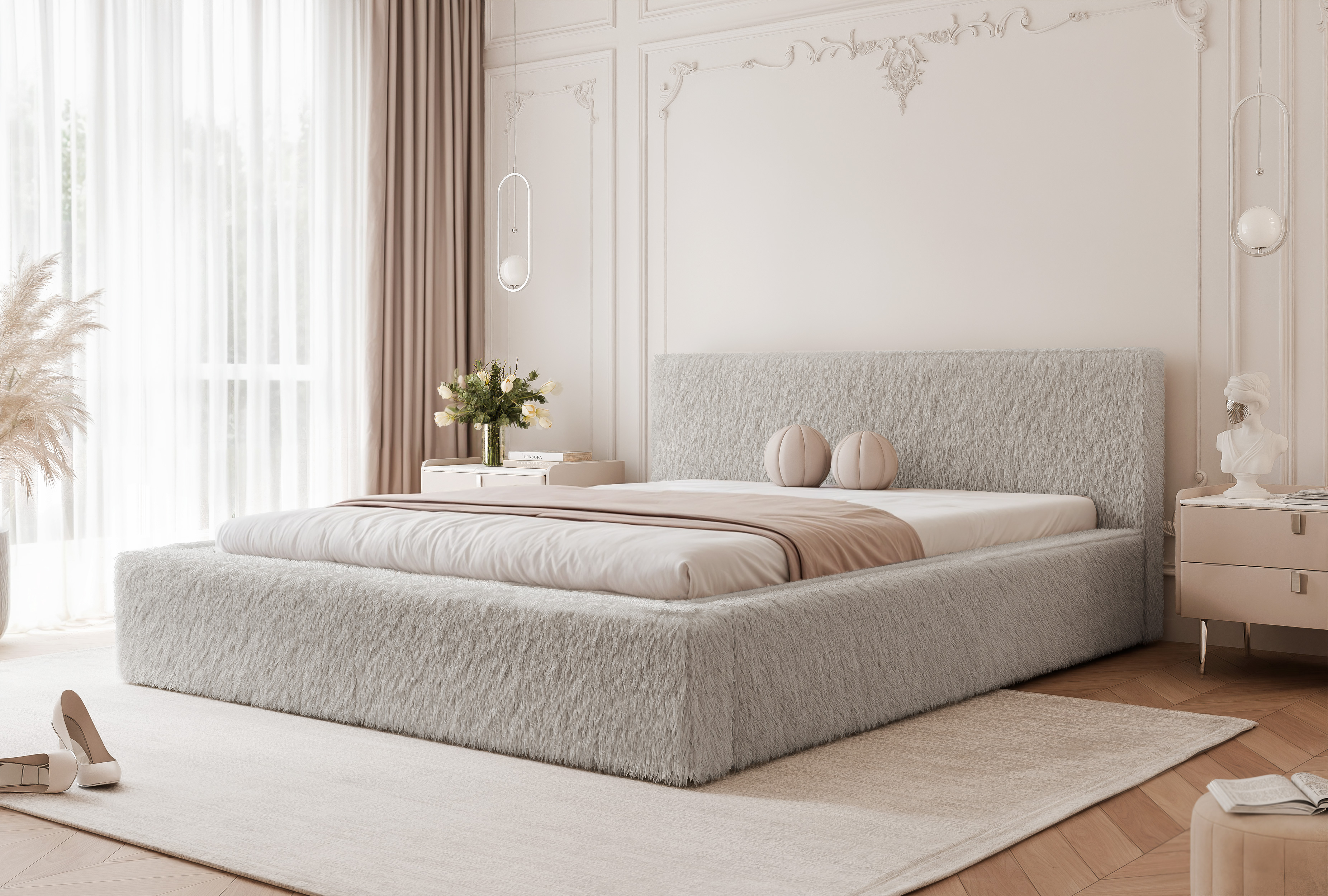 Das Fluffy Polsterbett vereint stilvolles Design mit außergewöhnlichem Komfort und wird zu einem luxuriösen Mittelpunkt in Ihrem Schlafzimmer. Mit seinem flauschigen, fellartigen Bezug sorgt das Bett nicht nur für eine gemütliche Schlafumgebung, sondern schafft auch eine elegante, einladende Atmosphäre. Ideal für moderne Schlafzimmer, in denen Komfort und Stil im Mittelpunkt stehen.