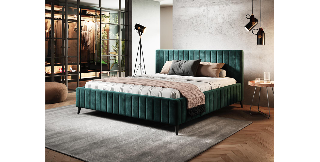 Ein modernes, elegantes Polsterbett in flaschengrüner Farbe Möchten Sie, dass Ihr neues Polsterbett Ihnen einen erholsamen Schlaf bietetund gleichzeitig äußerst stilvoll aussieht? Dieses schöne Veloursbett hat einen Rahmen und eine hohe Kopfstütze, die Ihnen am Abend beimLesen oder beim Anschauen einer Fernsehfilmreihe Komfort garantiert. Das Produkt ist vollständig mit Ziernähten verziert - so erscheinensie sowohl auf dem Körper als auch auf dem Kopfteil des Bettes. Das gepolsterte Veloursbett „Maggie“ ist mit Sicherheit die beste Lösungfür Kunden, die im Schlafzimmer nach Modernität suchen.