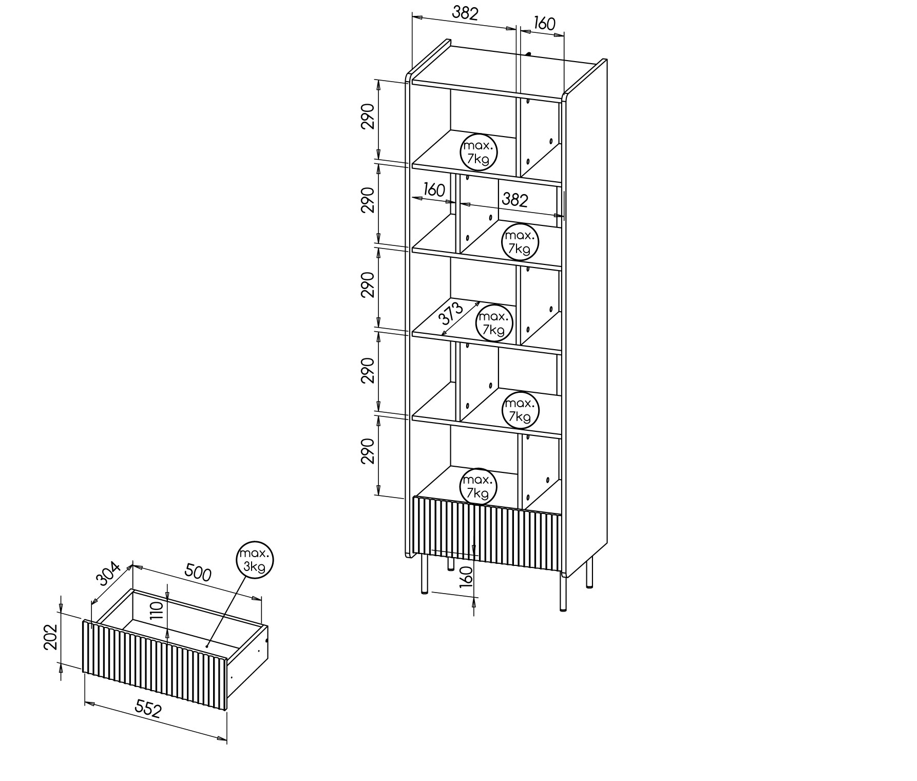 - Dekorelemente: Fronten mit vertikaler Riffelung (Lamellen) aus MDF in Schwarz.