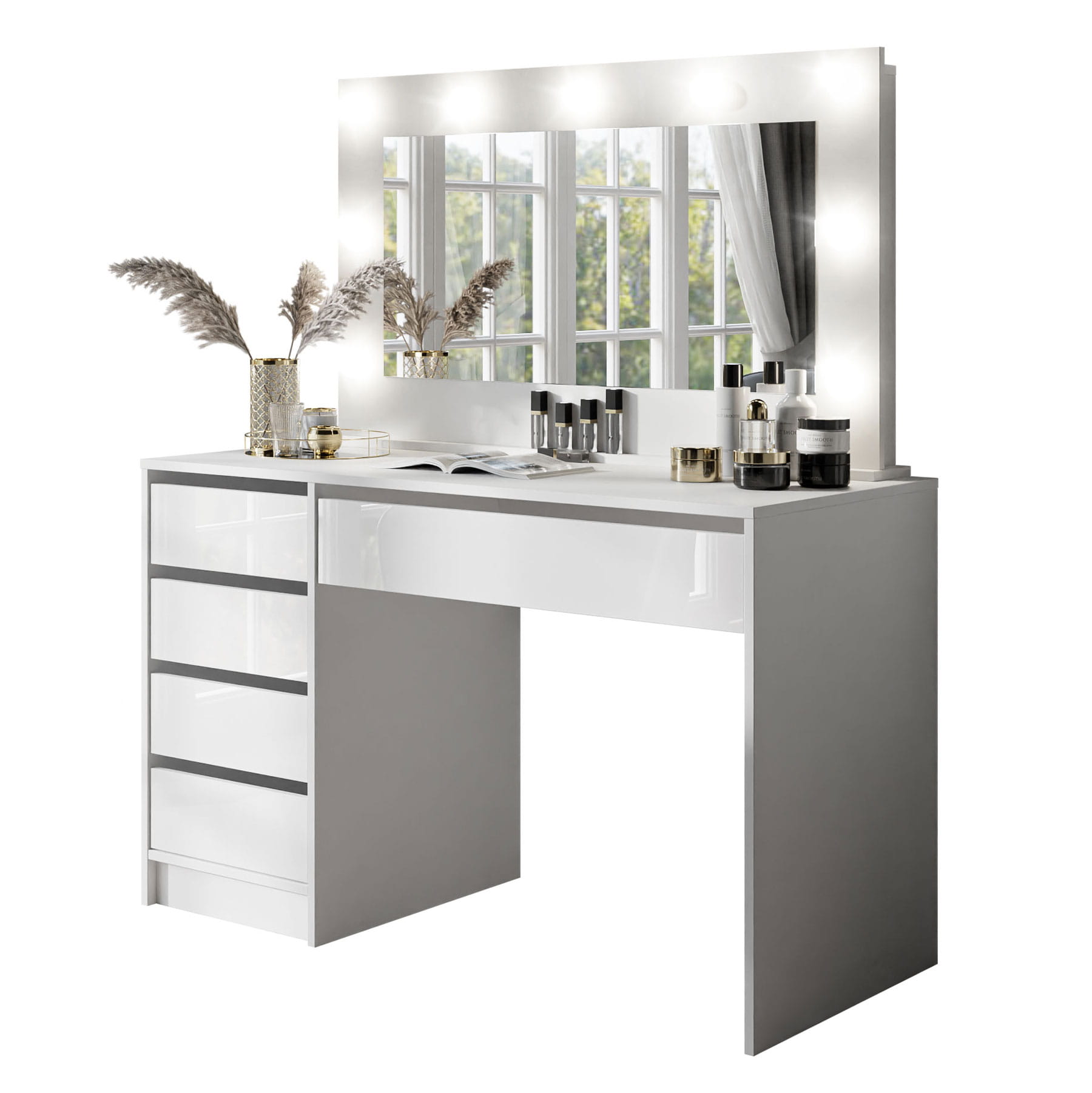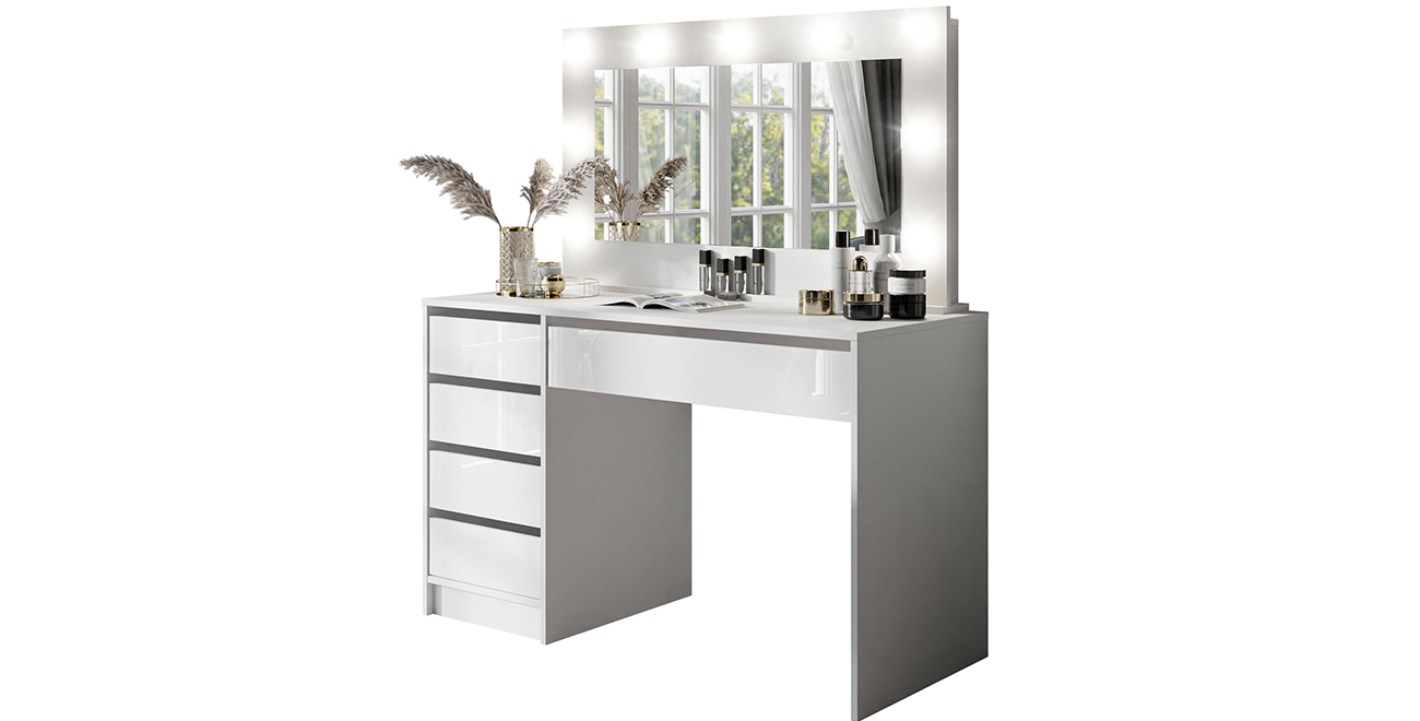 Schminktisch MADI Weiß (Glanz / Matt) mit LED-Spiegel & 5 Schubladen