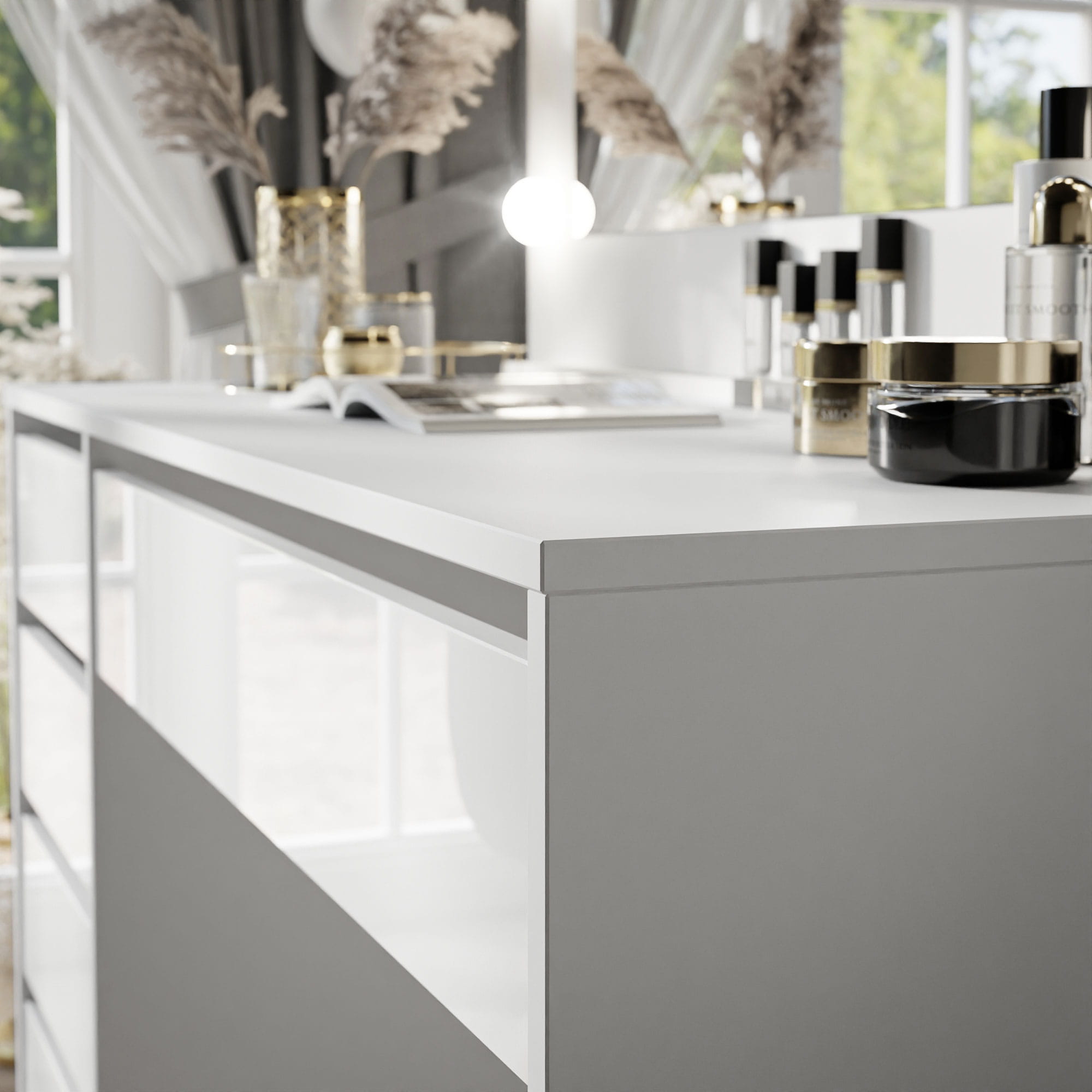 Bringen Sie einen Hauch von modernem Glamour in Ihr Schlaf- oder Jugendzimmer! Der Schminktisch MADI in strahlendem Weiß vereint elegantes Design mit maximaler Funktionalität. Wählen Sie bei den Schubladenfronten ganz nach Ihrem Geschmack zwischen edlem Hochglanz oder klassischem Matt. Er hellt den Raum optisch auf und bietet Ihnen den perfekten Ort für Ihre tägliche Beauty-Routine.
