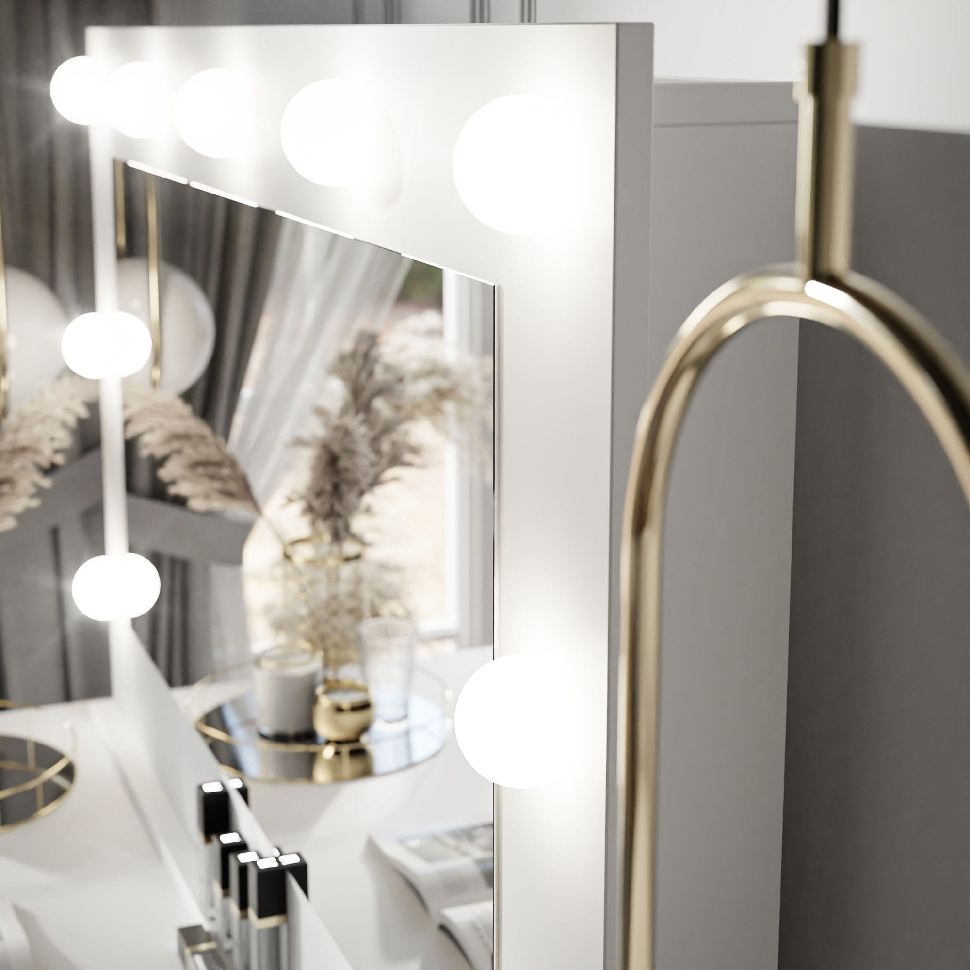 Das absolute Highlight ist der große, rechteckige Spiegel, der von einer stilvollen Lichterkette (LED-Glühbirnen) umrahmt wird. Diese symmetrische Beleuchtung im Hollywood-Stil garantiert Ihnen ein makelloses Licht – so wird jedes Make-up zum Kinderspiel und Sie fühlen sich wie ein echter Star!