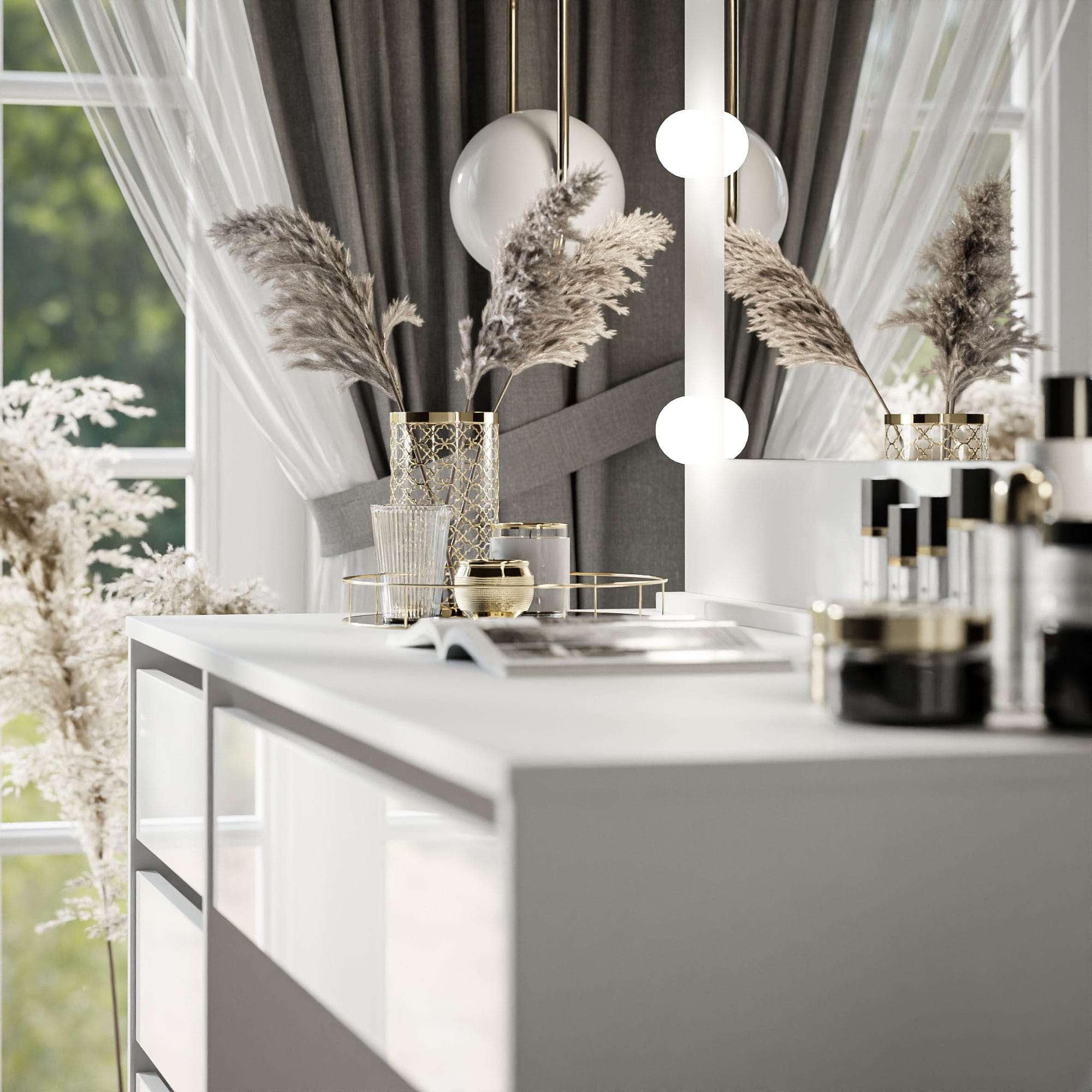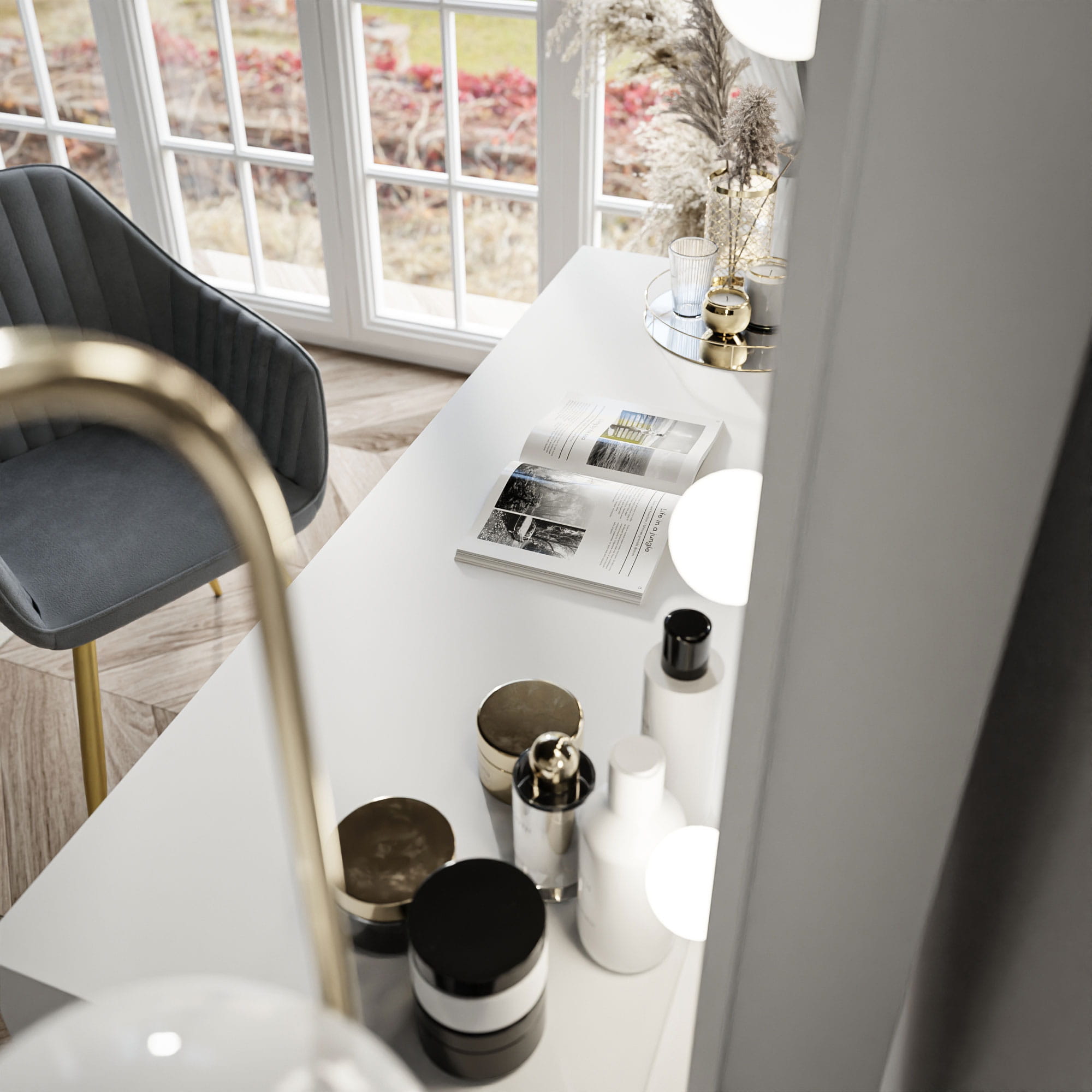Schluss mit dem Chaos! MADI verfügt über vier geräumige seitliche Schubladen und eine breite, ausziehbare Schublade direkt unter der Tischplatte. Hier können Sie all Ihre Pinsel, Paletten, Cremes und Schmuckstücke perfekt organisiert und griffbereit aufbewahren.