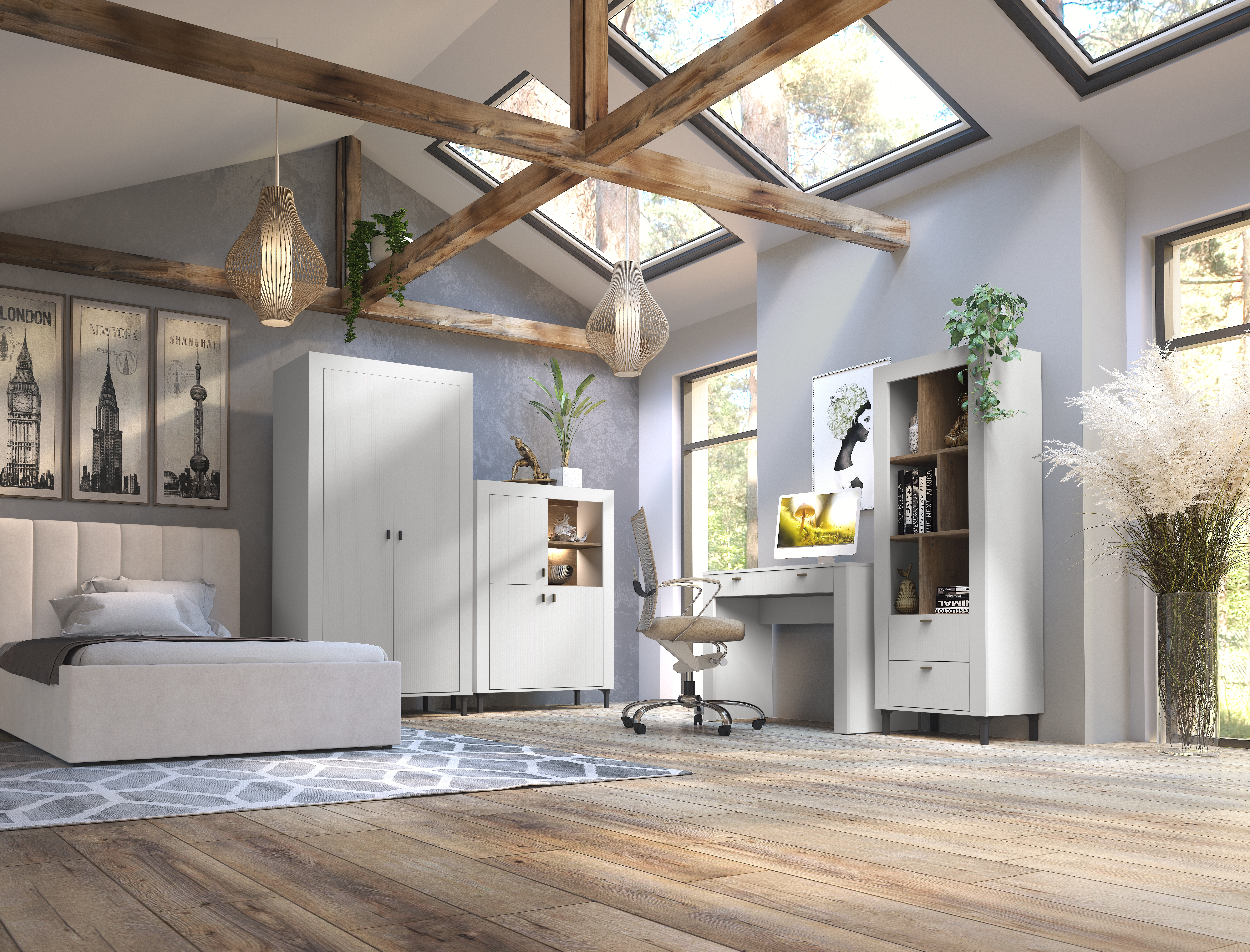 Die Mossa Kollektion vereint modernes Design mit zeitloser Eleganz. Charakteristische geriffelte Fronten in Schwarz, Kaschmir und Weiß werden mit der warmen Holzoptik Eiche Whisky kombiniert.