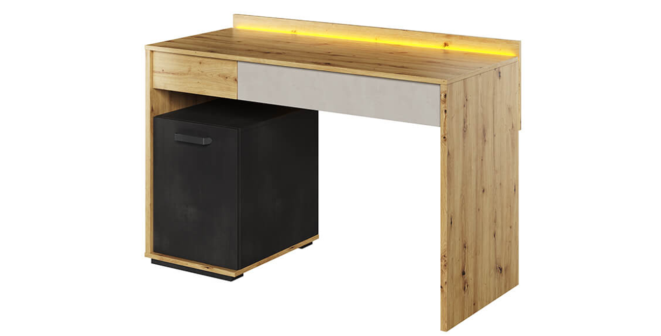 Der Schreibtisch zeichnet sich durch ein interessantes Design aus - geometrische Form, unter den Korpus gesteckte Fronten und drei Farben - Grau-, Holz- und Rohstahldekore schaffen ein einzigartiges kubistisches Patchwork. Der moderne Charakter des Korpus wird zusätzlich durch formschöne Metallgriffe und niedrige Stützen betont. Das Set beinhaltet eine LED-Beleuchtung.