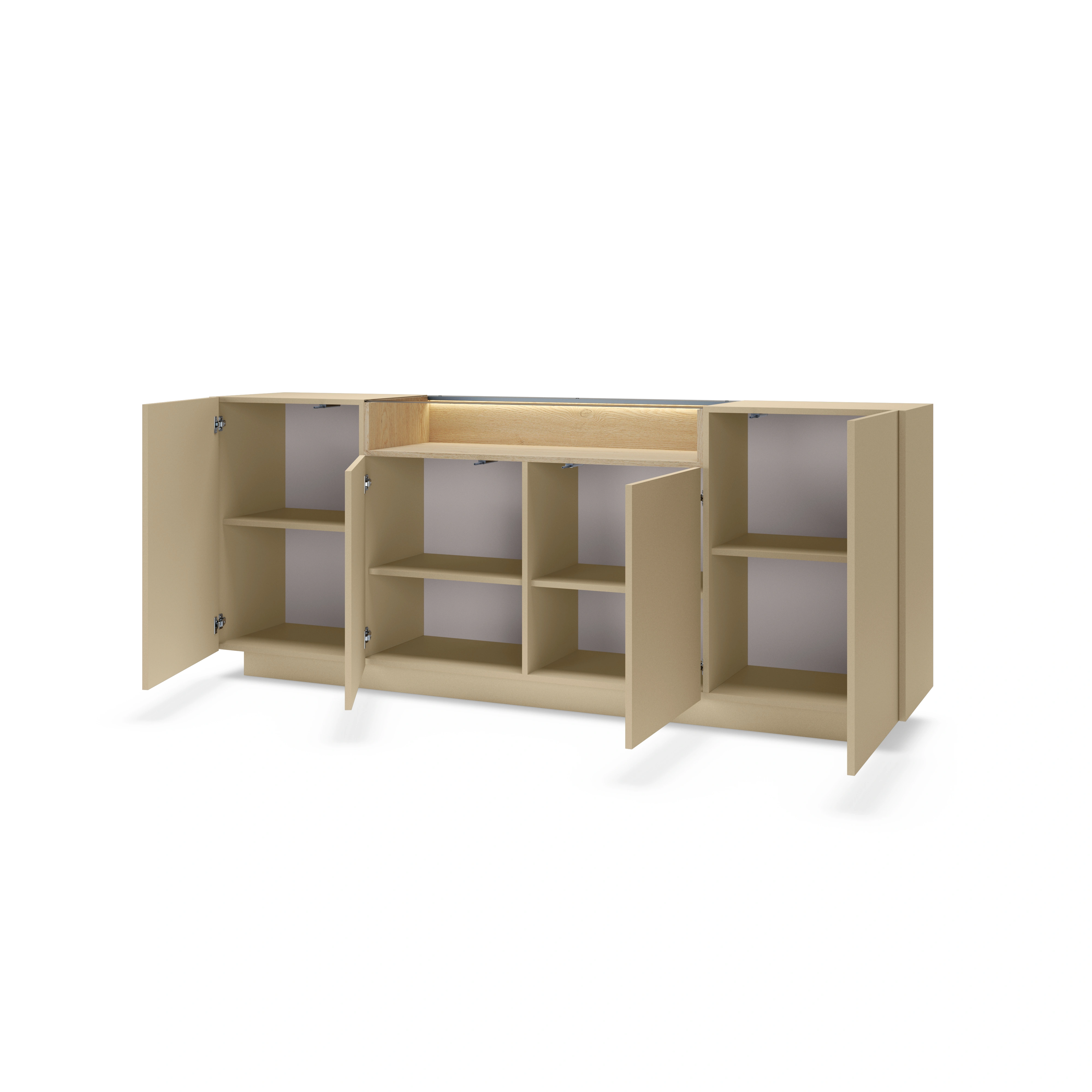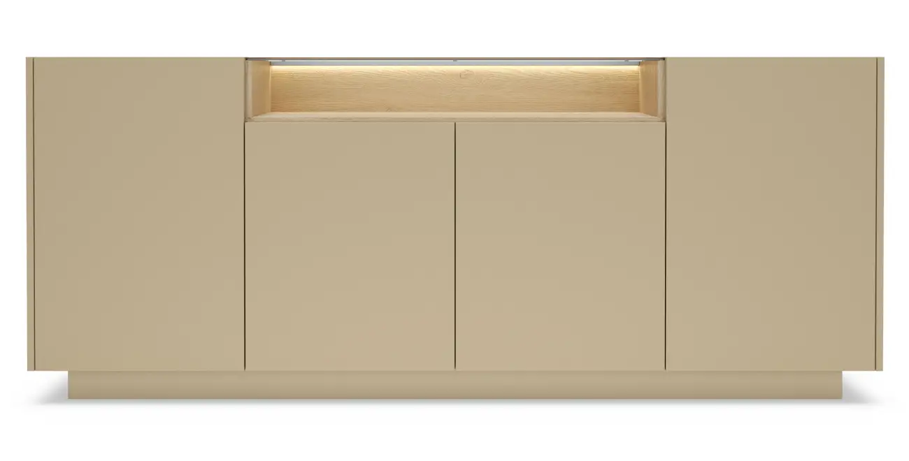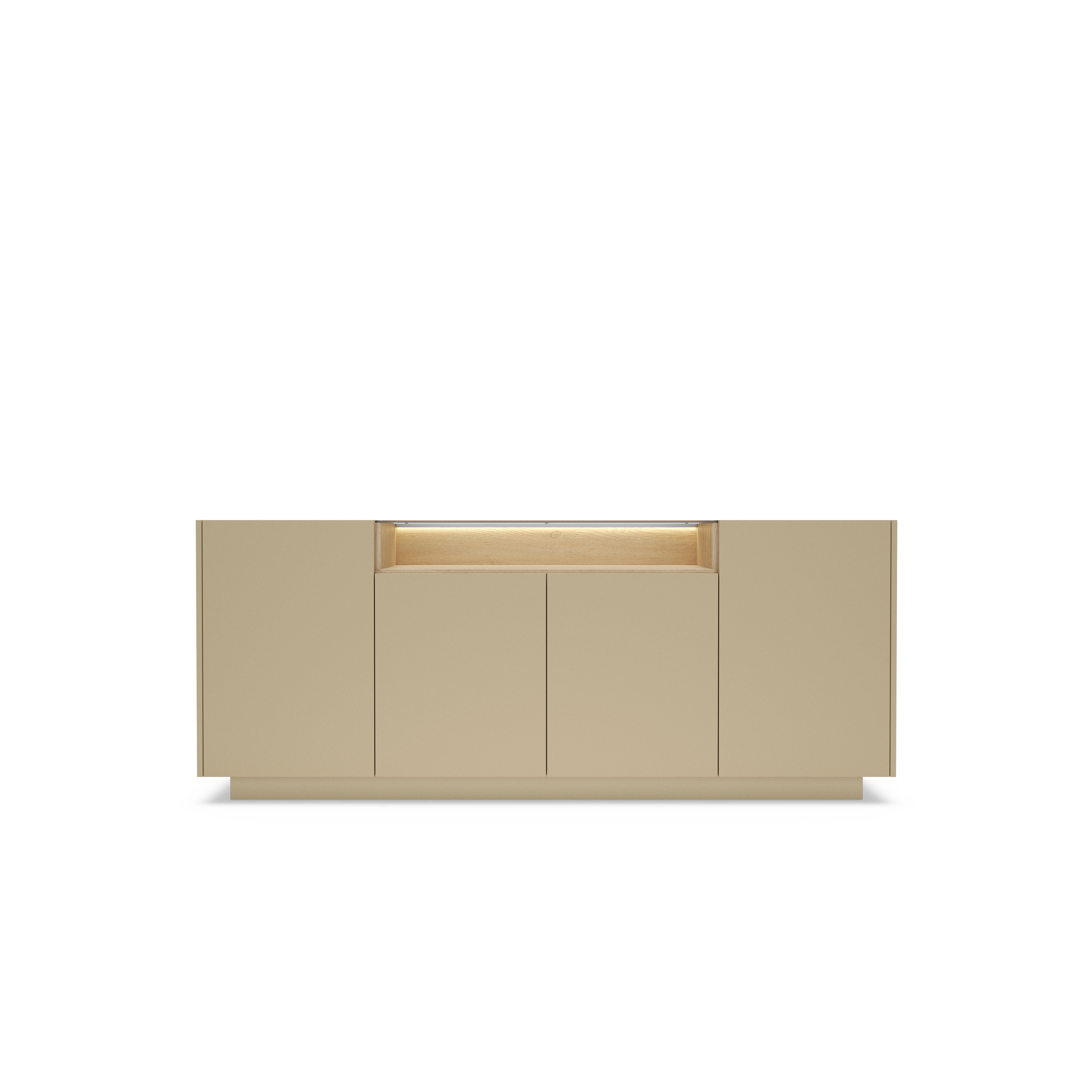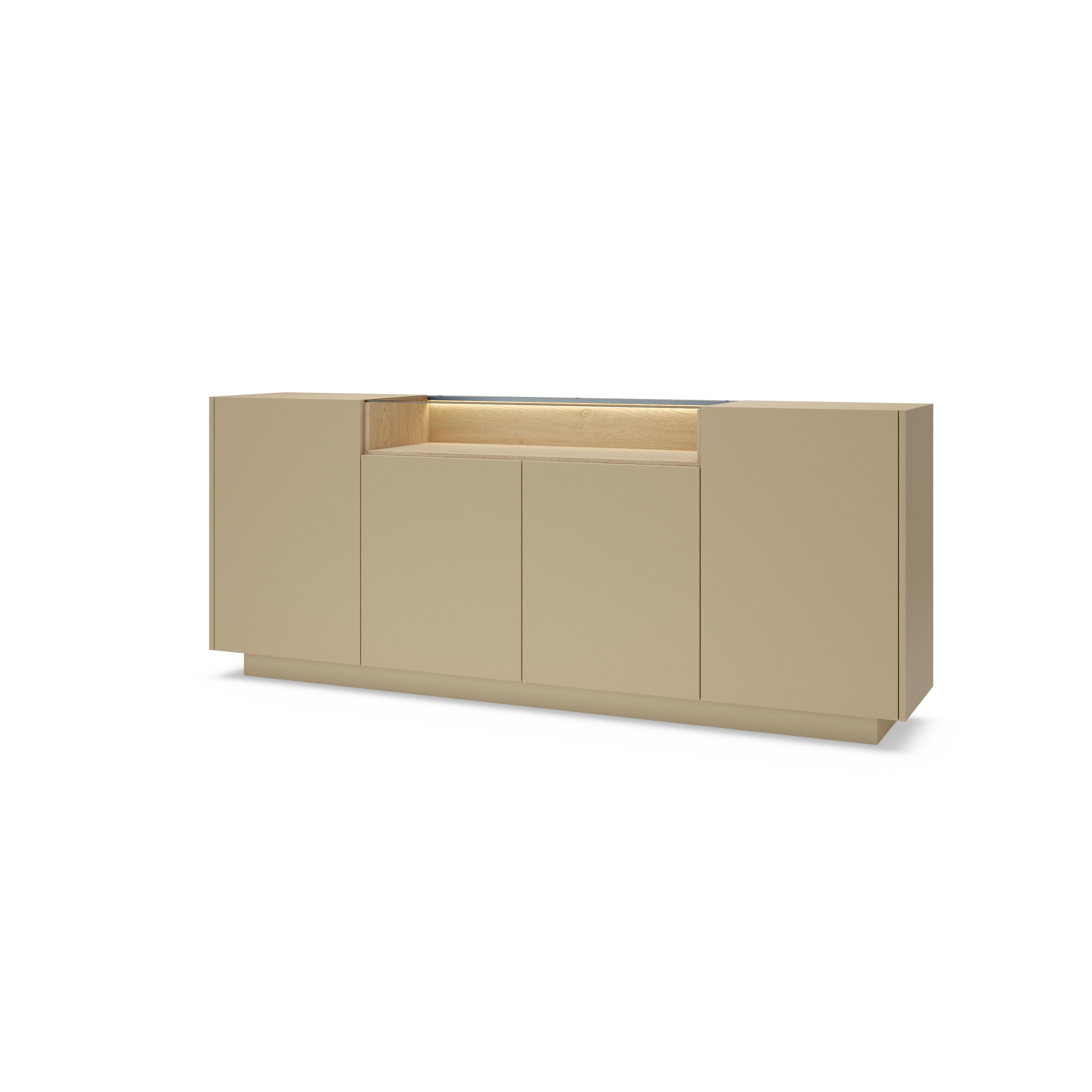 Das Sideboard HIRO B ist das ideale Möbelstück für alle, die viel Platz benötigen und dabei nicht auf stilvolles Design verzichten möchten. Mit einer beeindruckenden Breite von 203 cm bietet diese 4-türige Kommode enormen Stauraum. Die grifflosen Fronten in sanftem Beige harmonieren perfekt mit dem Korpus in Kakao und Eiche Cremona. Ein mittig platzierter, offener Bereich mit einer braunen Hartglasablage wird durch das integrierte LED-Licht zum leuchtenden Blickfang Ihres Wohnzimmers.