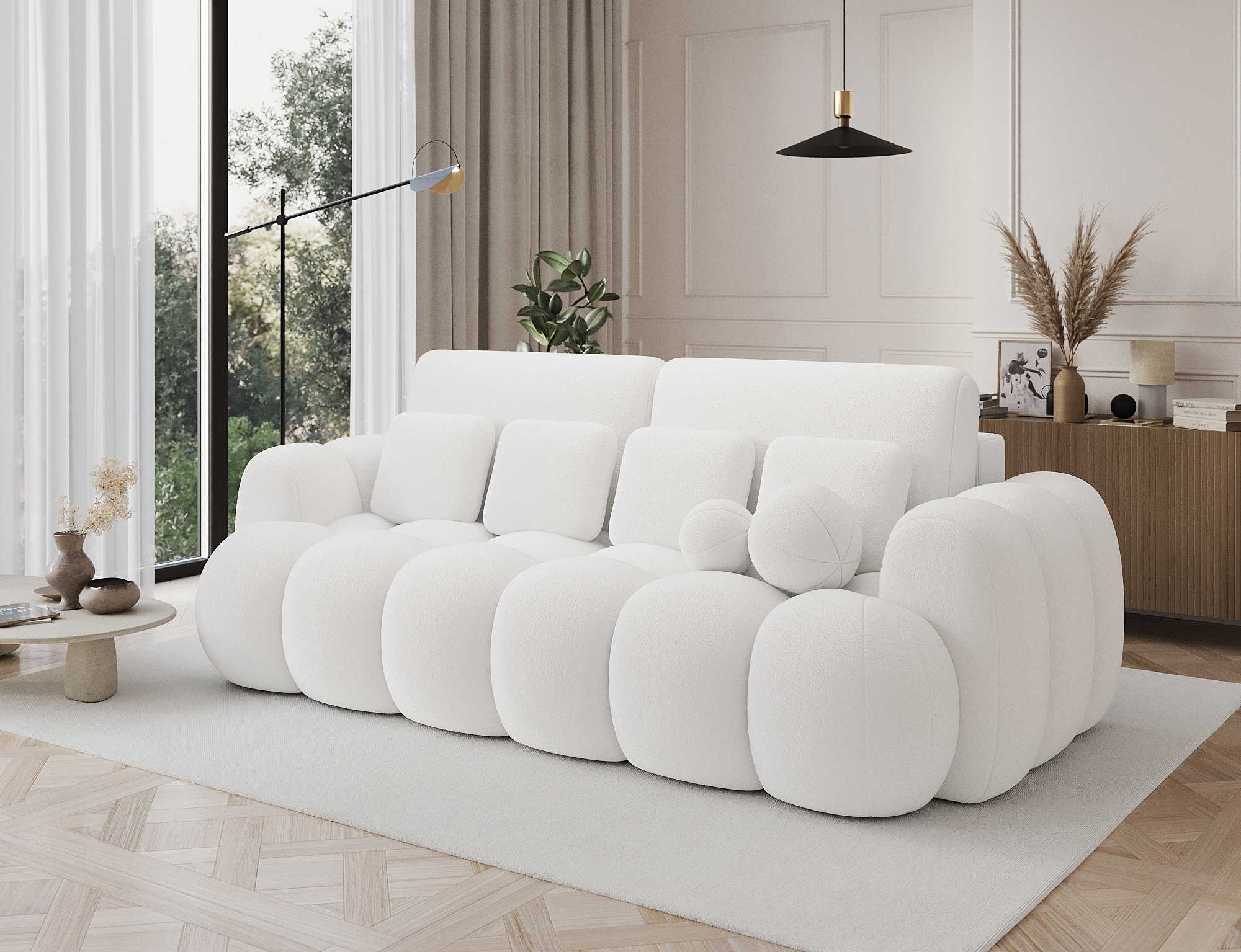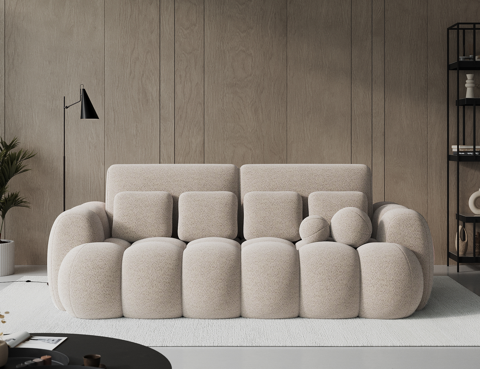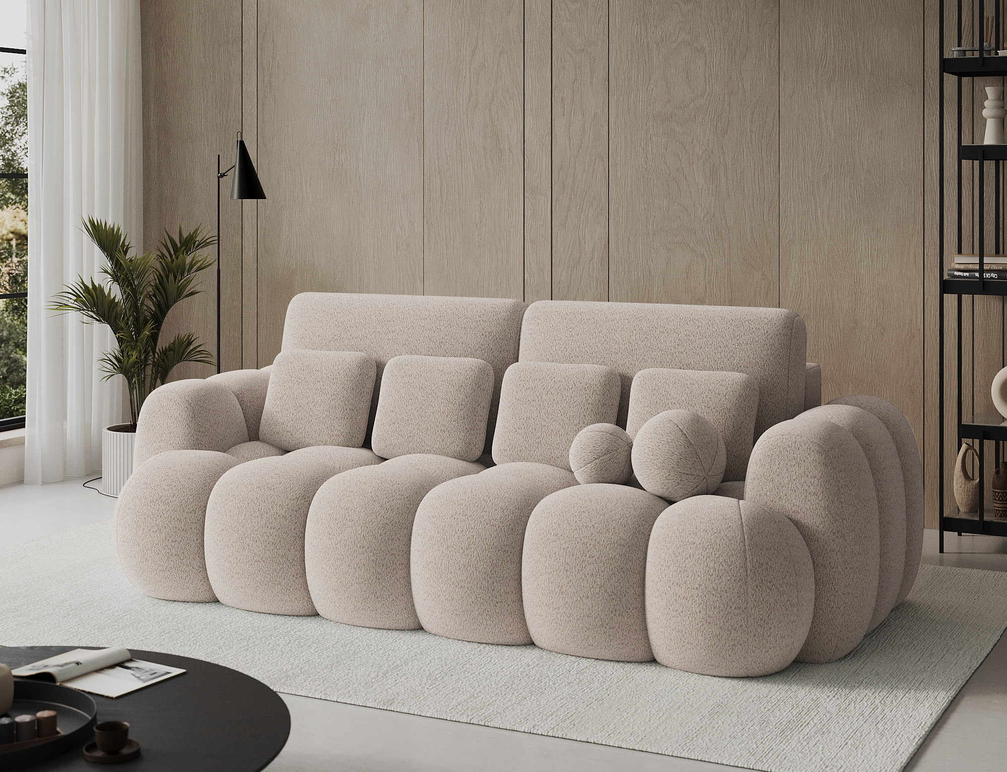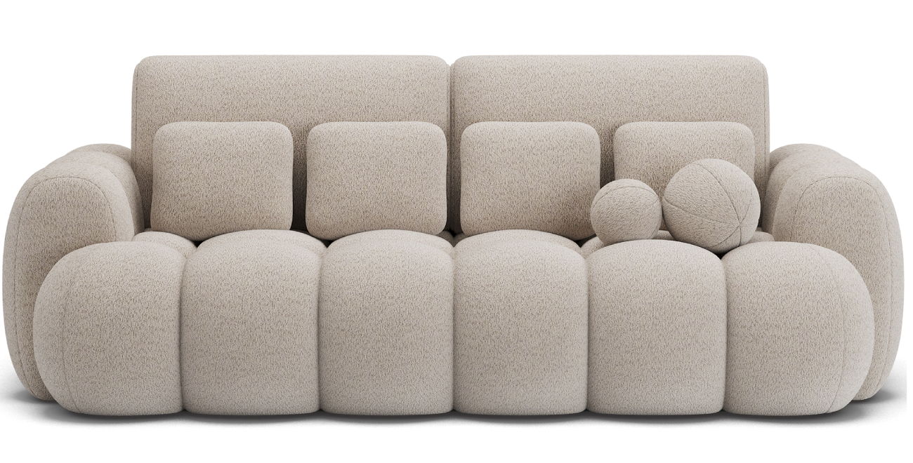Das Sofa Cotonn mit den Maßen 256 x 105 x 119 cm ist ein modernes Sofa mit Schlaffunktion und Bettkasten, das elegantes Design mit außergewöhnlichem Komfort verbindet. Die Sitzfläche ist mit einer gewellten Feder des Typs B und den Schaumstoffen HR3030 und T2315 gefüllt, die sowohl beim Sitzen als auch beim Schlafen einen hervorragenden Halt und Komfort bieten. Dank des Dolphin-Mechanismus lässt sich das Sofa schnell und intuitiv aufklappen, und das geräumige Bettzeugfach ermöglicht die bequeme Aufbewahrung von Textilien. Das Sofa ist mit schwarzen Füßen aus strapazierfähigem Kunststoff ausgestattet und sieht mit seiner gepolsterten Rückenlehne auch in der Mitte des Raumes gut aus. Die mitgelieferten Zierkissen sorgen für Gemütlichkeit und unterstreichen den modernen Charakter des Möbels. Cotonn ist ein idealer Vorschlag für alle, die ein stilvolles und funktionelles Sofa für das Wohnzimmer suchen, das Ästhetik, Zweckmäßigkeit und höchsten Entspannungskomfort miteinander verbindet.